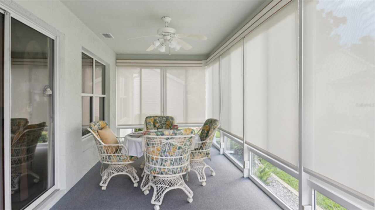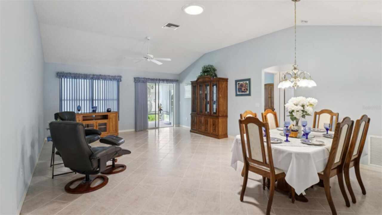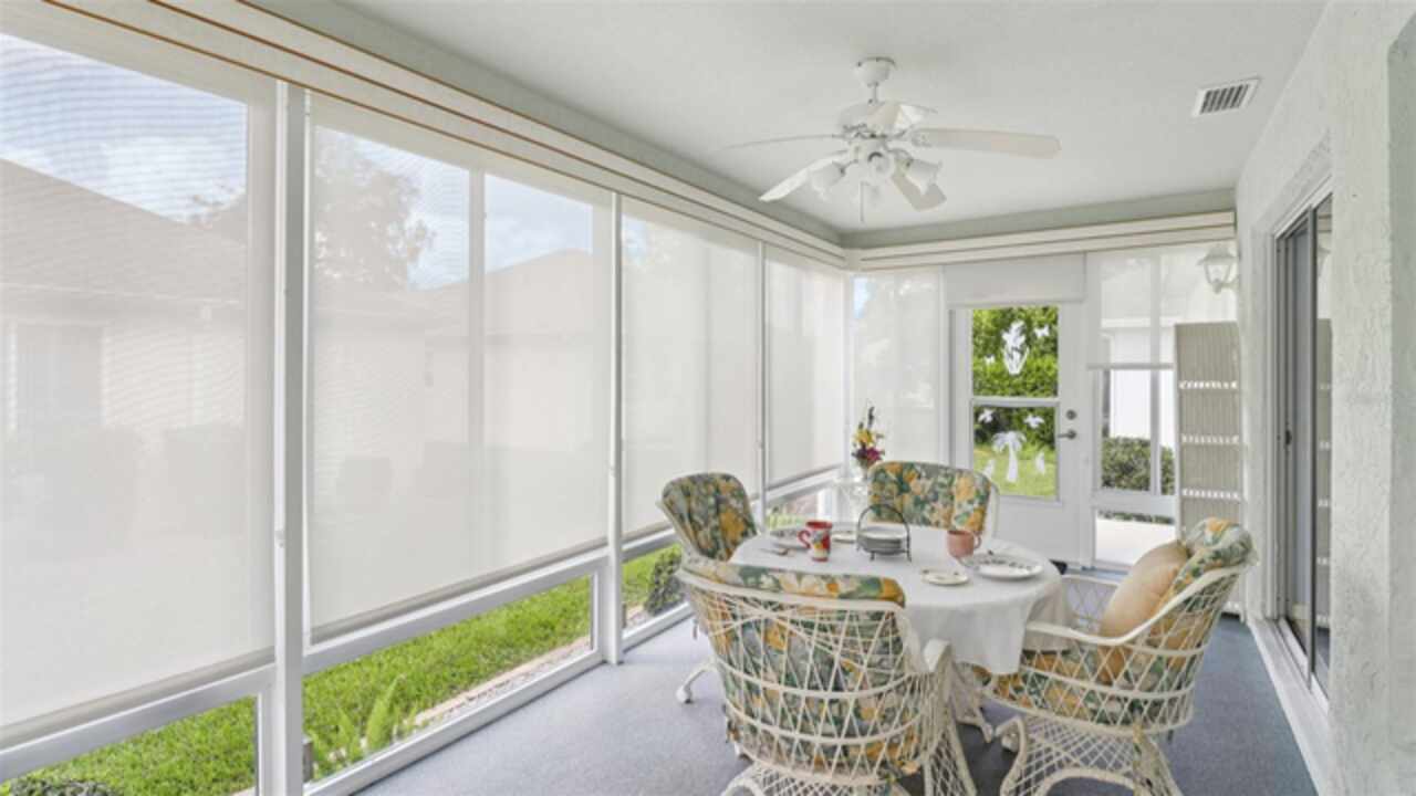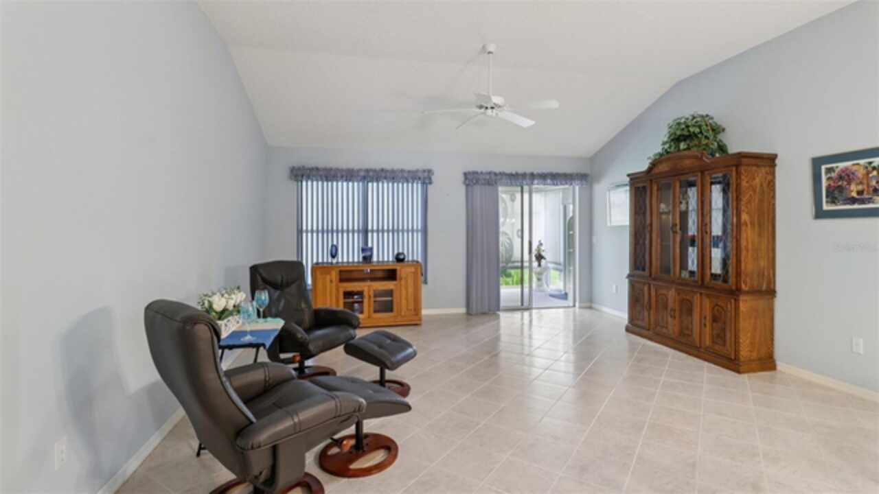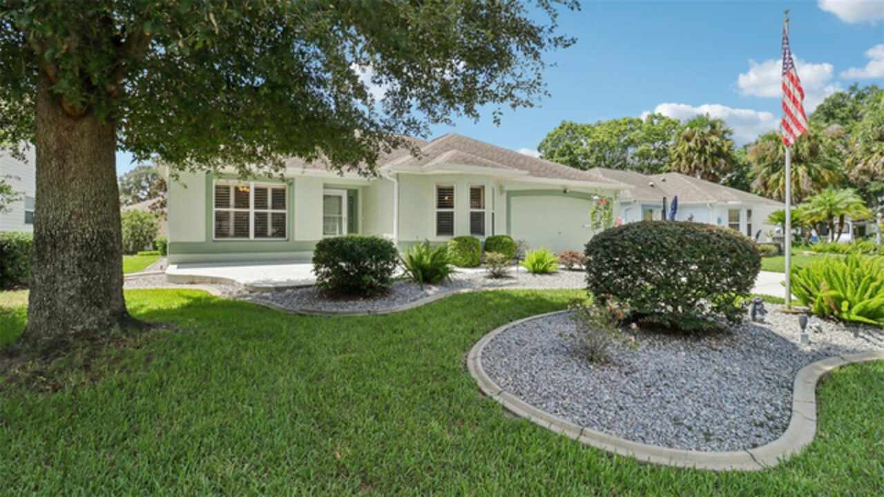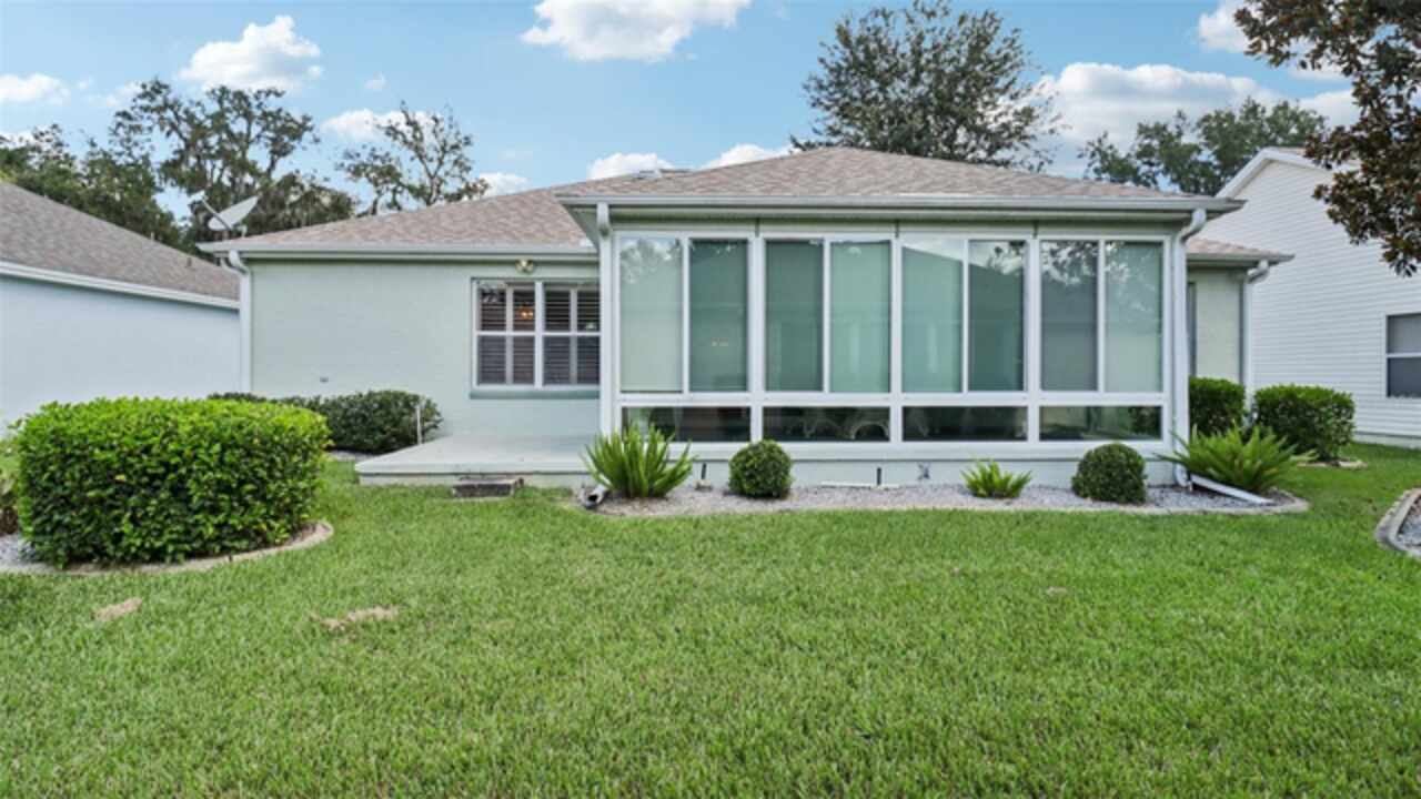 PRICE ADJUSTMENT on this charming 3-bedroom, 2-bath residence, nestled in the TRANQUIL Village of LA REYNALDA, offering the perfect blend of COMFORT and STYLE. Conveniently located a few blocks from CHULA VISTA REC CENTER and ADULT POOL, minutes from SPANISH SPRINGS TOWN SQUARE, and a 10 minute golf car ride to LAKE SUMTER LANDING. Upon entering La Reynalda you will be awed by the DOWN-HOME feeling, complimented by the mature landscaping. Arriving at the residence, you’ll notice the EXTRA- WIDE painted driveway, and the matching TERRACE welcoming you into the stunning STUCCO abode. Step inside to discover soft muted colors that lend themselves to the serenity and privacy provided by a SPLIT FLOORPLAN. The spacious living area features a high SCULPTED CEILING, beautiful ceramic tile flooring that also extends into the kitchen and bathrooms. Sliding doors lead into the lanai., VENTED FOR HEAT AND AIR and enclosed by vertical windows with custom shades. The kitchen features SOLID WOOD cabinets, a closet pantry, cultured MARBLE countertops with beveled edges , a convenient PASS THROUGH to the dining room, and a cozy breakfast nook featuring a bay window with PLANTATION SHUTTERS.. All three bedrooms boast LVP flooring and plantation shutters, adding elegance and durability. The master suite is a true retreat with an ensuite bath and ample closet space. Other improvements include; ROOF in 07/2024, WATER HEATER in 03/2016, WASHER in 11/2023, and REFRIGERATOR in 05/2021, HVAC 2024. This home truly has it all! Come see it for yourself!