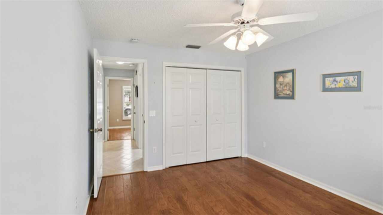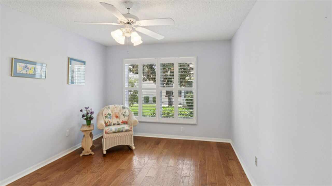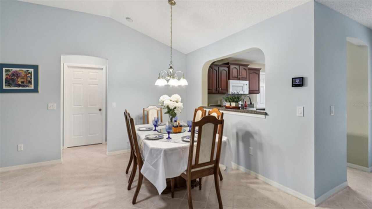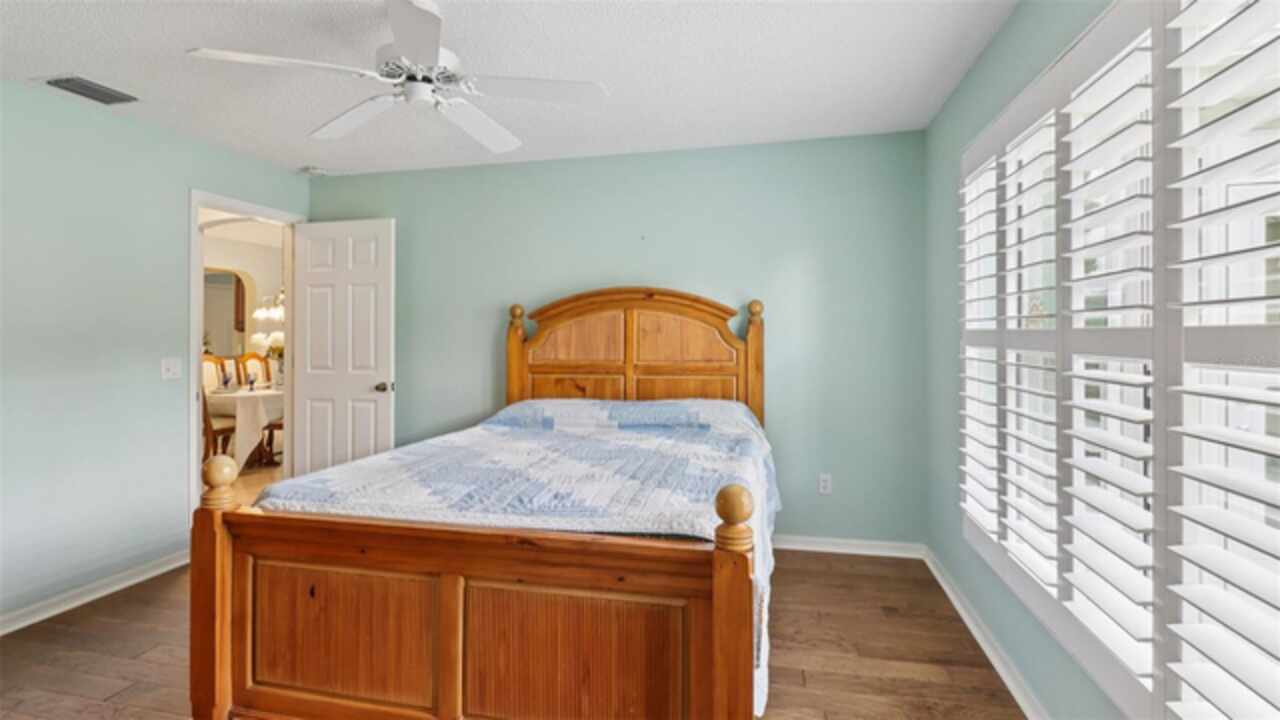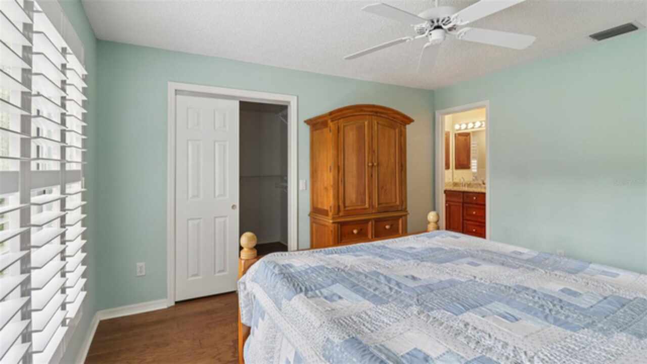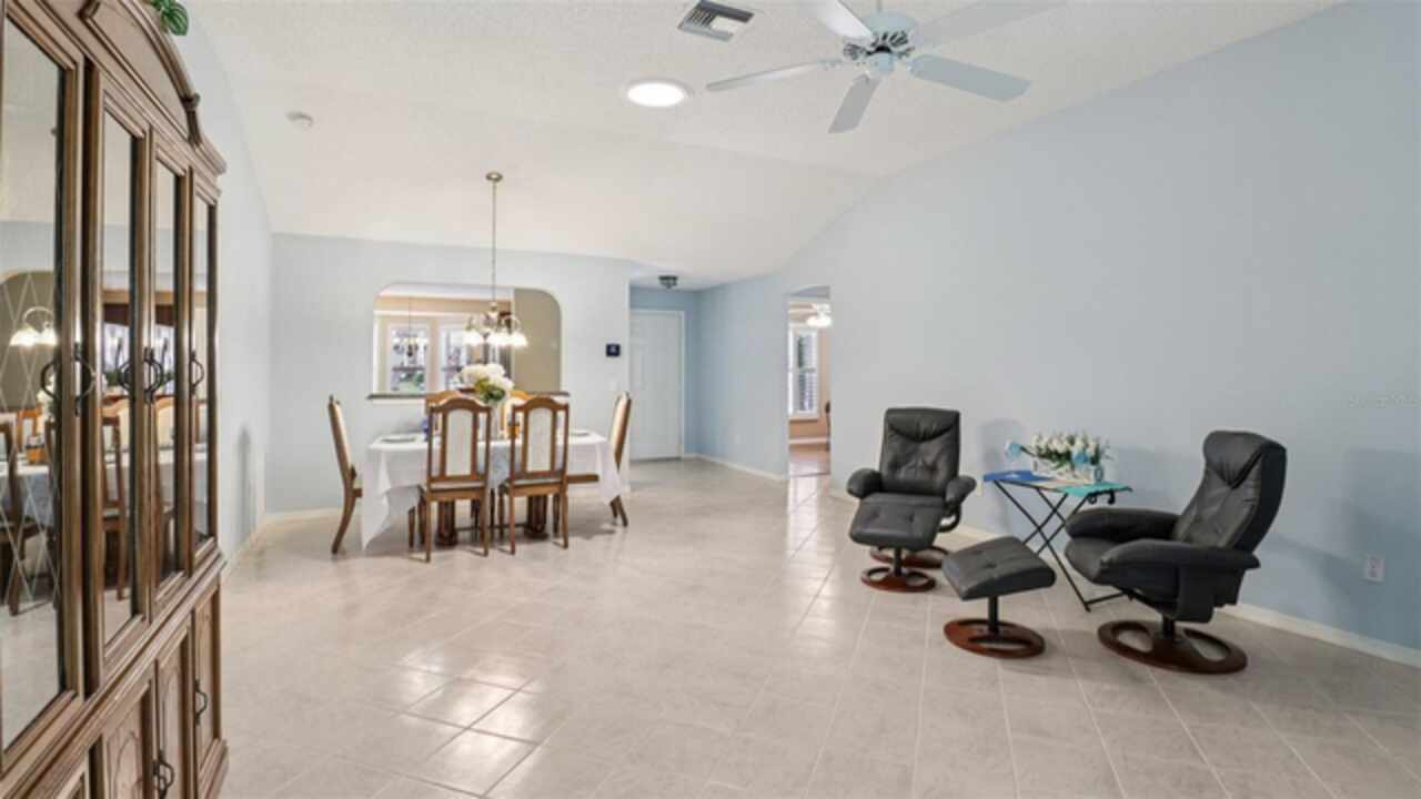 PRICE ADJUSTMENT on this charming 3-bedroom, 2-bath residence, nestled in the TRANQUIL Village of LA REYNALDA, offering the perfect blend of COMFORT and STYLE. Conveniently located a few blocks from CHULA VISTA REC CENTER and ADULT POOL, minutes from SPANISH SPRINGS TOWN SQUARE, and a 10 minute golf car ride to LAKE SUMTER LANDING. Upon entering La Reynalda you will be awed by the DOWN-HOME feeling, complimented by the mature landscaping. Arriving at the residence, you’ll notice the EXTRA- WIDE painted driveway, and the matching TERRACE welcoming you into the stunning STUCCO abode. Step inside to discover soft muted colors that lend themselves to the serenity and privacy provided by a SPLIT FLOORPLAN. The spacious living area features a high SCULPTED CEILING, beautiful ceramic tile flooring that also extends into the kitchen and bathrooms. Sliding doors lead into the lanai., VENTED FOR HEAT AND AIR and enclosed by vertical windows with custom shades. The kitchen features SOLID WOOD cabinets, a closet pantry, cultured MARBLE countertops with beveled edges , a convenient PASS THROUGH to the dining room, and a cozy breakfast nook featuring a bay window with PLANTATION SHUTTERS.. All three bedrooms boast LVP flooring and plantation shutters, adding elegance and durability. The master suite is a true retreat with an ensuite bath and ample closet space. Other improvements include; ROOF in 07/2024, WATER HEATER in 03/2016, WASHER in 11/2023, and REFRIGERATOR in 05/2021, HVAC 2024. This home truly has it all! Come see it for yourself!