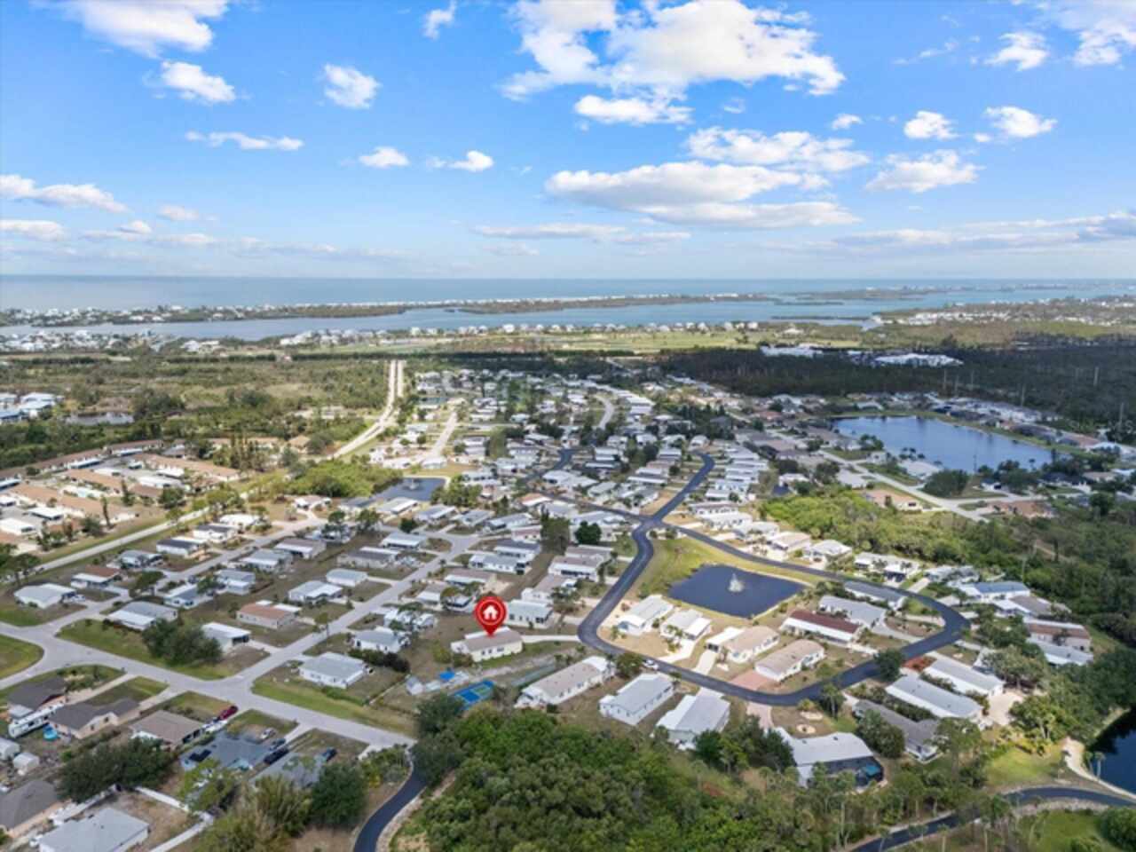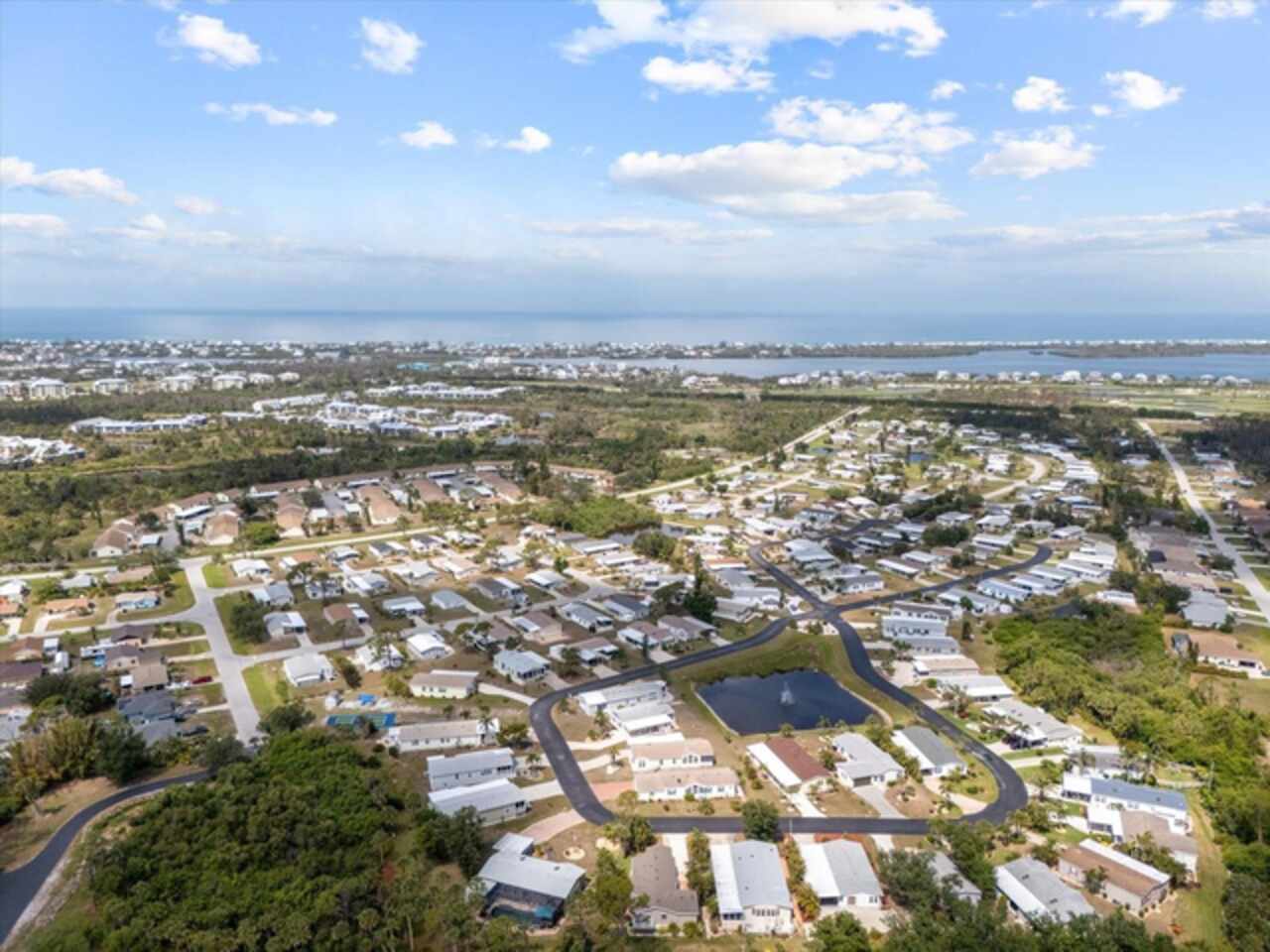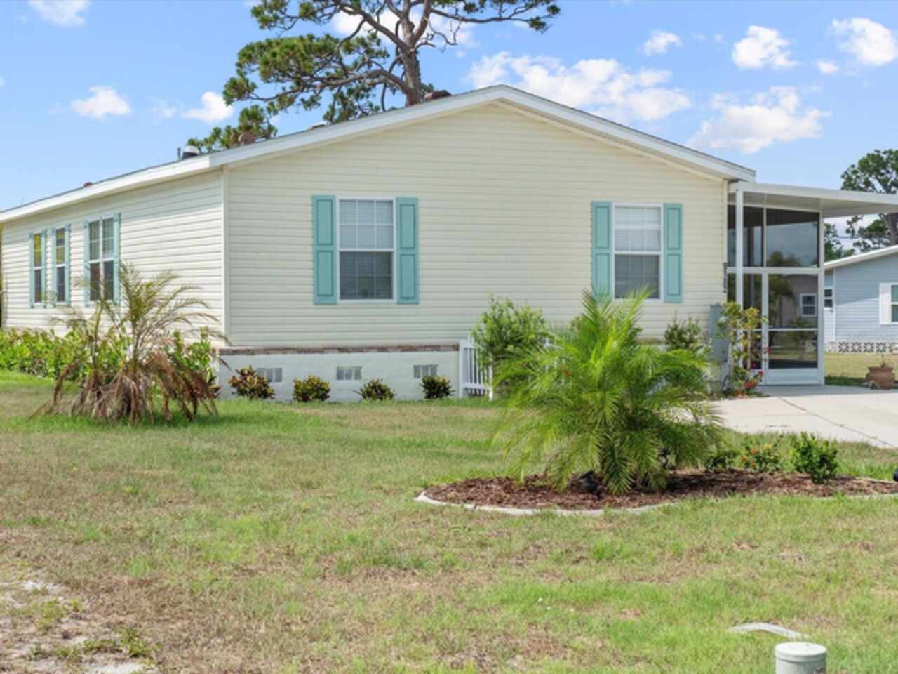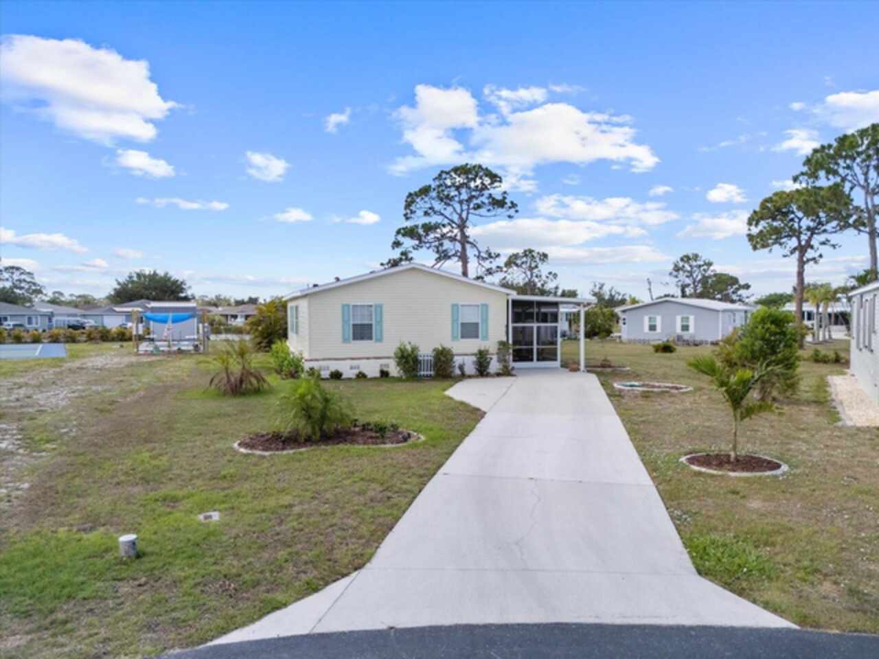 Welcome to 9182 Pinehaven Way, a well-maintained and thoughtfully updated manufactured home located in the highly desirable 55+ community of The Pines at Sandalhaven in Englewood, Florida. This home sits on a curved corner lot, offering extra privacy with only one neighboring house and a vacant lot to the left currently used for shuffleboard and pickleball. This open space not only gives added distance from other homes but also enhances your view and overall sense of peace. Situated outside of a flood zone and connected to public water and sewer, this property offers both convenience and peace of mind. Low HOA fees cover reserves, community pool and pool maintenance, grounds upkeep, and professional management—and the community is pet-friendly! Curb appeal abounds with an oversized driveway and a screened-in front lanai, the perfect place to enjoy your morning coffee or unwind in the evening. For sun-lovers, there’s also a small backyard balcony and unscreened patio, giving you space to relax and enjoy Florida’s warmth. Inside, you’ll find over 1, 500 square feet of living space with a bright, open layout. The dining and living areas flow together effortlessly, while the galley kitchen features a built-in pantry and room for a cozy breakfast nook. A convenient laundry closet is tucked away at the end of the hall. This rare split-bedroom floor plan includes three bedrooms and two full bathrooms. The spacious primary suite features two walk-in closets and a large ensuite bathroom complete with dual vanities, a walk-in shower, and a private water closet. One guest bedroom includes a built-in closet, and the oversized third bedroom—though without a closet—is large enough to accommodate a wardrobe or be used as a home office, den, or flex space. The guest bathroom includes a single vanity and a tub/shower combination. Many updates have been made in recent years, making this home move-in ready. In 2024, the sellers added a large screened-in side lanai, installed new kitchen flooring, added new lighting in the kitchen, bathroom, and one bedroom, installed a new bathroom faucet, and painted the interior walls. Fresh landscaping and a new trees were planted in 2024, followed by full yard sod and newly painted shutters in 2025. The HVAC system was also upgraded in 2025 with a brand-new compressor defender surge protector, new fan motor, and a heat-resistant heater for better efficiency and longevity. The Pines at Sandalhaven offers a clubhouse, pool, and organized community amenities. Located just minutes from Wildflower Preserve, Amberjack Environmental Park, Boca Grande Beach, Englewood Beach, local golf courses, restaurants, and shopping, this home offers the perfect combination of comfort, convenience, and a vibrant Florida lifestyle.