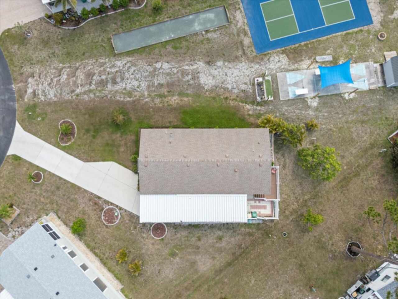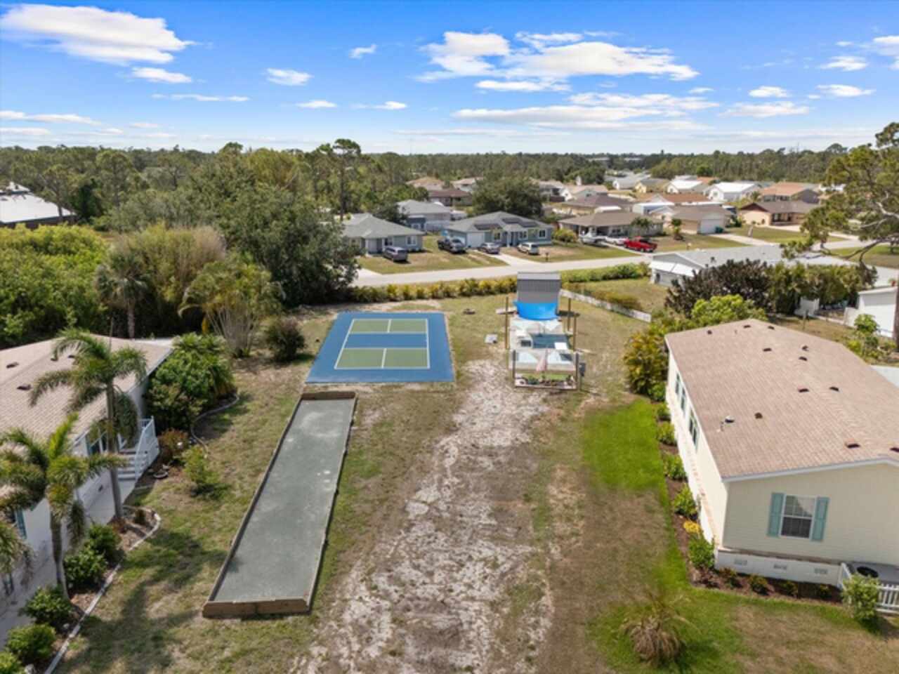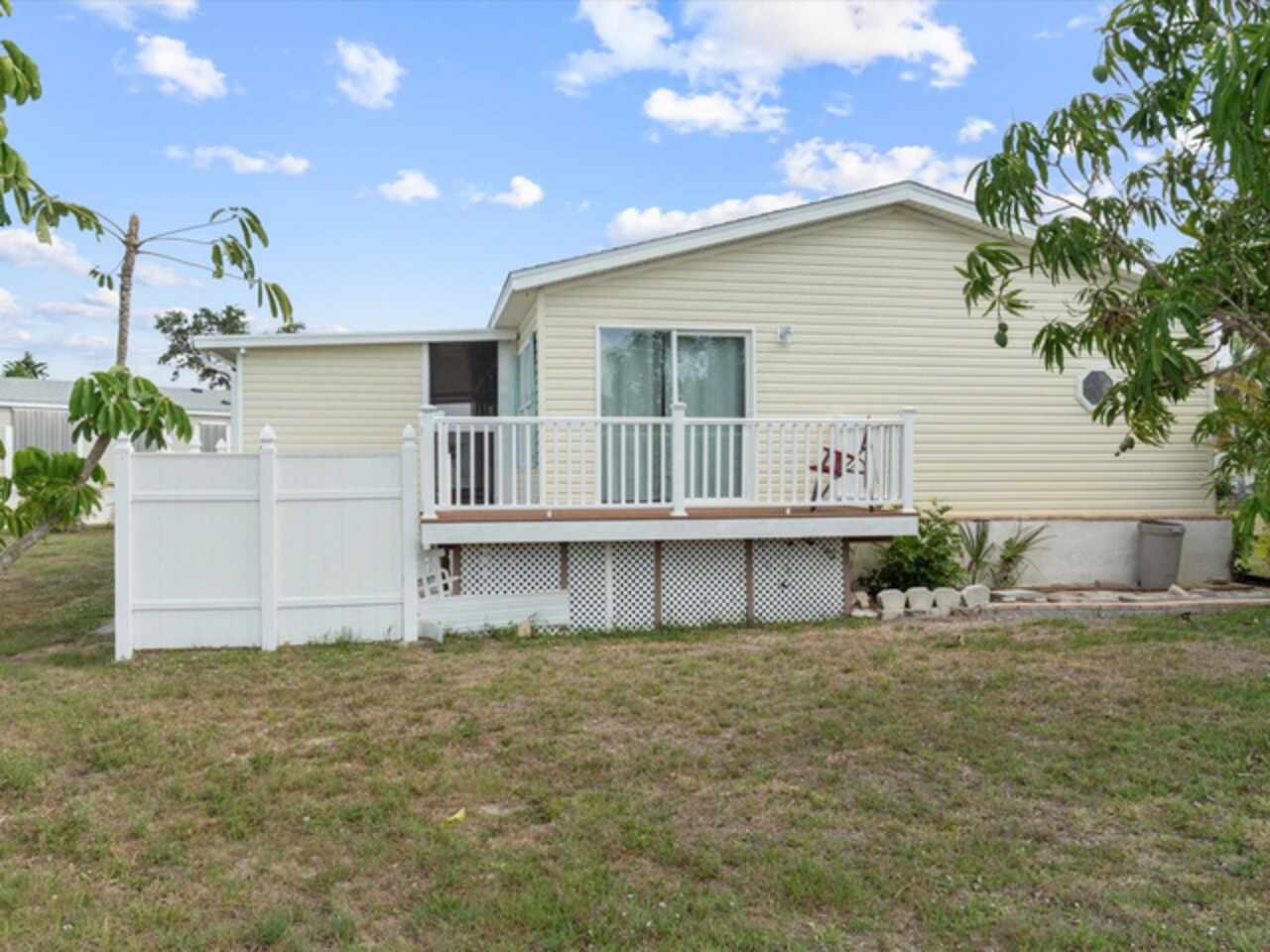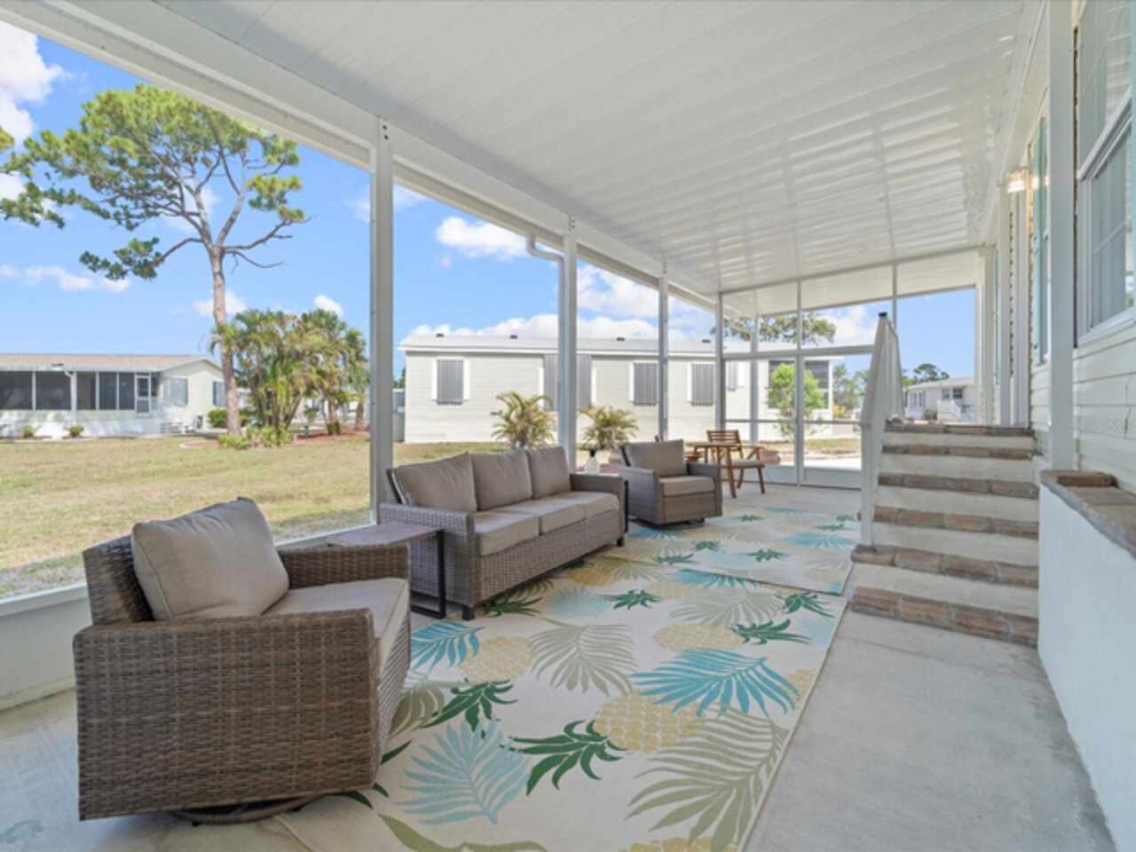 Welcome to 9182 Pinehaven Way, a well-maintained and thoughtfully updated manufactured home located in the highly desirable 55+ community of The Pines at Sandalhaven in Englewood, Florida. This home sits on a curved corner lot, offering extra privacy with only one neighboring house and a vacant lot to the left currently used for shuffleboard and pickleball. This open space not only gives added distance from other homes but also enhances your view and overall sense of peace. Situated outside of a flood zone and connected to public water and sewer, this property offers both convenience and peace of mind. Low HOA fees cover reserves, community pool and pool maintenance, grounds upkeep, and professional management—and the community is pet-friendly! Curb appeal abounds with an oversized driveway and a screened-in front lanai, the perfect place to enjoy your morning coffee or unwind in the evening. For sun-lovers, there’s also a small backyard balcony and unscreened patio, giving you space to relax and enjoy Florida’s warmth. Inside, you’ll find over 1, 500 square feet of living space with a bright, open layout. The dining and living areas flow together effortlessly, while the galley kitchen features a built-in pantry and room for a cozy breakfast nook. A convenient laundry closet is tucked away at the end of the hall. This rare split-bedroom floor plan includes three bedrooms and two full bathrooms. The spacious primary suite features two walk-in closets and a large ensuite bathroom complete with dual vanities, a walk-in shower, and a private water closet. One guest bedroom includes a built-in closet, and the oversized third bedroom—though without a closet—is large enough to accommodate a wardrobe or be used as a home office, den, or flex space. The guest bathroom includes a single vanity and a tub/shower combination. Many updates have been made in recent years, making this home move-in ready. In 2024, the sellers added a large screened-in side lanai, installed new kitchen flooring, added new lighting in the kitchen, bathroom, and one bedroom, installed a new bathroom faucet, and painted the interior walls. Fresh landscaping and a new trees were planted in 2024, followed by full yard sod and newly painted shutters in 2025. The HVAC system was also upgraded in 2025 with a brand-new compressor defender surge protector, new fan motor, and a heat-resistant heater for better efficiency and longevity. The Pines at Sandalhaven offers a clubhouse, pool, and organized community amenities. Located just minutes from Wildflower Preserve, Amberjack Environmental Park, Boca Grande Beach, Englewood Beach, local golf courses, restaurants, and shopping, this home offers the perfect combination of comfort, convenience, and a vibrant Florida lifestyle.