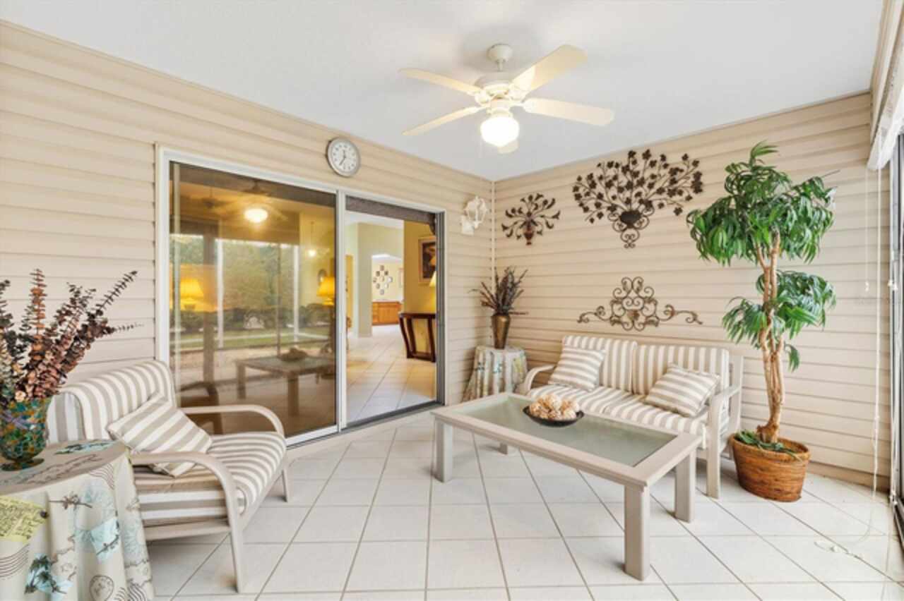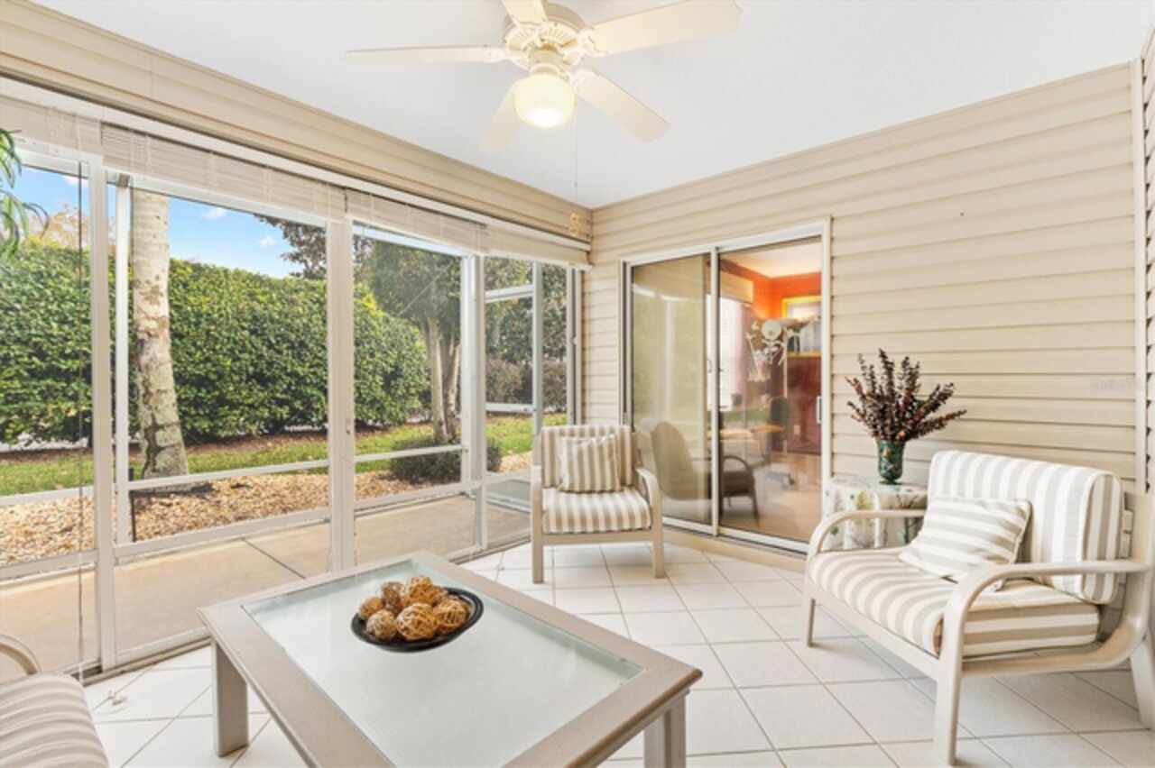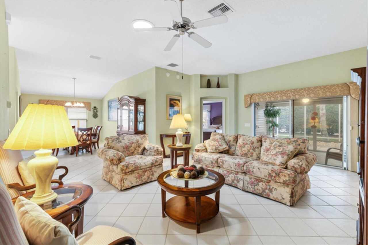 TURNKEY!LOW BOND Lovely 3/2 Cypress Designer home in the Village of Woodbury. Roof 2020, HVAC 2021 and Gas HWH 2002. This charming split floor plan features a covered front porch that invites you inside to discover ceramic tile flooring throughout. The eat-in kitchen is a highlight, boasting a breakfast bar, pantry, and convenient pull-out cabinet shelves. Enjoy casual dining while looking out the bay windows in kitchen or formal dining in the dining room. The spacious living room seamlessly connects to an enclosed lanai, which also provides access to the third bedroom. Sliding Doors in the Lanai lead to the back birdcage expanding your outdoor entertaining space. The master bedroom offers a large walk-in closet and an ensuite bath with dual split vanities, a built-in makeup table, and a shower with a built-in bench, ensuring comfort and style. The two guest bedrooms share a bath with a shower-tub combo, making this home ideal for family and guests. The third bedroom is currently set up as an office. Additional features that make this one special are: phantom screen door, interior laundry, coat closet, electric roll down garage screen, ceiling fans, solar tube in living room and guest bath, and cornices on all the windows adding to the home's charm and functionality. Just ½ mile to the Springdale Pool. Mulberry Regional Rec Center and Mulberry Grove Plaza Shopping Center for activities, dining, and shopping are just minutes away. Short golf cart ride to Spanish Springs and Lake Sumter Landing town squares. Call today to schedule your private showing and start living The Villages dream.