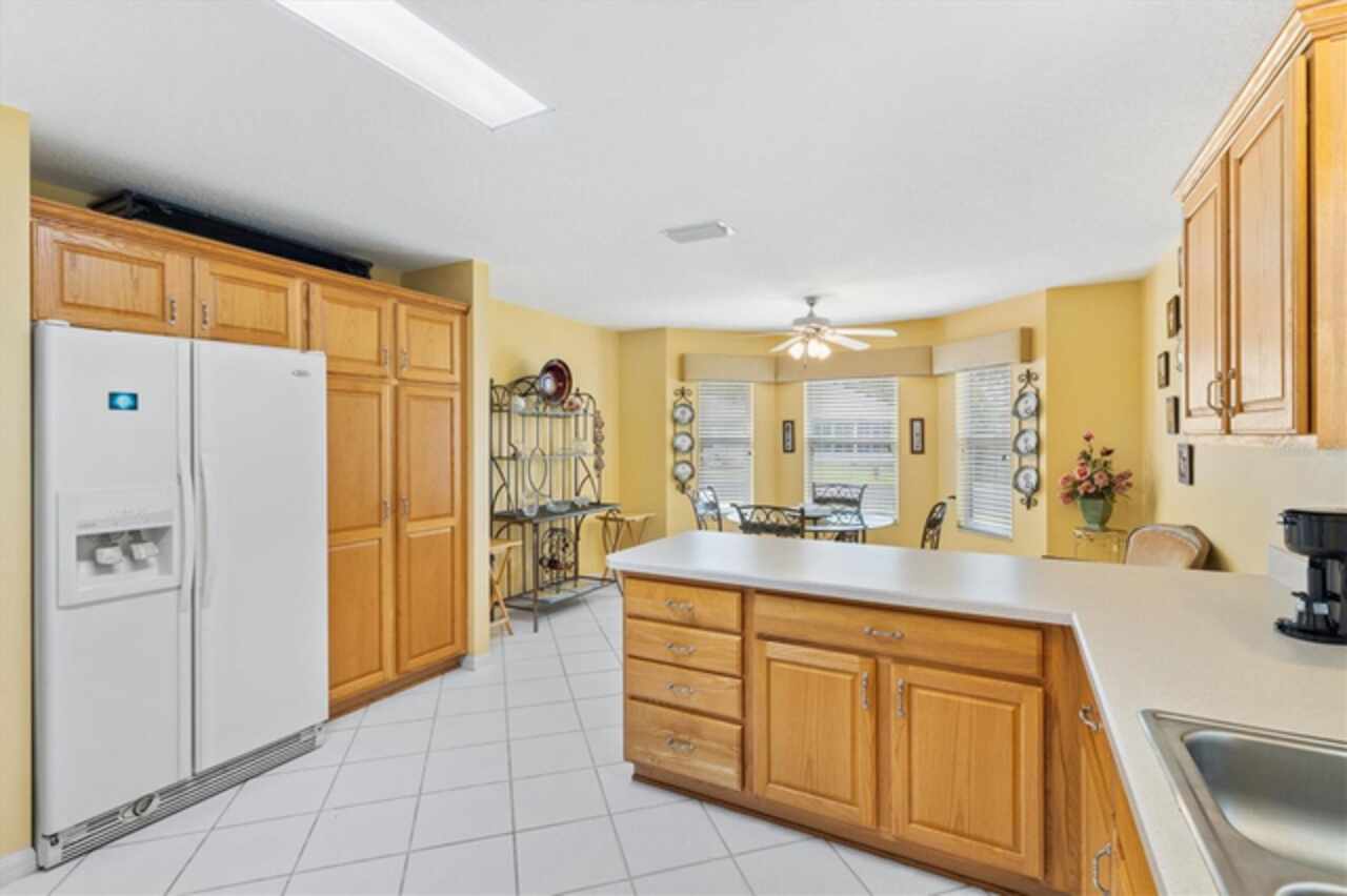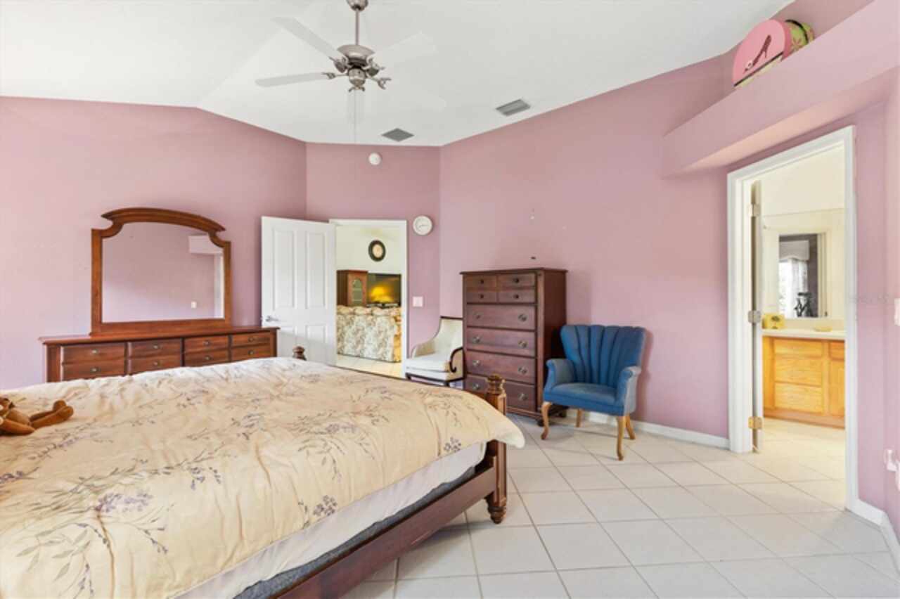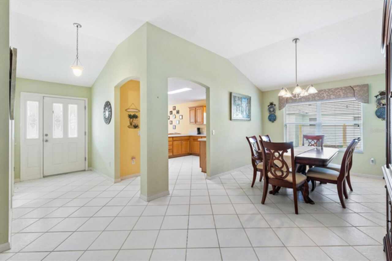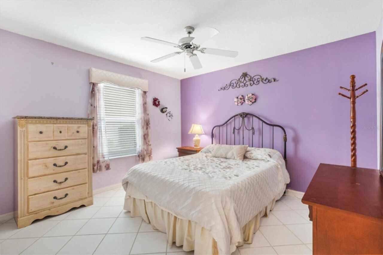 TURNKEY!LOW BOND Lovely 3/2 Cypress Designer home in the Village of Woodbury. Roof 2020, HVAC 2021 and Gas HWH 2002. This charming split floor plan features a covered front porch that invites you inside to discover ceramic tile flooring throughout. The eat-in kitchen is a highlight, boasting a breakfast bar, pantry, and convenient pull-out cabinet shelves. Enjoy casual dining while looking out the bay windows in kitchen or formal dining in the dining room. The spacious living room seamlessly connects to an enclosed lanai, which also provides access to the third bedroom. Sliding Doors in the Lanai lead to the back birdcage expanding your outdoor entertaining space. The master bedroom offers a large walk-in closet and an ensuite bath with dual split vanities, a built-in makeup table, and a shower with a built-in bench, ensuring comfort and style. The two guest bedrooms share a bath with a shower-tub combo, making this home ideal for family and guests. The third bedroom is currently set up as an office. Additional features that make this one special are: phantom screen door, interior laundry, coat closet, electric roll down garage screen, ceiling fans, solar tube in living room and guest bath, and cornices on all the windows adding to the home's charm and functionality. Just ½ mile to the Springdale Pool. Mulberry Regional Rec Center and Mulberry Grove Plaza Shopping Center for activities, dining, and shopping are just minutes away. Short golf cart ride to Spanish Springs and Lake Sumter Landing town squares. Call today to schedule your private showing and start living The Villages dream.