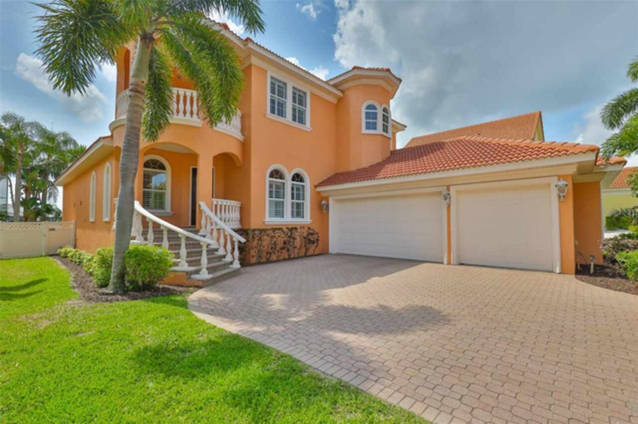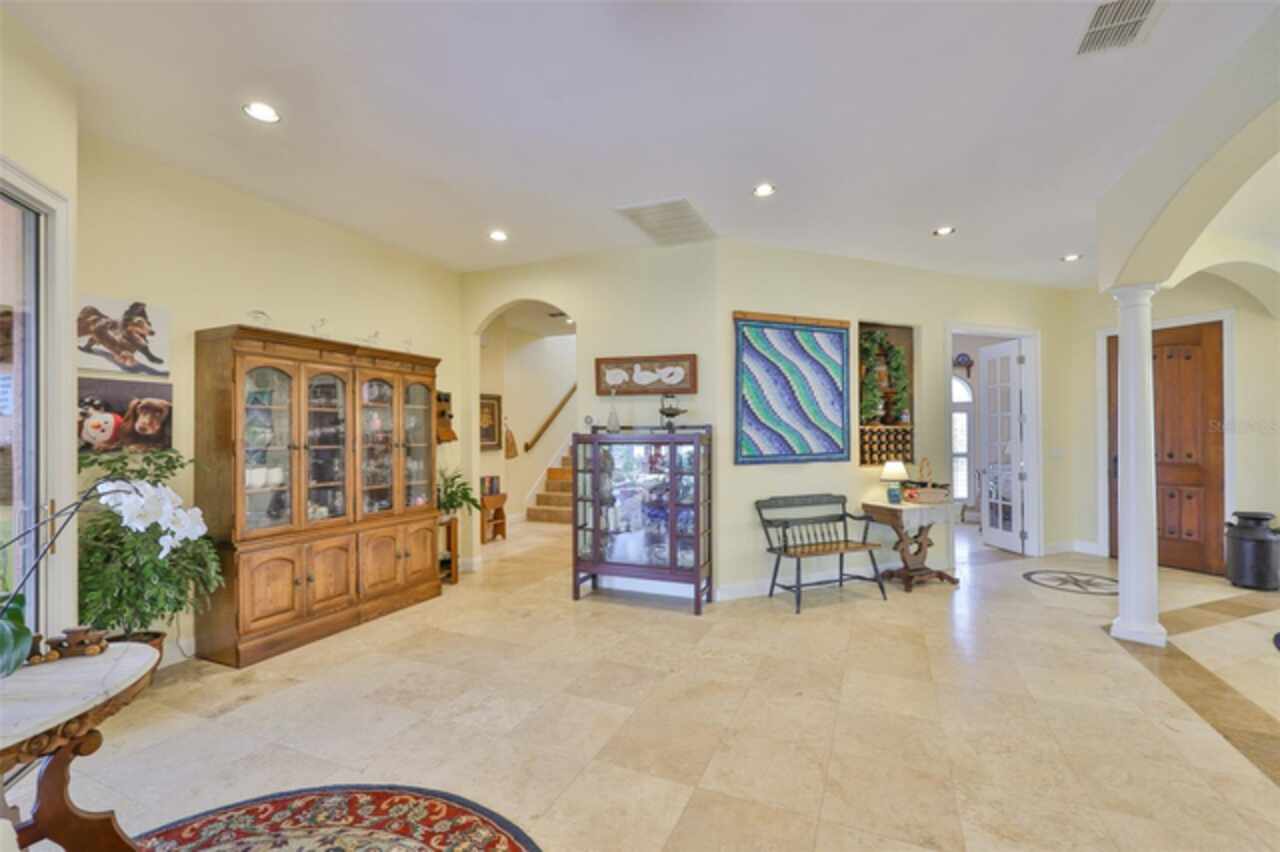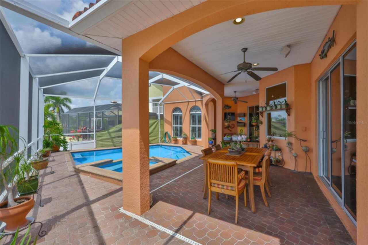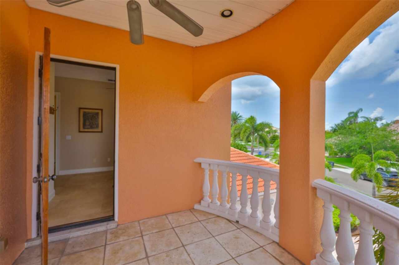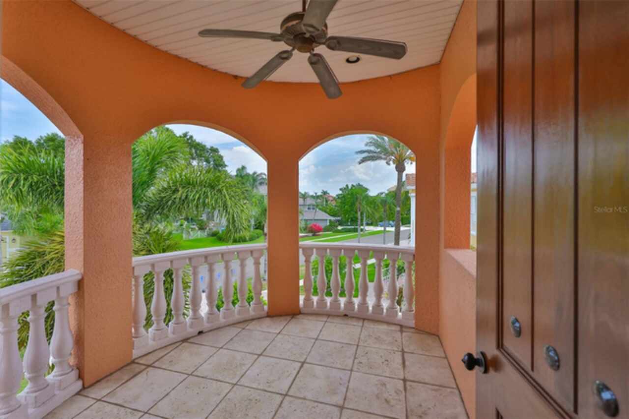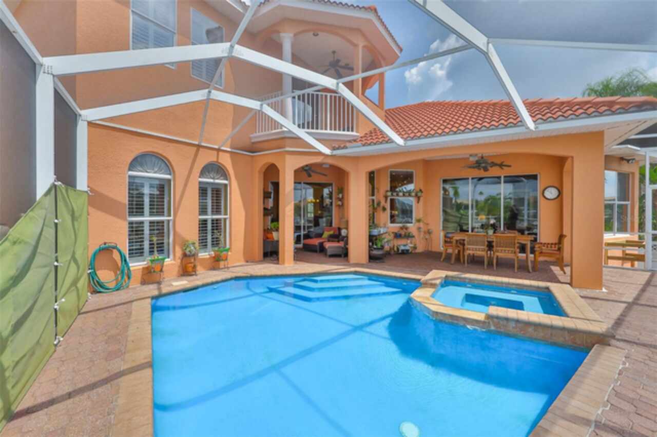 Welcome to your dream home in the prestigious Symphony Isles community! This breathtaking waterfront residence boasts a castle-like curb appeal, featuring Spanish tile accents, a grand baluster staircase, and an elegant balcony that exudes timeless charm. Step inside to discover a spacious, open floor plan adorned with gorgeous travertine floors throughout. Elegant columns and plantation shutters enhance the light-filled interiors, creating a sophisticated and inviting atmosphere. The formal living and dining areas are perfect for entertaining, complemented by an adjacent bar with a sink for effortless hosting. The large chef's kitchen is a culinary masterpiece, equipped with maple wood cabinets, granite countertops, a generous island with a sink, and stainless steel appliances with two full size ovens, gas stove, and large walk-in pantry. The family room offers stunning bay windows and sliding doors that open to the covered lanai and pool deck, ideal for indoor-outdoor living and enjoying Florida's beautiful weather. The downstairs master suite features tray ceilings, expansive walk-in closets, and a spa-inspired bathroom with a garden tub and a stand-up shower - your private retreat. For added convenience, a full-size elevator provides easy access to all floors. Upstairs, you'll find a spacious bonus room with a balcony, perfect for a home theater, gym, or additional living space. Three sizable bedrooms with Jack and Jill bathrooms, one with access to a private balcony, offer comfort and privacy for family and guests. Relax outdoors on your private lanai, complete with a sparkling pool and heated spa, perfect for unwinding or entertaining. The newer deck area with an outdoor grill makes outdoor dining and gatherings a breeze. Bring your sailboat or large vessel, Symphony Isles offers deep canals and private docks to accommodate your boating lifestyle. Enjoy the community's exclusive amenities, including private roads, 24/7 manned gate access, a private beach, swimming pool, clubhouse, and playgrounds, everything you need for a luxurious and active Florida lifestyle. Don't miss the opportunity to own this extraordinary waterfront estate, schedule your private tour today!