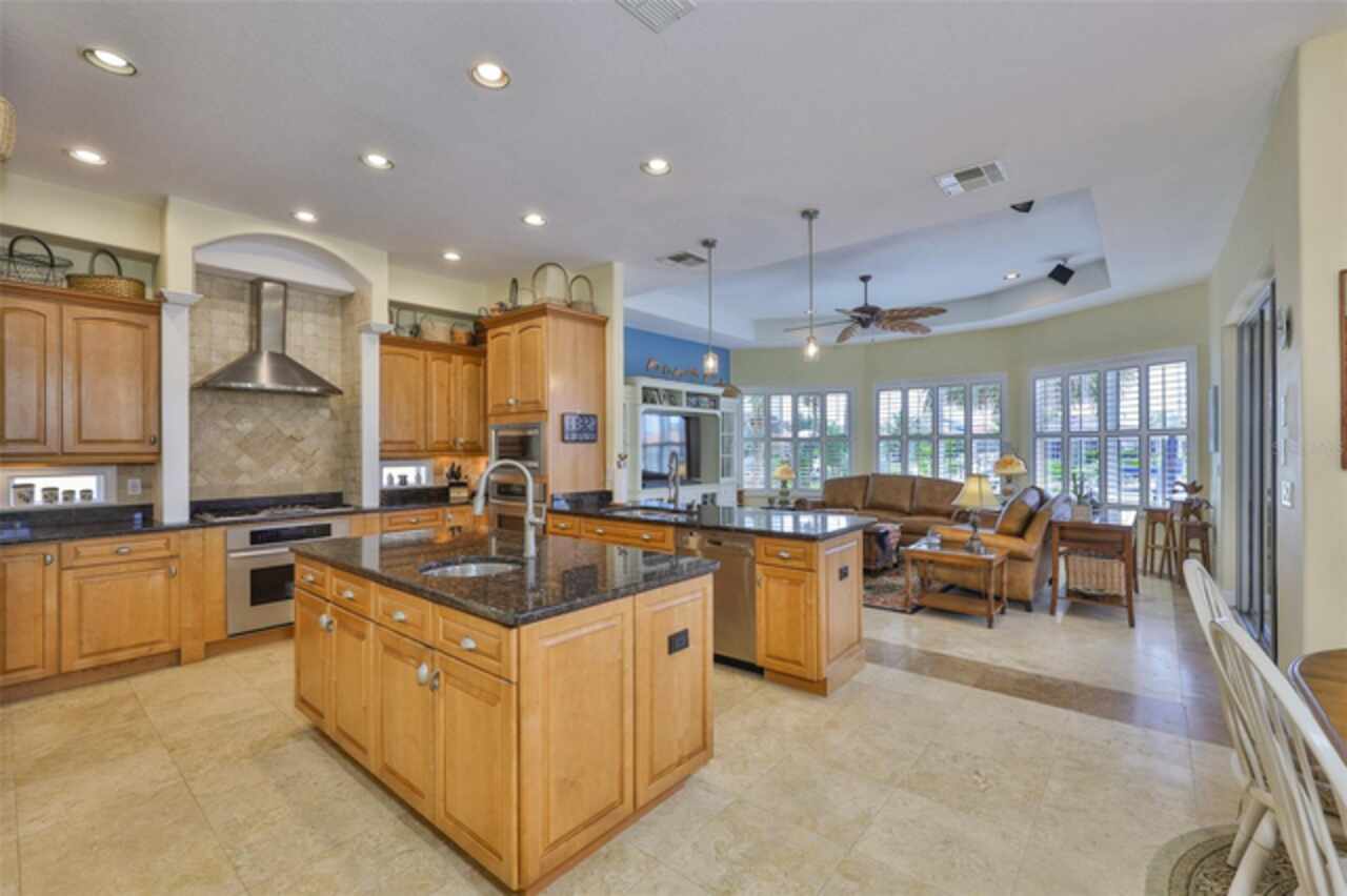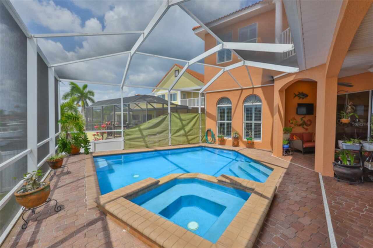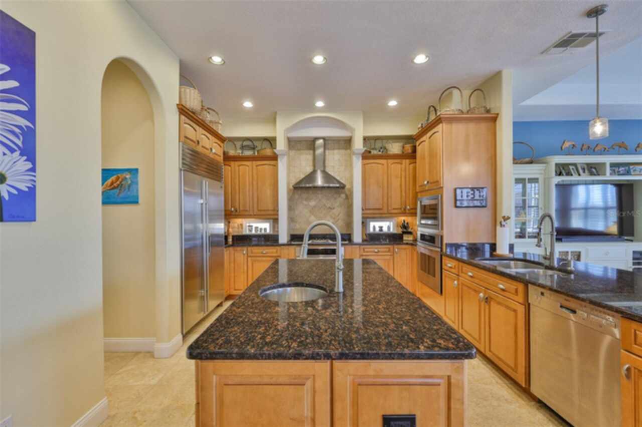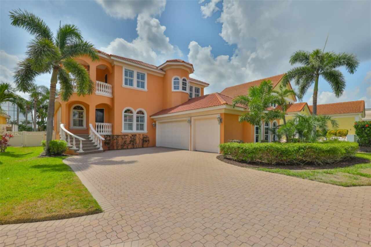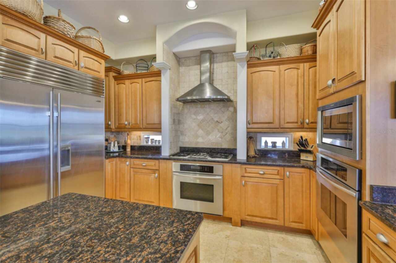 Welcome to your dream home in the prestigious Symphony Isles community! This breathtaking waterfront residence boasts a castle-like curb appeal, featuring Spanish tile accents, a grand baluster staircase, and an elegant balcony that exudes timeless charm. Step inside to discover a spacious, open floor plan adorned with gorgeous travertine floors throughout. Elegant columns and plantation shutters enhance the light-filled interiors, creating a sophisticated and inviting atmosphere. The formal living and dining areas are perfect for entertaining, complemented by an adjacent bar with a sink for effortless hosting. The large chef's kitchen is a culinary masterpiece, equipped with maple wood cabinets, granite countertops, a generous island with a sink, and stainless steel appliances with two full size ovens, gas stove, and large walk-in pantry. The family room offers stunning bay windows and sliding doors that open to the covered lanai and pool deck, ideal for indoor-outdoor living and enjoying Florida's beautiful weather. The downstairs master suite features tray ceilings, expansive walk-in closets, and a spa-inspired bathroom with a garden tub and a stand-up shower - your private retreat. For added convenience, a full-size elevator provides easy access to all floors. Upstairs, you'll find a spacious bonus room with a balcony, perfect for a home theater, gym, or additional living space. Three sizable bedrooms with Jack and Jill bathrooms, one with access to a private balcony, offer comfort and privacy for family and guests. Relax outdoors on your private lanai, complete with a sparkling pool and heated spa, perfect for unwinding or entertaining. The newer deck area with an outdoor grill makes outdoor dining and gatherings a breeze. Bring your sailboat or large vessel, Symphony Isles offers deep canals and private docks to accommodate your boating lifestyle. Enjoy the community's exclusive amenities, including private roads, 24/7 manned gate access, a private beach, swimming pool, clubhouse, and playgrounds, everything you need for a luxurious and active Florida lifestyle. Don't miss the opportunity to own this extraordinary waterfront estate, schedule your private tour today!