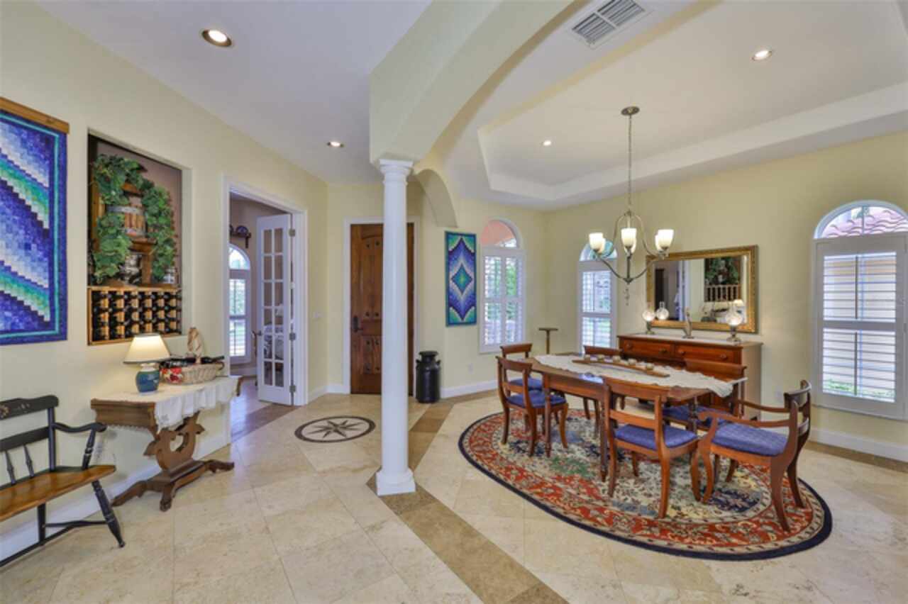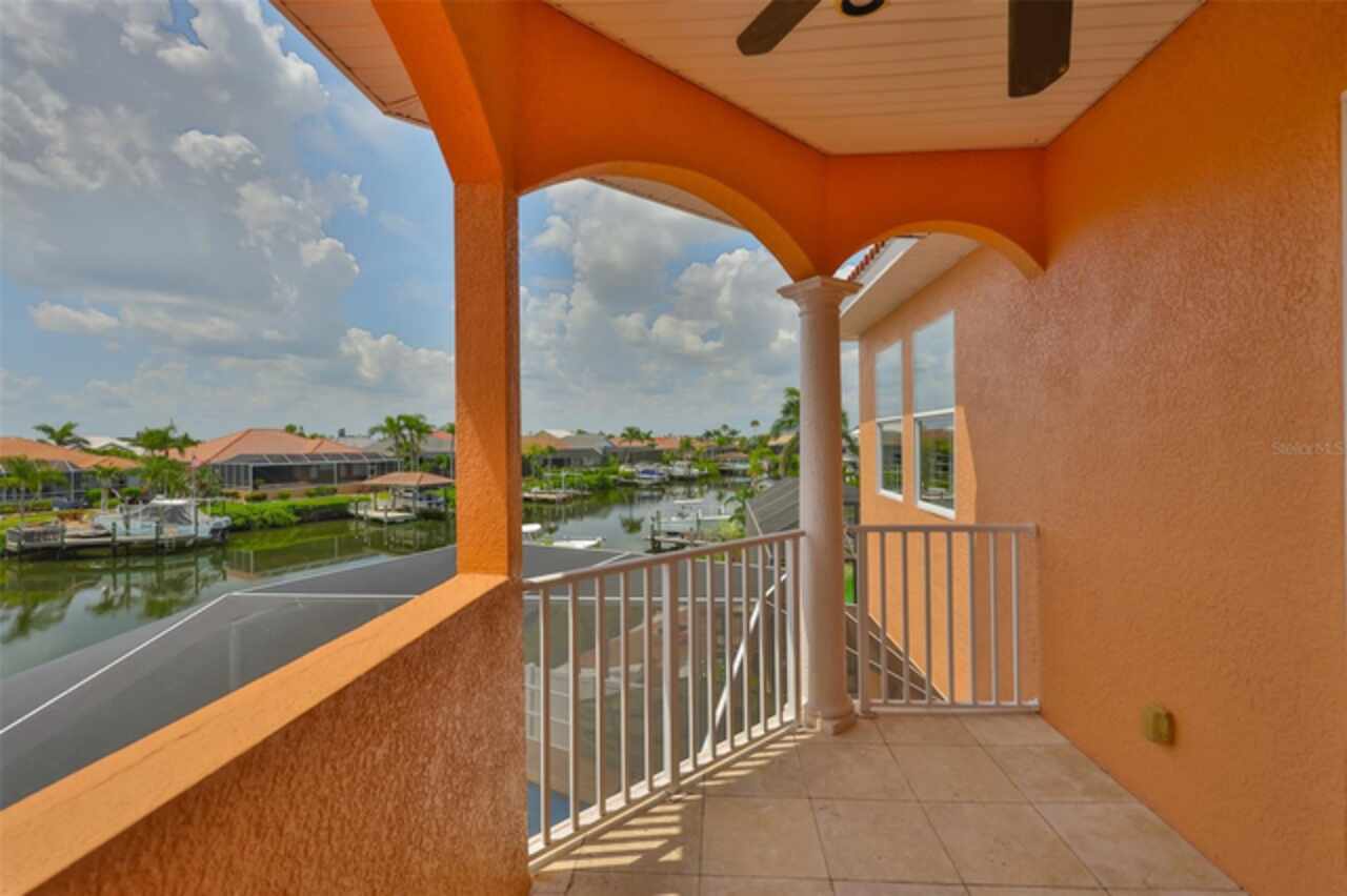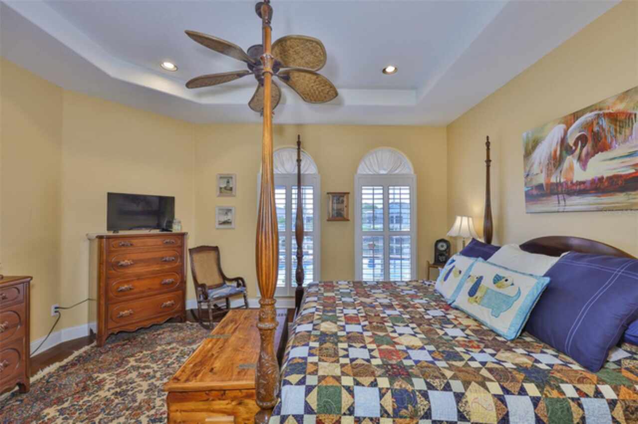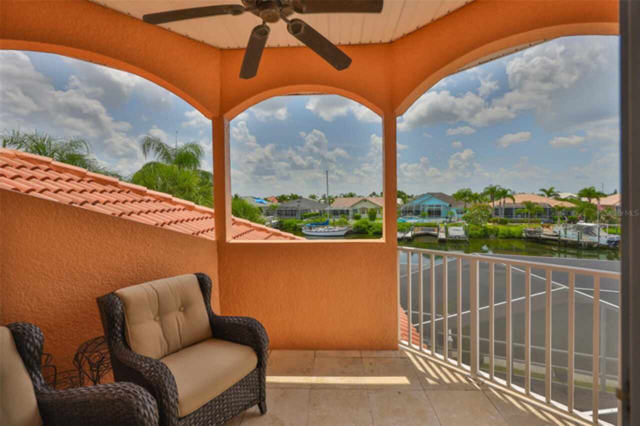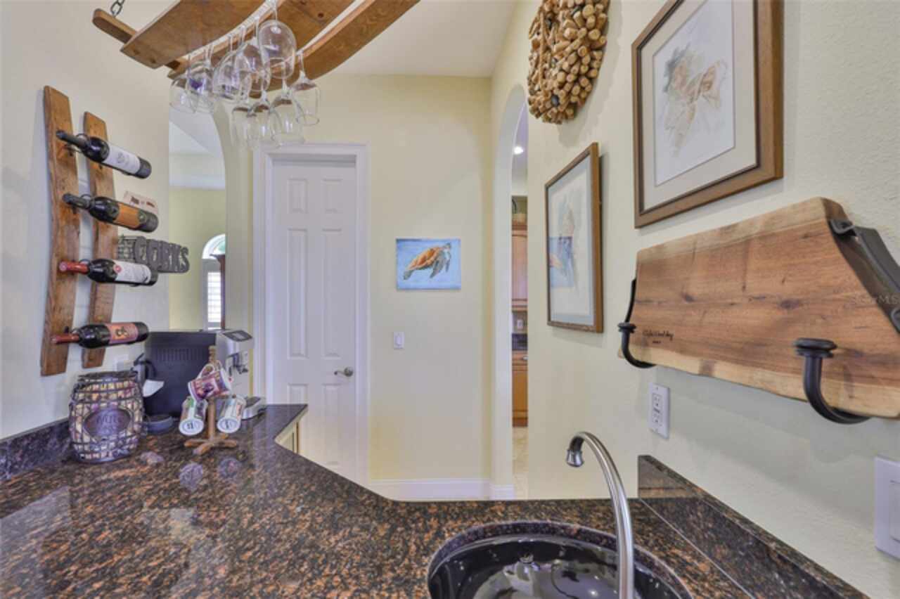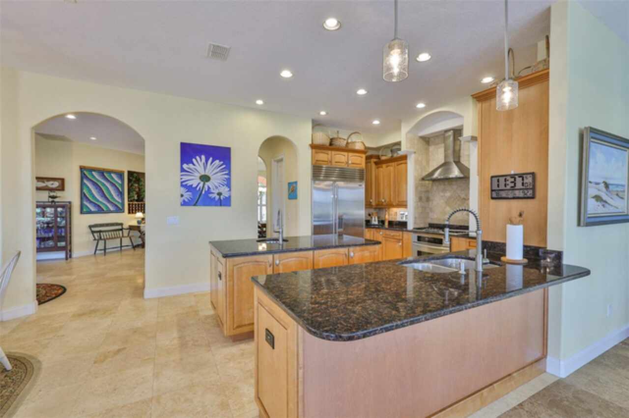 Welcome to your dream home in the prestigious Symphony Isles community! This breathtaking waterfront residence boasts a castle-like curb appeal, featuring Spanish tile accents, a grand baluster staircase, and an elegant balcony that exudes timeless charm. Step inside to discover a spacious, open floor plan adorned with gorgeous travertine floors throughout. Elegant columns and plantation shutters enhance the light-filled interiors, creating a sophisticated and inviting atmosphere. The formal living and dining areas are perfect for entertaining, complemented by an adjacent bar with a sink for effortless hosting. The large chef's kitchen is a culinary masterpiece, equipped with maple wood cabinets, granite countertops, a generous island with a sink, and stainless steel appliances with two full size ovens, gas stove, and large walk-in pantry. The family room offers stunning bay windows and sliding doors that open to the covered lanai and pool deck, ideal for indoor-outdoor living and enjoying Florida's beautiful weather. The downstairs master suite features tray ceilings, expansive walk-in closets, and a spa-inspired bathroom with a garden tub and a stand-up shower - your private retreat. For added convenience, a full-size elevator provides easy access to all floors. Upstairs, you'll find a spacious bonus room with a balcony, perfect for a home theater, gym, or additional living space. Three sizable bedrooms with Jack and Jill bathrooms, one with access to a private balcony, offer comfort and privacy for family and guests. Relax outdoors on your private lanai, complete with a sparkling pool and heated spa, perfect for unwinding or entertaining. The newer deck area with an outdoor grill makes outdoor dining and gatherings a breeze. Bring your sailboat or large vessel, Symphony Isles offers deep canals and private docks to accommodate your boating lifestyle. Enjoy the community's exclusive amenities, including private roads, 24/7 manned gate access, a private beach, swimming pool, clubhouse, and playgrounds, everything you need for a luxurious and active Florida lifestyle. Don't miss the opportunity to own this extraordinary waterfront estate, schedule your private tour today!