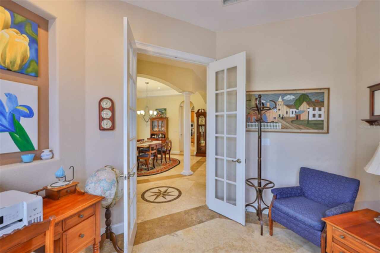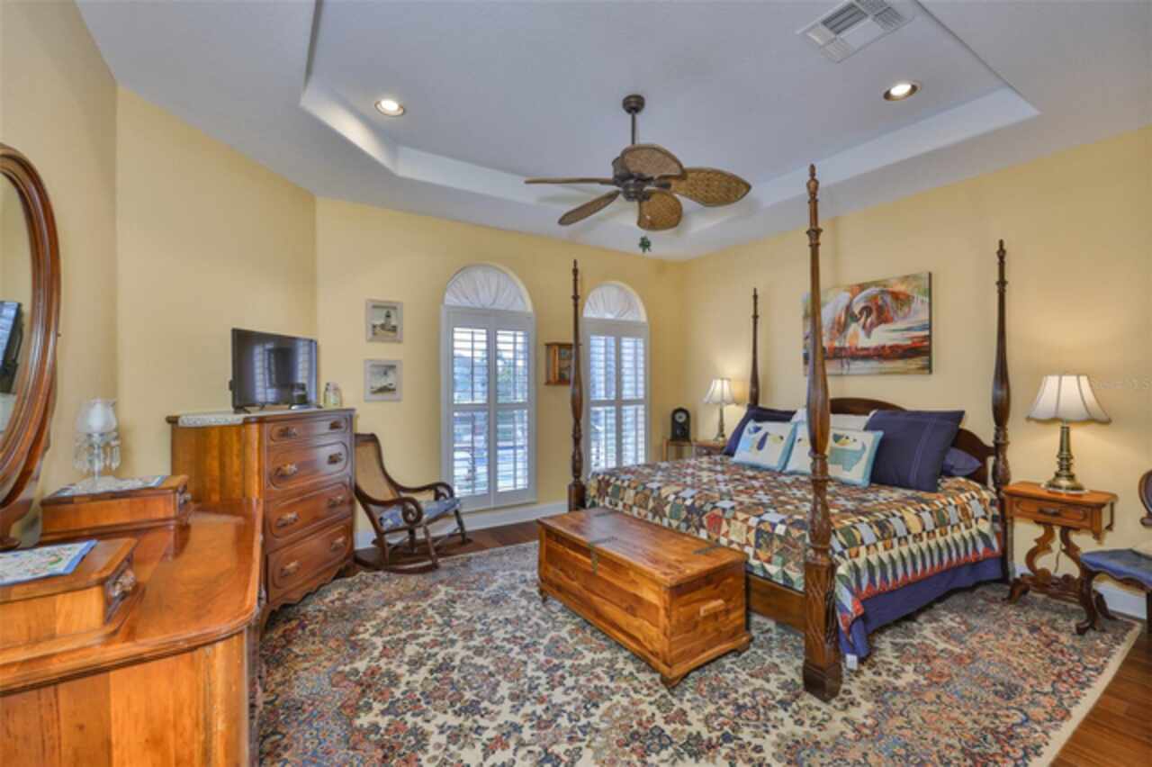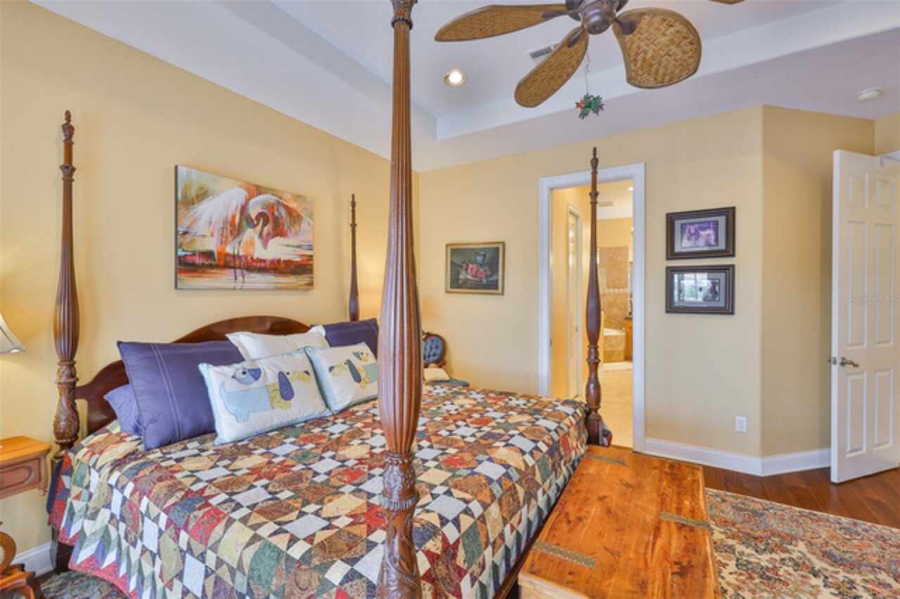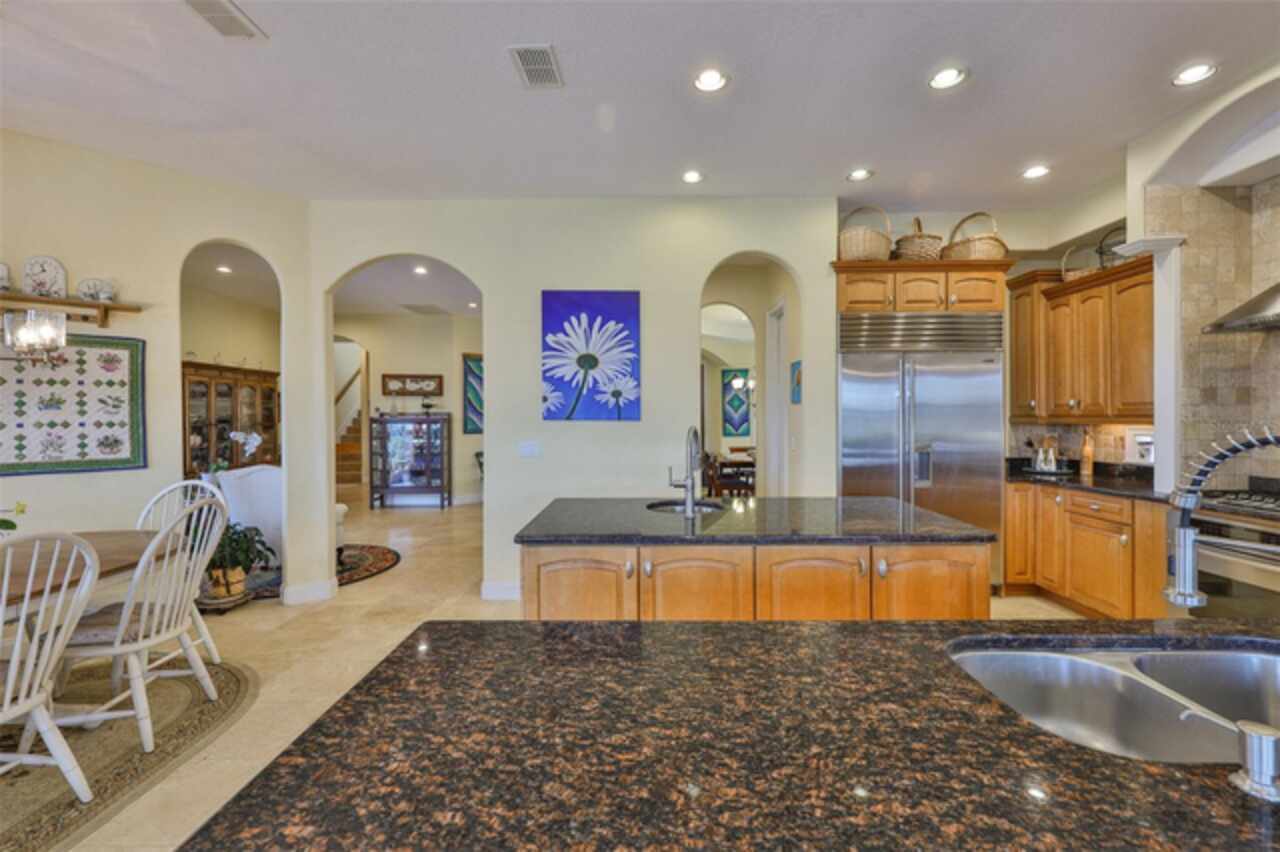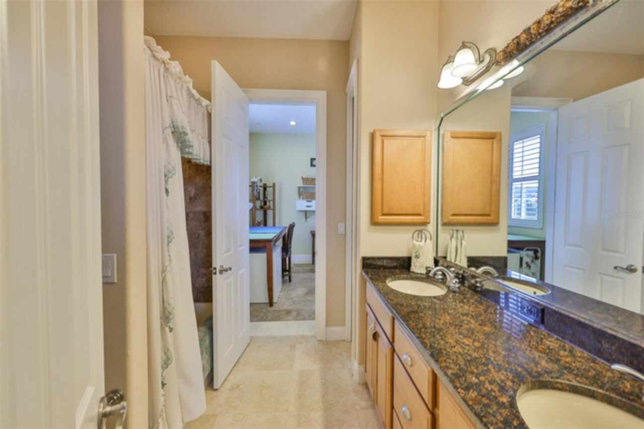 Welcome to your dream home in the prestigious Symphony Isles community! This breathtaking waterfront residence boasts a castle-like curb appeal, featuring Spanish tile accents, a grand baluster staircase, and an elegant balcony that exudes timeless charm. Step inside to discover a spacious, open floor plan adorned with gorgeous travertine floors throughout. Elegant columns and plantation shutters enhance the light-filled interiors, creating a sophisticated and inviting atmosphere. The formal living and dining areas are perfect for entertaining, complemented by an adjacent bar with a sink for effortless hosting. The large chef's kitchen is a culinary masterpiece, equipped with maple wood cabinets, granite countertops, a generous island with a sink, and stainless steel appliances with two full size ovens, gas stove, and large walk-in pantry. The family room offers stunning bay windows and sliding doors that open to the covered lanai and pool deck, ideal for indoor-outdoor living and enjoying Florida's beautiful weather. The downstairs master suite features tray ceilings, expansive walk-in closets, and a spa-inspired bathroom with a garden tub and a stand-up shower - your private retreat. For added convenience, a full-size elevator provides easy access to all floors. Upstairs, you'll find a spacious bonus room with a balcony, perfect for a home theater, gym, or additional living space. Three sizable bedrooms with Jack and Jill bathrooms, one with access to a private balcony, offer comfort and privacy for family and guests. Relax outdoors on your private lanai, complete with a sparkling pool and heated spa, perfect for unwinding or entertaining. The newer deck area with an outdoor grill makes outdoor dining and gatherings a breeze. Bring your sailboat or large vessel, Symphony Isles offers deep canals and private docks to accommodate your boating lifestyle. Enjoy the community's exclusive amenities, including private roads, 24/7 manned gate access, a private beach, swimming pool, clubhouse, and playgrounds, everything you need for a luxurious and active Florida lifestyle. Don't miss the opportunity to own this extraordinary waterfront estate, schedule your private tour today!
