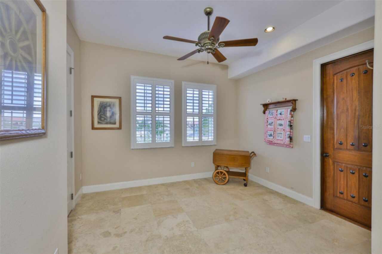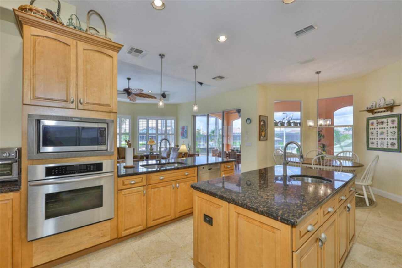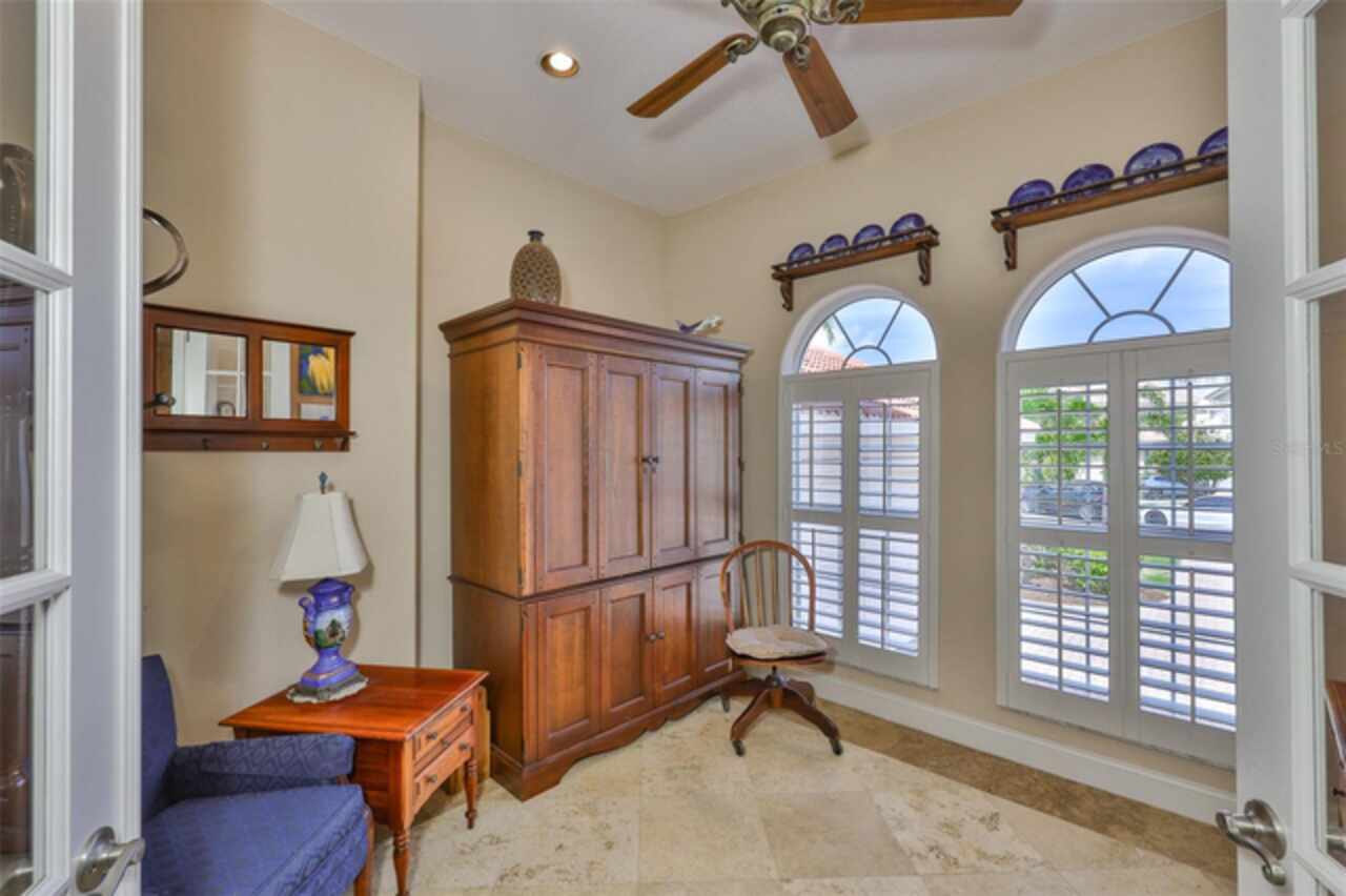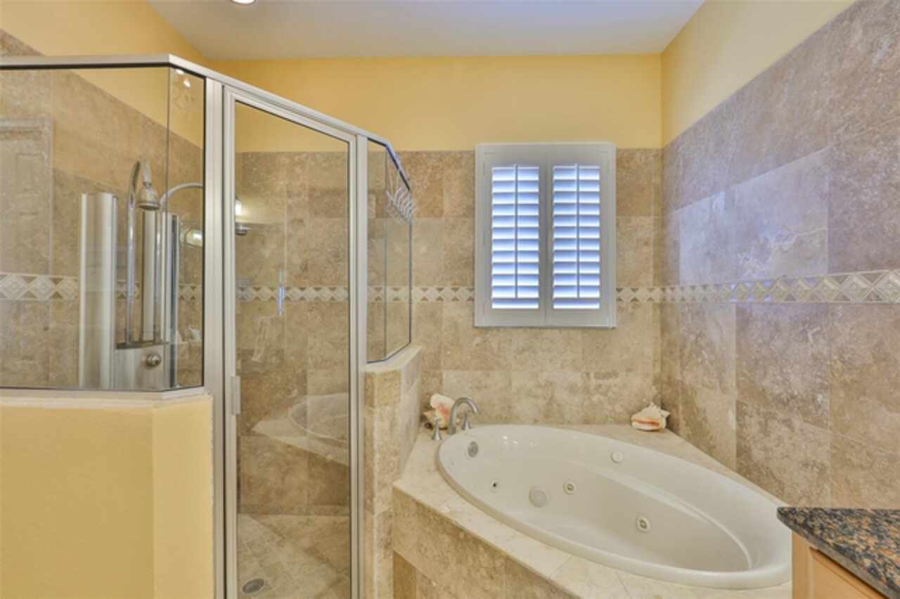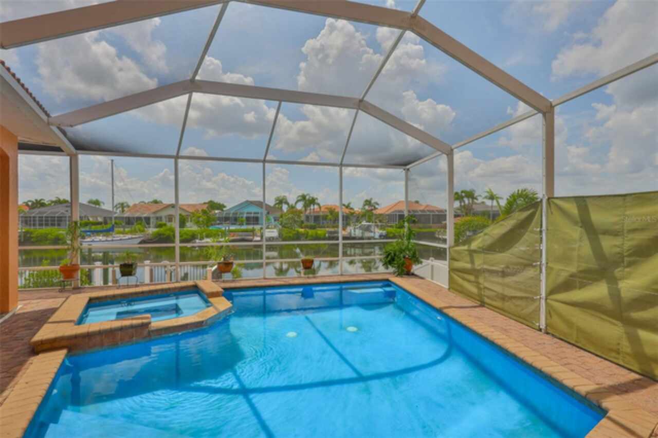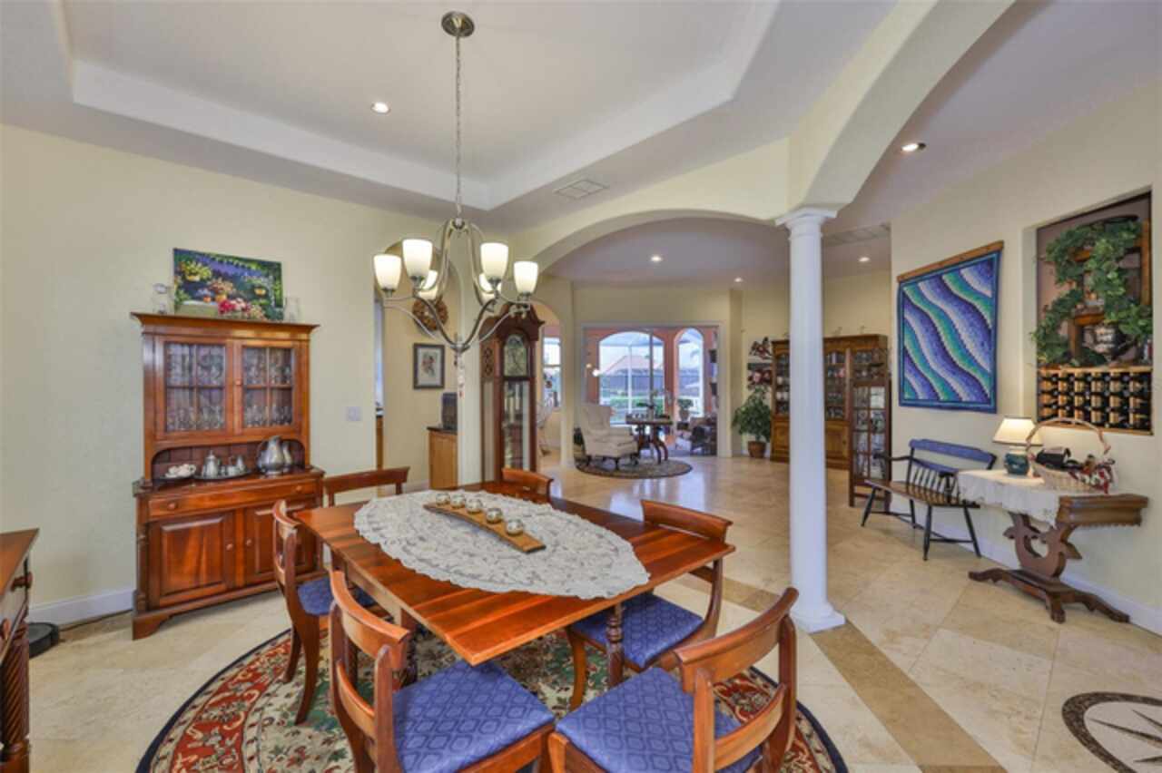 Welcome to your dream home in the prestigious Symphony Isles community! This breathtaking waterfront residence boasts a castle-like curb appeal, featuring Spanish tile accents, a grand baluster staircase, and an elegant balcony that exudes timeless charm. Step inside to discover a spacious, open floor plan adorned with gorgeous travertine floors throughout. Elegant columns and plantation shutters enhance the light-filled interiors, creating a sophisticated and inviting atmosphere. The formal living and dining areas are perfect for entertaining, complemented by an adjacent bar with a sink for effortless hosting. The large chef's kitchen is a culinary masterpiece, equipped with maple wood cabinets, granite countertops, a generous island with a sink, and stainless steel appliances with two full size ovens, gas stove, and large walk-in pantry. The family room offers stunning bay windows and sliding doors that open to the covered lanai and pool deck, ideal for indoor-outdoor living and enjoying Florida's beautiful weather. The downstairs master suite features tray ceilings, expansive walk-in closets, and a spa-inspired bathroom with a garden tub and a stand-up shower - your private retreat. For added convenience, a full-size elevator provides easy access to all floors. Upstairs, you'll find a spacious bonus room with a balcony, perfect for a home theater, gym, or additional living space. Three sizable bedrooms with Jack and Jill bathrooms, one with access to a private balcony, offer comfort and privacy for family and guests. Relax outdoors on your private lanai, complete with a sparkling pool and heated spa, perfect for unwinding or entertaining. The newer deck area with an outdoor grill makes outdoor dining and gatherings a breeze. Bring your sailboat or large vessel, Symphony Isles offers deep canals and private docks to accommodate your boating lifestyle. Enjoy the community's exclusive amenities, including private roads, 24/7 manned gate access, a private beach, swimming pool, clubhouse, and playgrounds, everything you need for a luxurious and active Florida lifestyle. Don't miss the opportunity to own this extraordinary waterfront estate, schedule your private tour today!