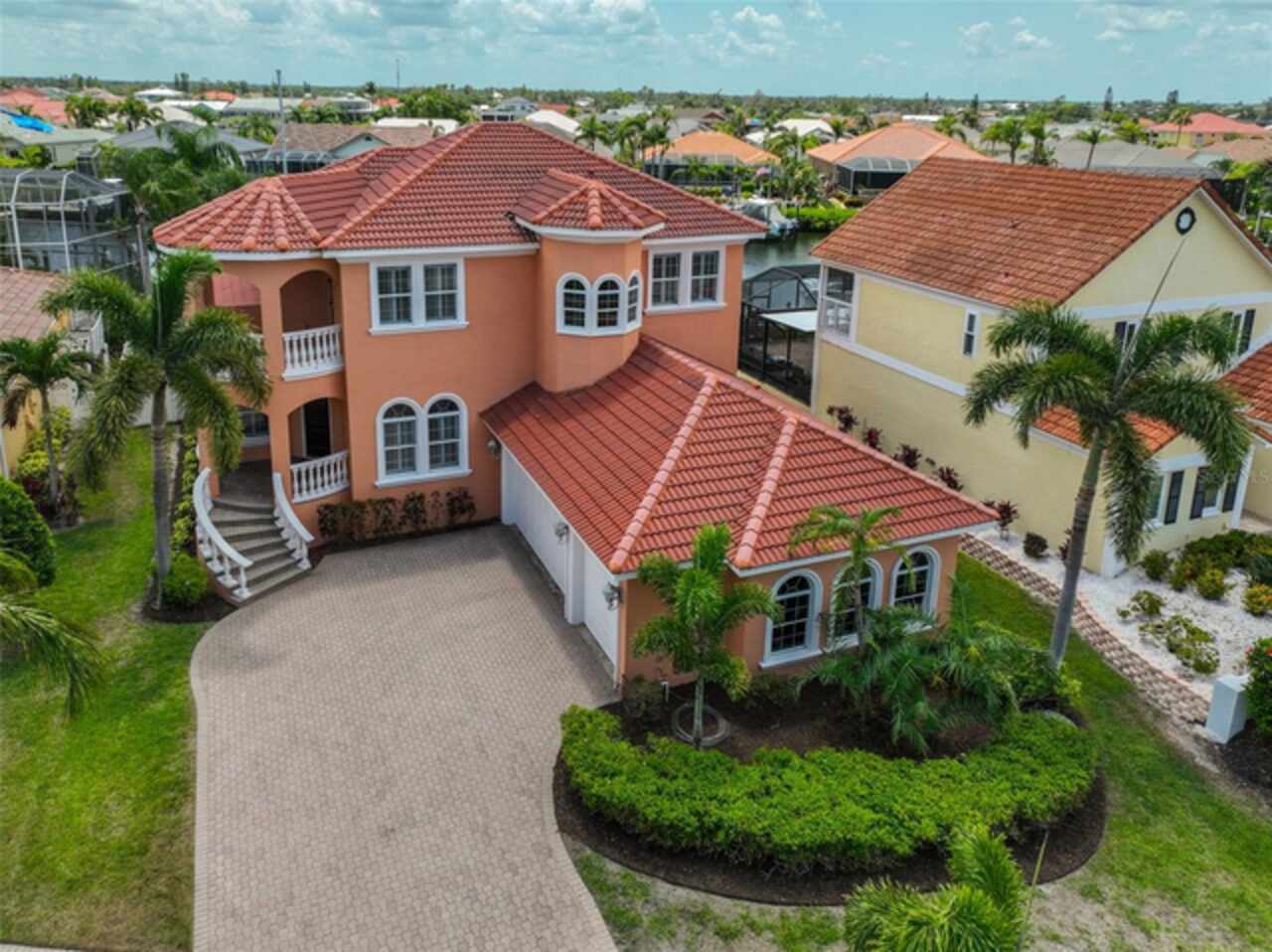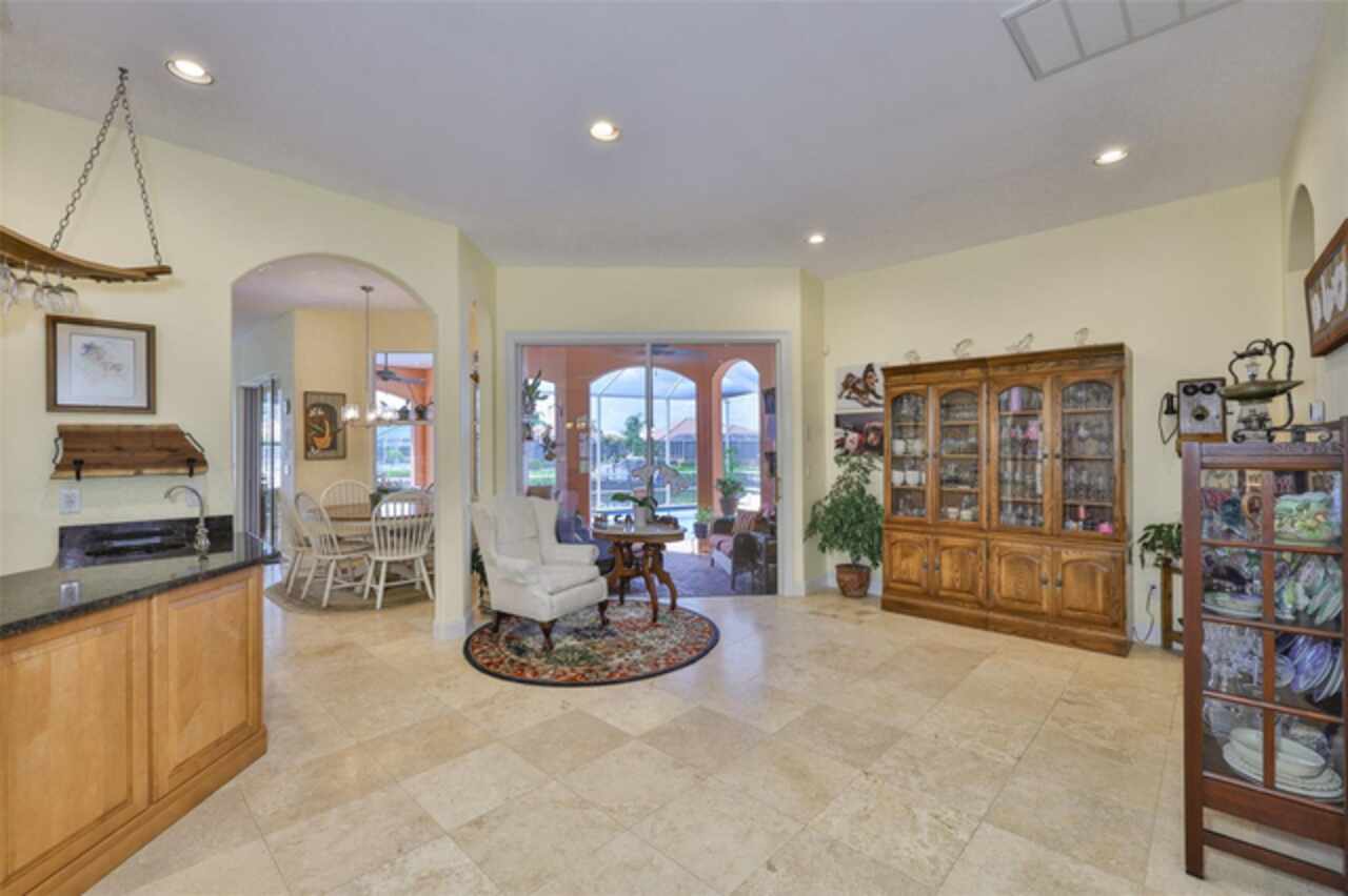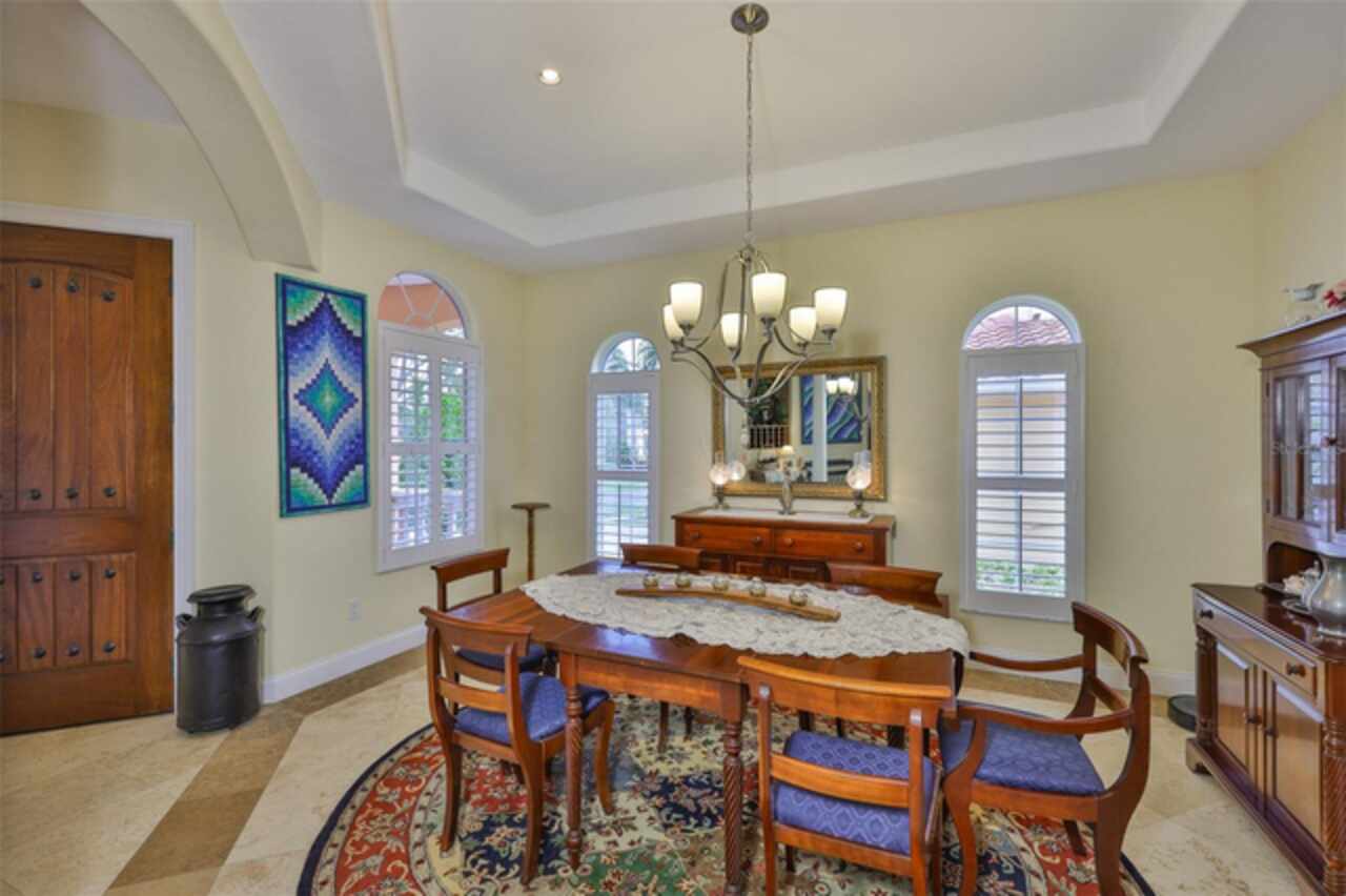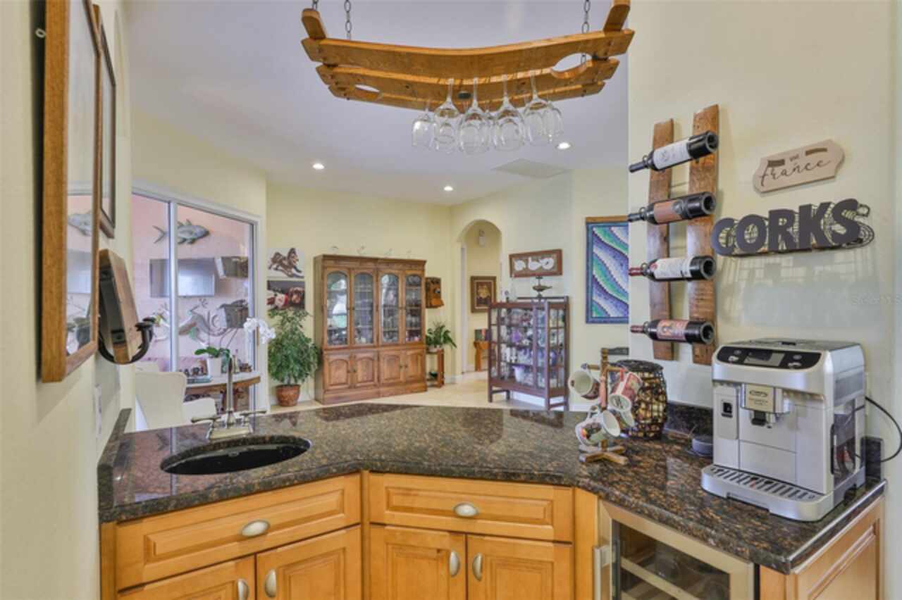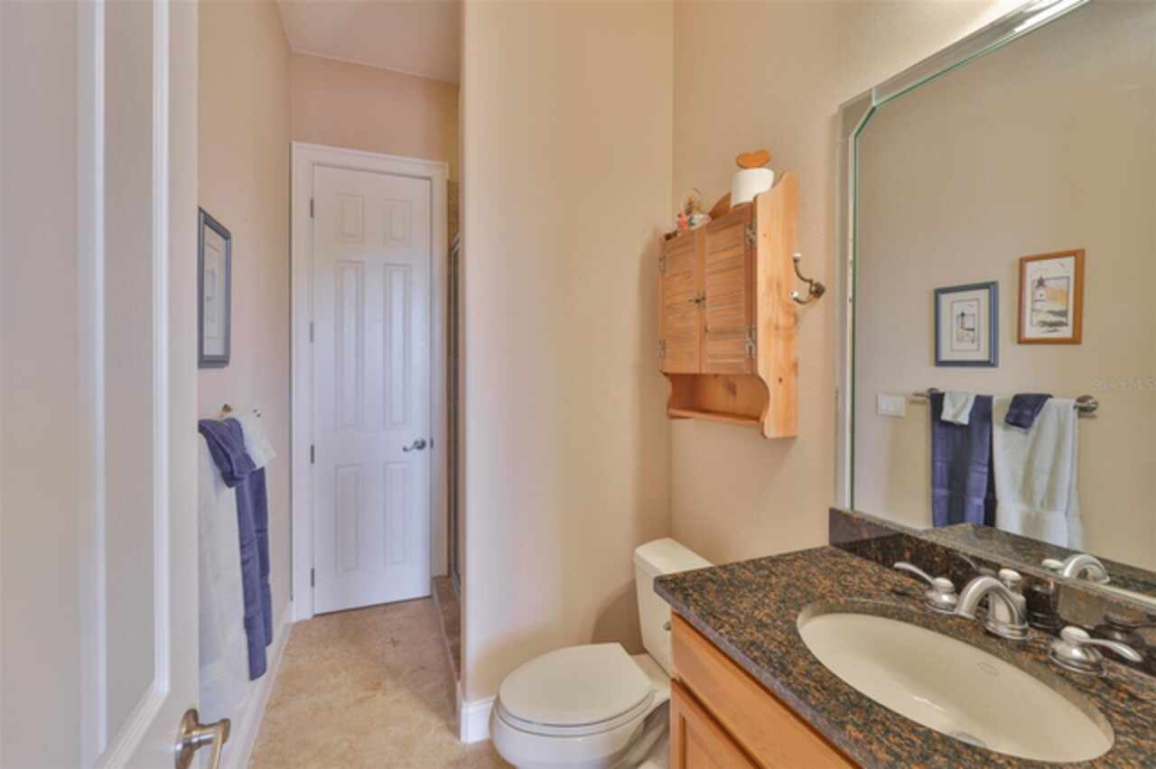 Welcome to your dream home in the prestigious Symphony Isles community! This breathtaking waterfront residence boasts a castle-like curb appeal, featuring Spanish tile accents, a grand baluster staircase, and an elegant balcony that exudes timeless charm. Step inside to discover a spacious, open floor plan adorned with gorgeous travertine floors throughout. Elegant columns and plantation shutters enhance the light-filled interiors, creating a sophisticated and inviting atmosphere. The formal living and dining areas are perfect for entertaining, complemented by an adjacent bar with a sink for effortless hosting. The large chef's kitchen is a culinary masterpiece, equipped with maple wood cabinets, granite countertops, a generous island with a sink, and stainless steel appliances with two full size ovens, gas stove, and large walk-in pantry. The family room offers stunning bay windows and sliding doors that open to the covered lanai and pool deck, ideal for indoor-outdoor living and enjoying Florida's beautiful weather. The downstairs master suite features tray ceilings, expansive walk-in closets, and a spa-inspired bathroom with a garden tub and a stand-up shower - your private retreat. For added convenience, a full-size elevator provides easy access to all floors. Upstairs, you'll find a spacious bonus room with a balcony, perfect for a home theater, gym, or additional living space. Three sizable bedrooms with Jack and Jill bathrooms, one with access to a private balcony, offer comfort and privacy for family and guests. Relax outdoors on your private lanai, complete with a sparkling pool and heated spa, perfect for unwinding or entertaining. The newer deck area with an outdoor grill makes outdoor dining and gatherings a breeze. Bring your sailboat or large vessel, Symphony Isles offers deep canals and private docks to accommodate your boating lifestyle. Enjoy the community's exclusive amenities, including private roads, 24/7 manned gate access, a private beach, swimming pool, clubhouse, and playgrounds, everything you need for a luxurious and active Florida lifestyle. Don't miss the opportunity to own this extraordinary waterfront estate, schedule your private tour today!