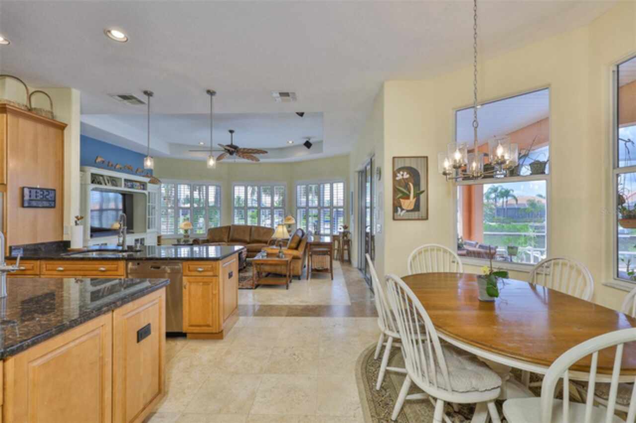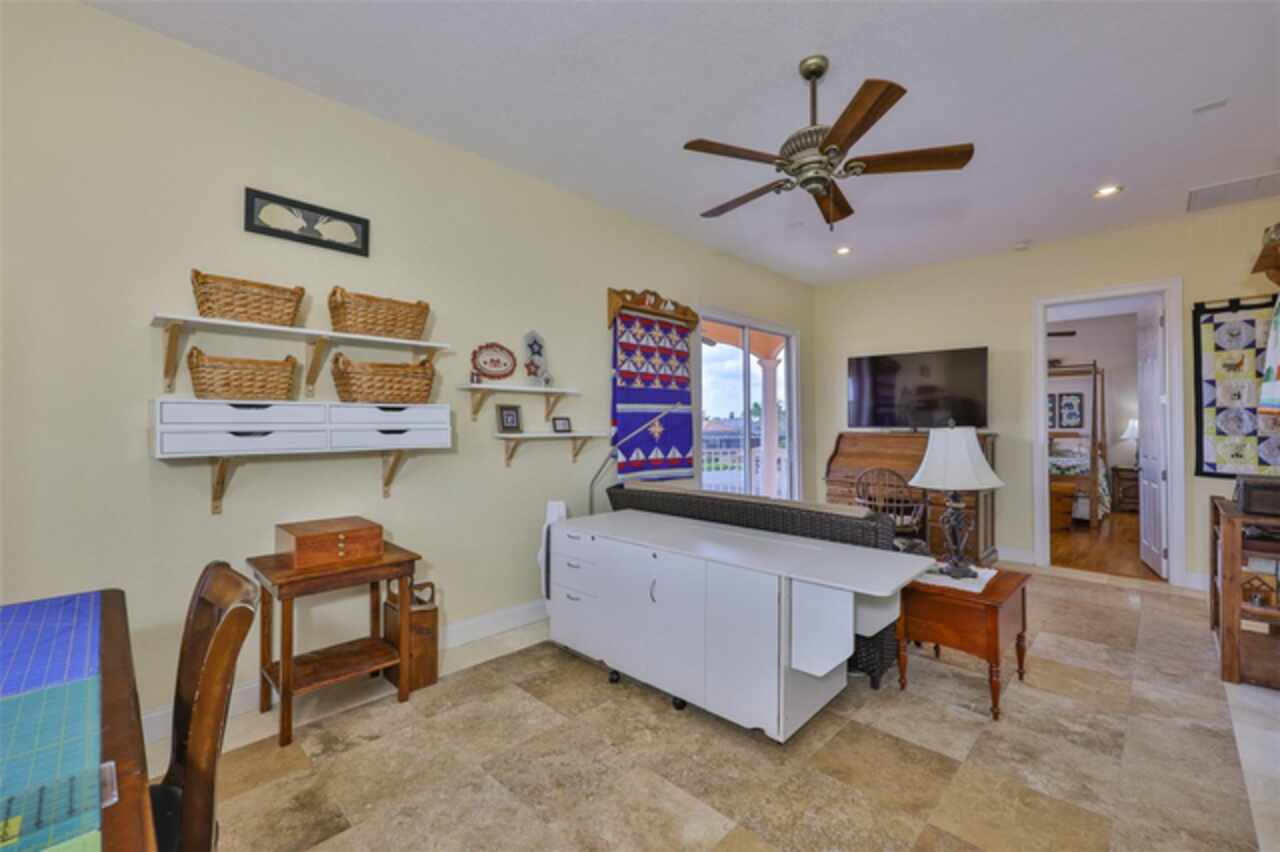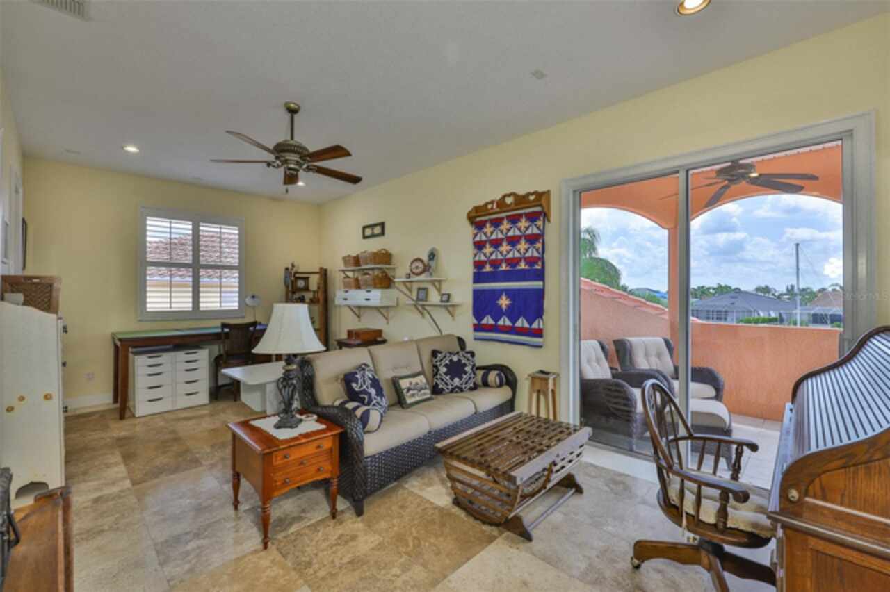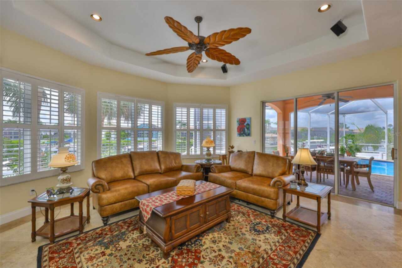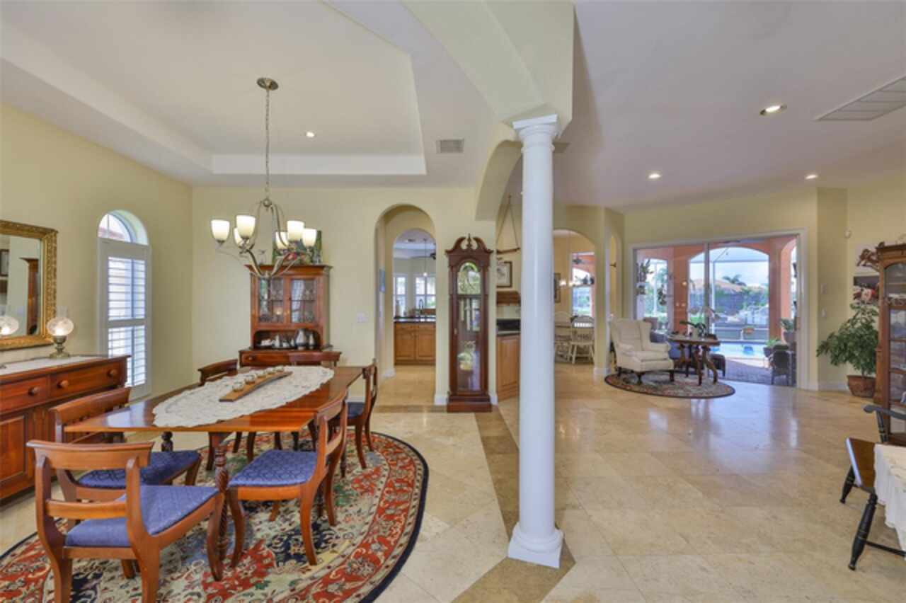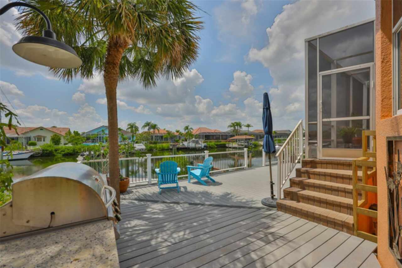 Welcome to your dream home in the prestigious Symphony Isles community! This breathtaking waterfront residence boasts a castle-like curb appeal, featuring Spanish tile accents, a grand baluster staircase, and an elegant balcony that exudes timeless charm. Step inside to discover a spacious, open floor plan adorned with gorgeous travertine floors throughout. Elegant columns and plantation shutters enhance the light-filled interiors, creating a sophisticated and inviting atmosphere. The formal living and dining areas are perfect for entertaining, complemented by an adjacent bar with a sink for effortless hosting. The large chef's kitchen is a culinary masterpiece, equipped with maple wood cabinets, granite countertops, a generous island with a sink, and stainless steel appliances with two full size ovens, gas stove, and large walk-in pantry. The family room offers stunning bay windows and sliding doors that open to the covered lanai and pool deck, ideal for indoor-outdoor living and enjoying Florida's beautiful weather. The downstairs master suite features tray ceilings, expansive walk-in closets, and a spa-inspired bathroom with a garden tub and a stand-up shower - your private retreat. For added convenience, a full-size elevator provides easy access to all floors. Upstairs, you'll find a spacious bonus room with a balcony, perfect for a home theater, gym, or additional living space. Three sizable bedrooms with Jack and Jill bathrooms, one with access to a private balcony, offer comfort and privacy for family and guests. Relax outdoors on your private lanai, complete with a sparkling pool and heated spa, perfect for unwinding or entertaining. The newer deck area with an outdoor grill makes outdoor dining and gatherings a breeze. Bring your sailboat or large vessel, Symphony Isles offers deep canals and private docks to accommodate your boating lifestyle. Enjoy the community's exclusive amenities, including private roads, 24/7 manned gate access, a private beach, swimming pool, clubhouse, and playgrounds, everything you need for a luxurious and active Florida lifestyle. Don't miss the opportunity to own this extraordinary waterfront estate, schedule your private tour today!