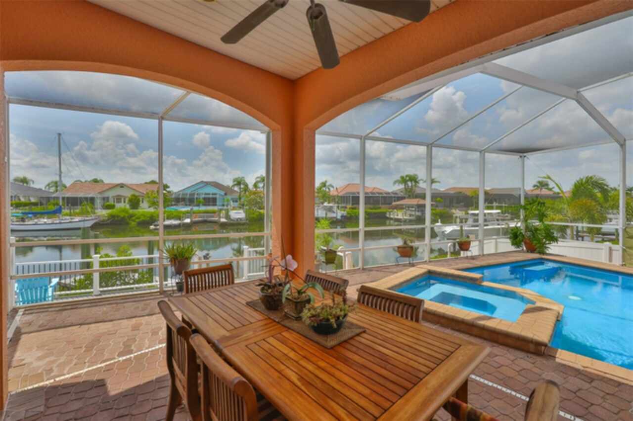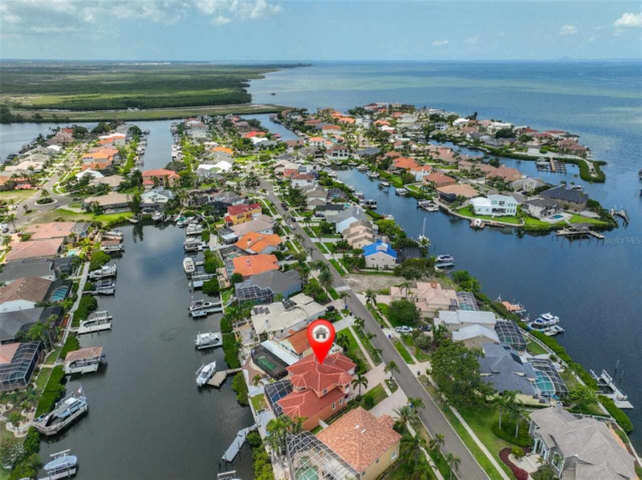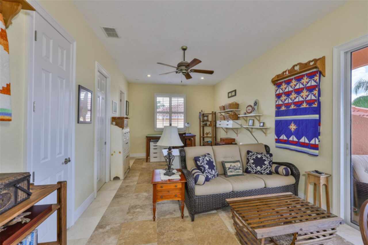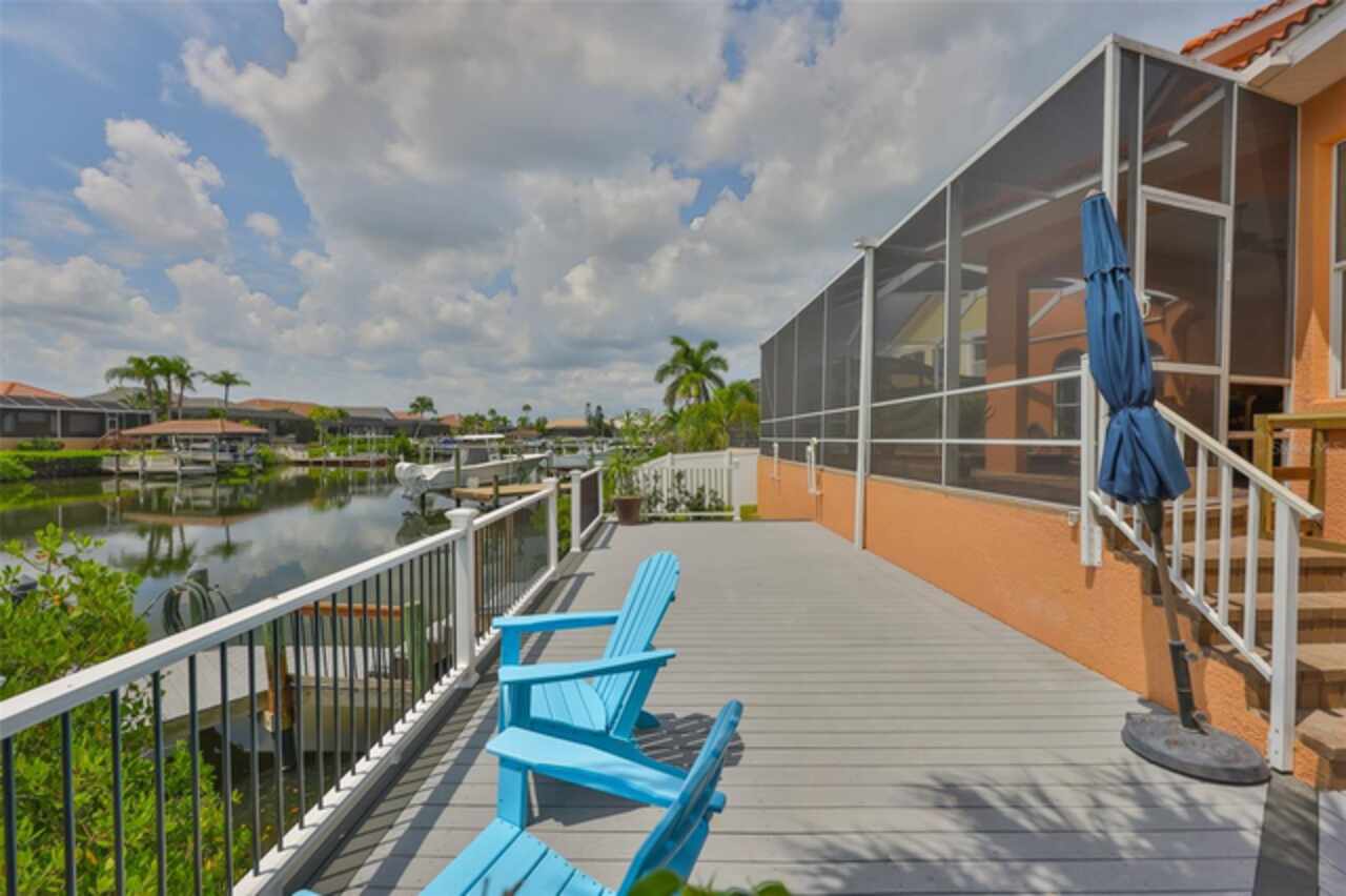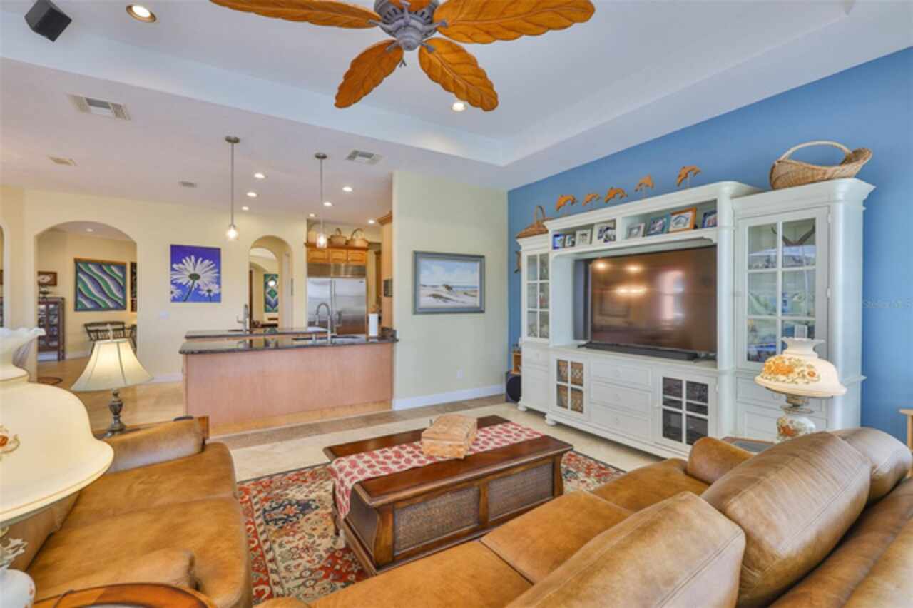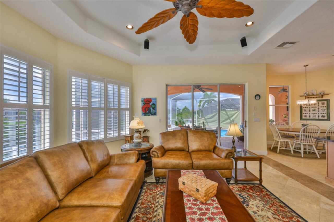 Welcome to your dream home in the prestigious Symphony Isles community! This breathtaking waterfront residence boasts a castle-like curb appeal, featuring Spanish tile accents, a grand baluster staircase, and an elegant balcony that exudes timeless charm. Step inside to discover a spacious, open floor plan adorned with gorgeous travertine floors throughout. Elegant columns and plantation shutters enhance the light-filled interiors, creating a sophisticated and inviting atmosphere. The formal living and dining areas are perfect for entertaining, complemented by an adjacent bar with a sink for effortless hosting. The large chef's kitchen is a culinary masterpiece, equipped with maple wood cabinets, granite countertops, a generous island with a sink, and stainless steel appliances with two full size ovens, gas stove, and large walk-in pantry. The family room offers stunning bay windows and sliding doors that open to the covered lanai and pool deck, ideal for indoor-outdoor living and enjoying Florida's beautiful weather. The downstairs master suite features tray ceilings, expansive walk-in closets, and a spa-inspired bathroom with a garden tub and a stand-up shower - your private retreat. For added convenience, a full-size elevator provides easy access to all floors. Upstairs, you'll find a spacious bonus room with a balcony, perfect for a home theater, gym, or additional living space. Three sizable bedrooms with Jack and Jill bathrooms, one with access to a private balcony, offer comfort and privacy for family and guests. Relax outdoors on your private lanai, complete with a sparkling pool and heated spa, perfect for unwinding or entertaining. The newer deck area with an outdoor grill makes outdoor dining and gatherings a breeze. Bring your sailboat or large vessel, Symphony Isles offers deep canals and private docks to accommodate your boating lifestyle. Enjoy the community's exclusive amenities, including private roads, 24/7 manned gate access, a private beach, swimming pool, clubhouse, and playgrounds, everything you need for a luxurious and active Florida lifestyle. Don't miss the opportunity to own this extraordinary waterfront estate, schedule your private tour today!