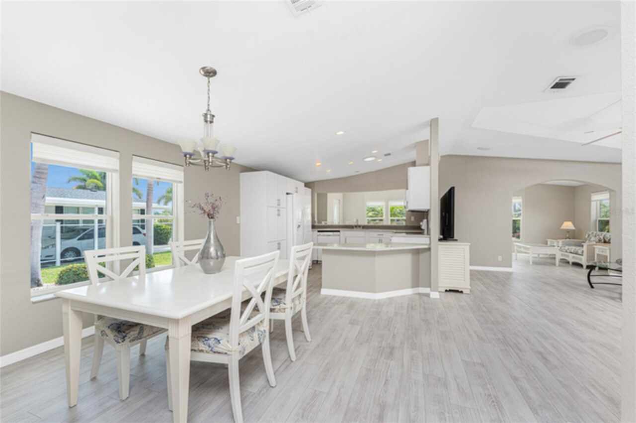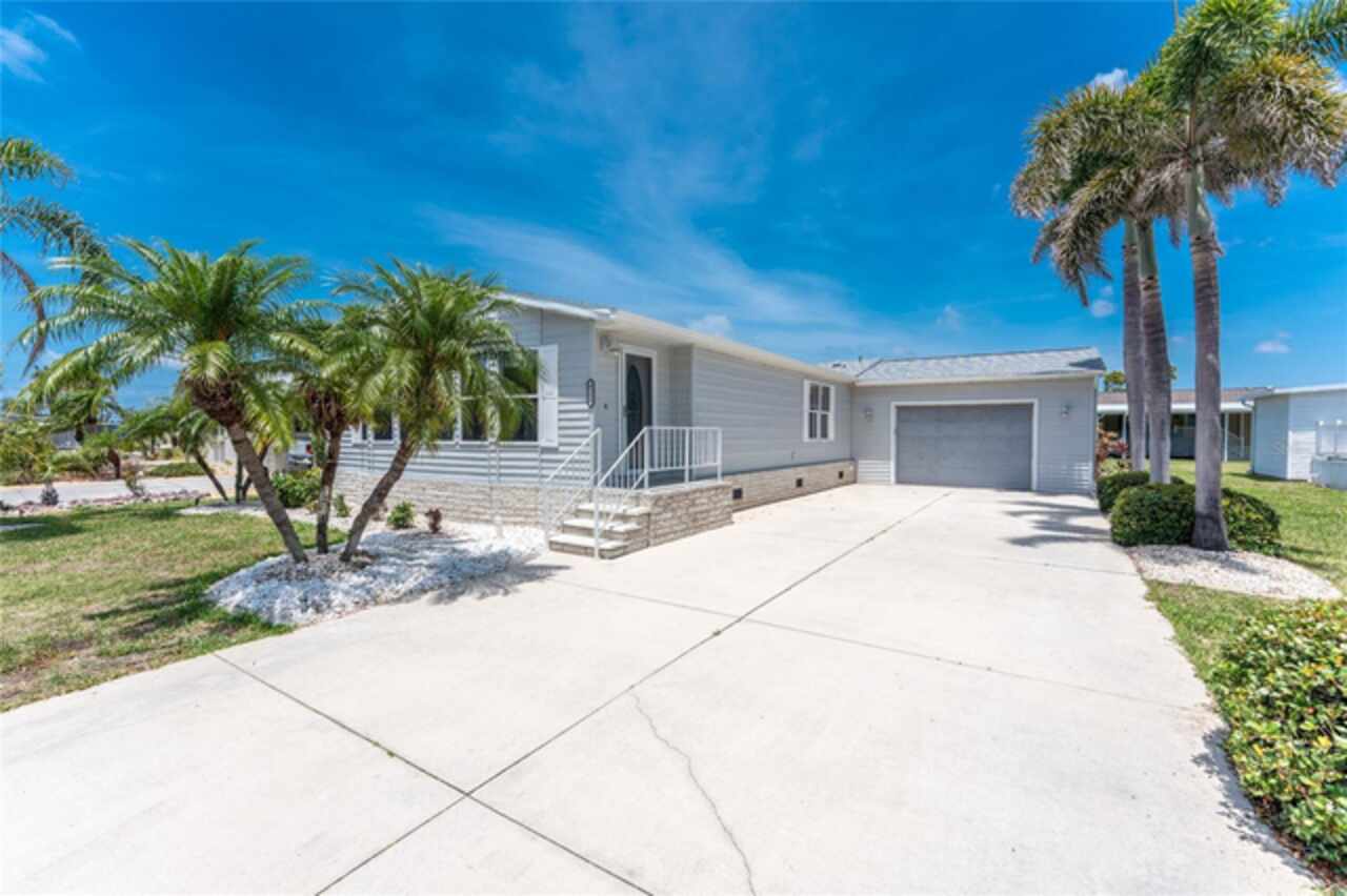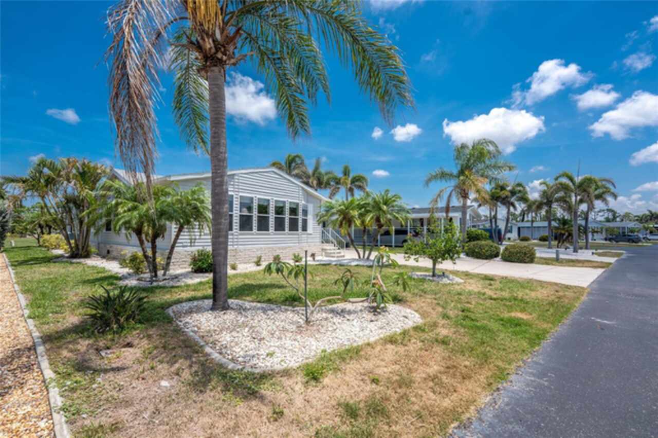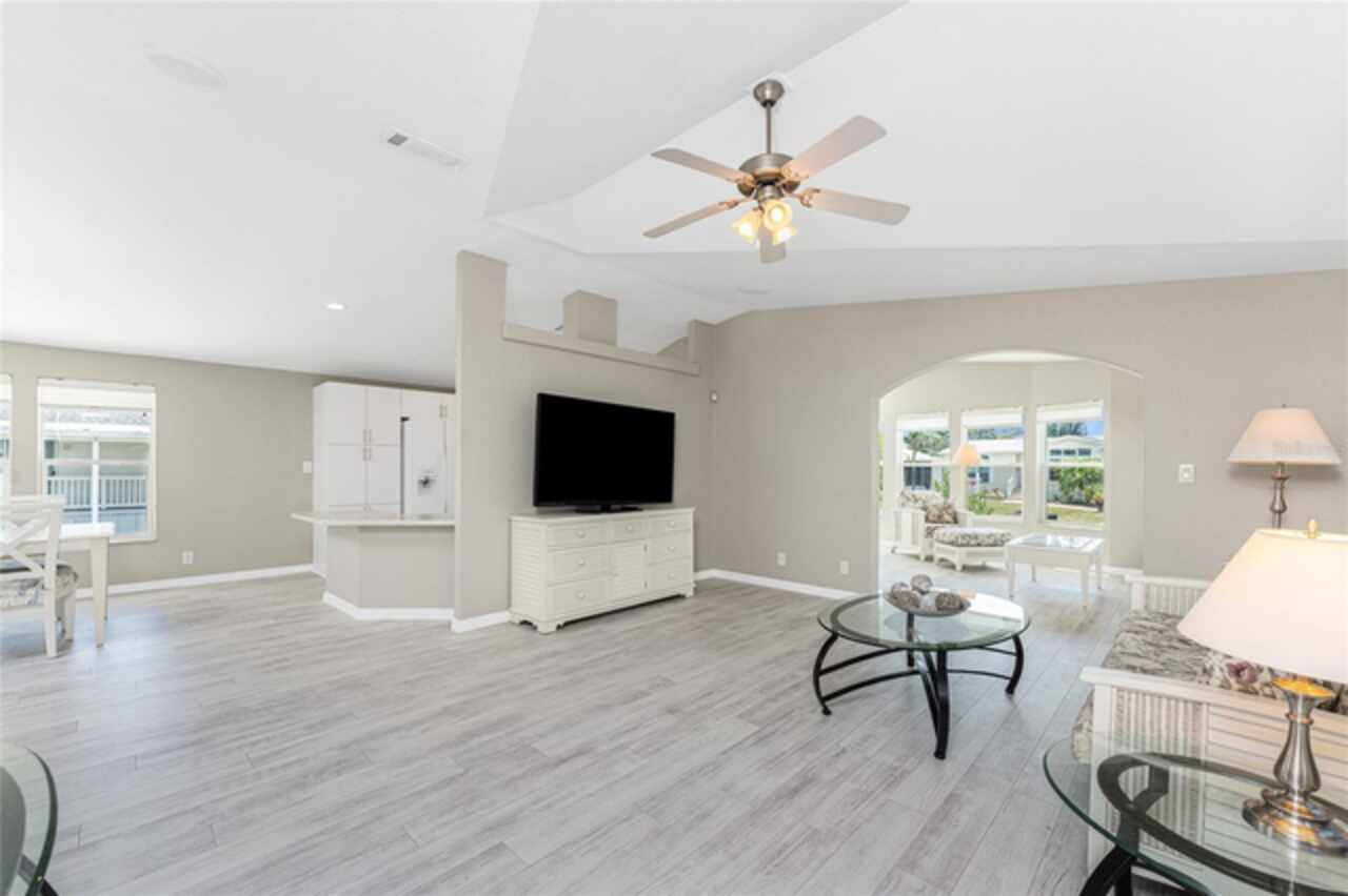 Live the good life at The Pines of Sandalhaven, a serene 55+ deed-restricted community that combines comfort, convenience, and coastal charm. This furnished, three-bedroom, two-bathroom home includes a one-car oversized enclosed garage, unique as the only one in the community, and is offered fully equipped with a golf cart featuring newer batteries, lawn mower, and bicycle. Located in the X flood zone and equipped with hurricane shutters, this property offers peace of mind. Exterior highlights include stone accents on the new siding, mature landscaping, and a 2023 roof. Inside, the home is light and bright, with large windows, brand new light-colored luxury vinyl plank flooring throughout, new drywall, new insulation, vaulted ceilings, and a fresh neutral color palette. The decorative leaded glass front door opens to a spacious sunroom that serves as an ideal formal living area or a sun filled place to relax. The family room features a cathedral-style wall of windows that allows abundant natural light to fill the space. The large kitchen includes ample white cabinetry, generous countertop space, and two breakfast bars—ideal for casual meals or entertaining. A formal dining area adjoins the kitchen, offering the perfect setting for holiday gatherings or family meals. The ensuite primary bedroom has plenty of space for furnishings, a door leading to the backyard, vaulted ceilings, and an oversized reach-in closet. The master bathroom features a dual-sink vanity and a walk-in shower. Both guest bedrooms are comfortably sized, and the guest bathroom includes a shower and tub combination for added flexibility. The interior laundry room offers additional functionality with plenty of built-in wire shelving for storage. When you are ready to enjoy the outdoors, the screened lanai with ceiling fans is a great place to kick back and relax—or fire up the grill after a day on the water. The community features a heated swimming pool, clubhouse with organized activities throughout the year, pickleball and bocce courts, and beautifully maintained park areas. Pet owners will appreciate that there are no size restrictions for pets. With low quarterly HOA fees and the advantage of land ownership (eliminating lot rental costs) The Pines of Sandalhaven offers an affordable and active lifestyle. This home puts you close to everything that makes Florida living so special, white sandy beaches in Englewood and Boca Grande, great local golf courses, major shopping, boutique browsing, many local restaurants and tiki bars, and amazing parks. You will be close to The Wildflower Preserve’s where you can stroll through the nature trails and birdwatching, or explore the wide-open beauty of the nearby Amberjack Environmental Park with its scenic trails. If you’re looking for a laid-back, fun, and sunny lifestyle, 9209 Pinehaven Way is ready for you. Contact us today to schedule your private showing.