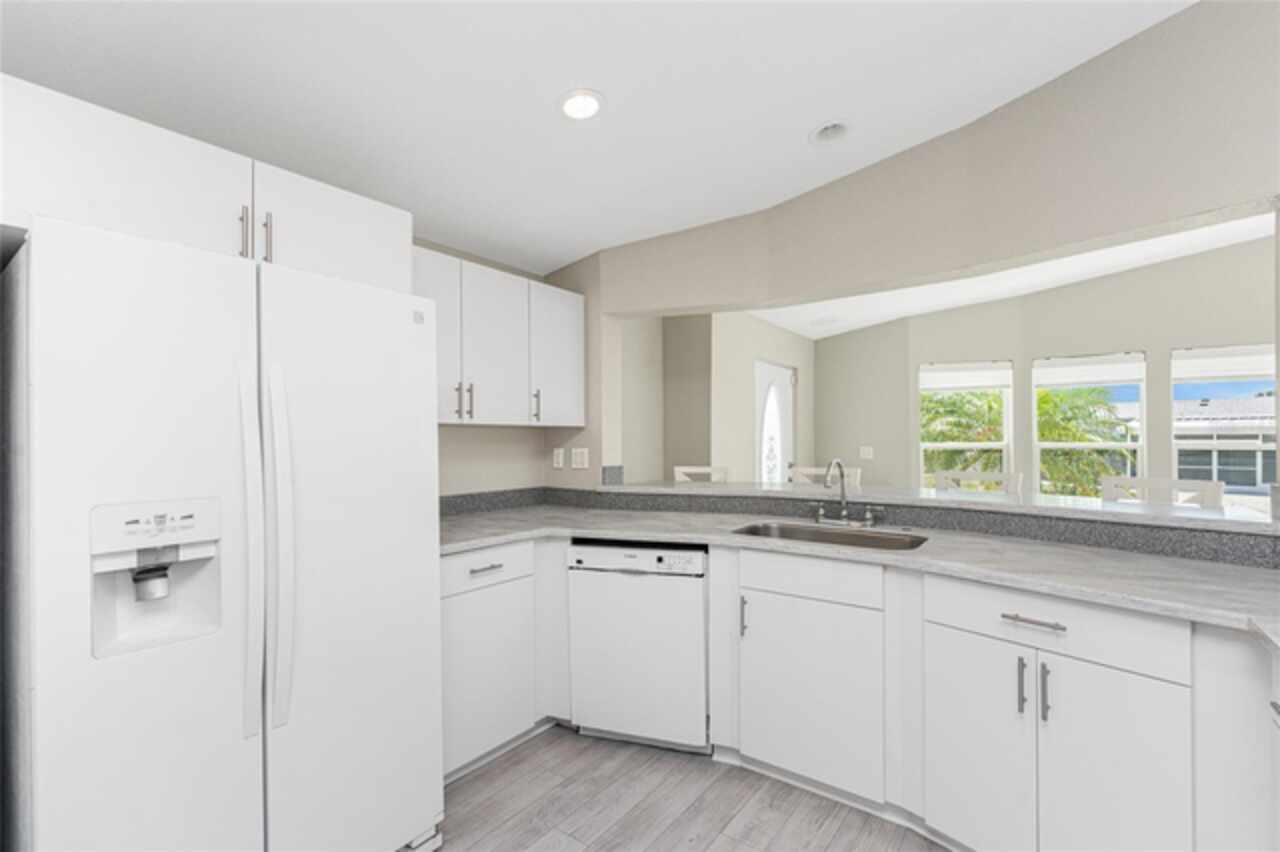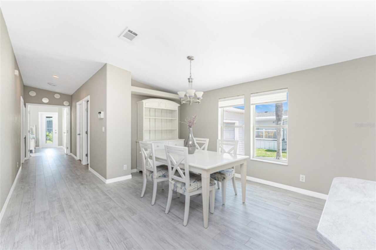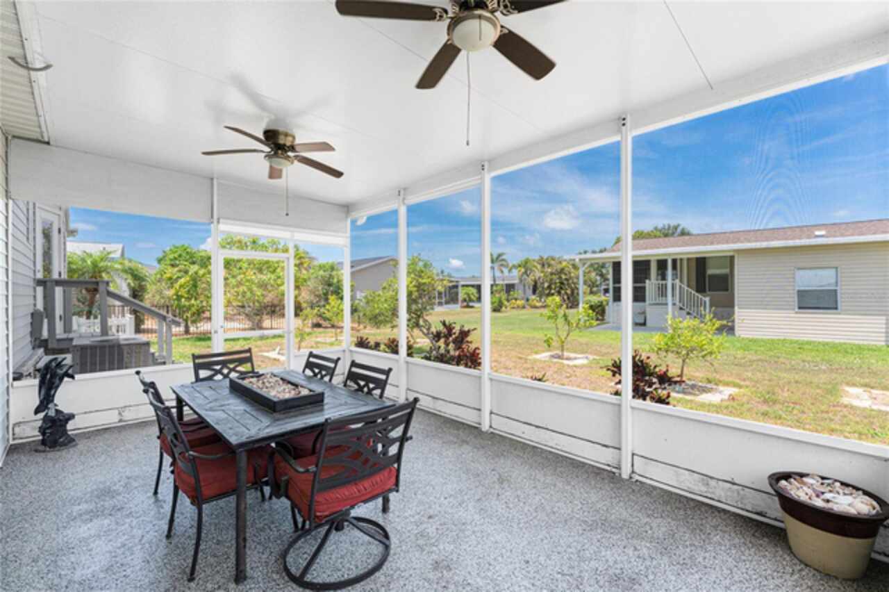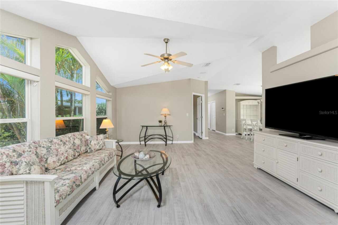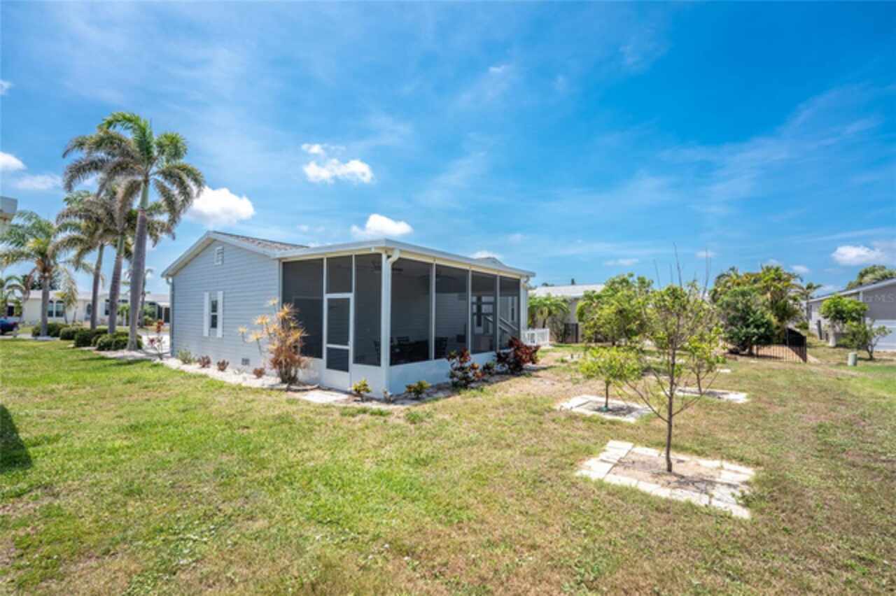 Live the good life at The Pines of Sandalhaven, a serene 55+ deed-restricted community that combines comfort, convenience, and coastal charm. This furnished, three-bedroom, two-bathroom home includes a one-car oversized enclosed garage, unique as the only one in the community, and is offered fully equipped with a golf cart featuring newer batteries, lawn mower, and bicycle. Located in the X flood zone and equipped with hurricane shutters, this property offers peace of mind. Exterior highlights include stone accents on the new siding, mature landscaping, and a 2023 roof. Inside, the home is light and bright, with large windows, brand new light-colored luxury vinyl plank flooring throughout, new drywall, new insulation, vaulted ceilings, and a fresh neutral color palette. The decorative leaded glass front door opens to a spacious sunroom that serves as an ideal formal living area or a sun filled place to relax. The family room features a cathedral-style wall of windows that allows abundant natural light to fill the space. The large kitchen includes ample white cabinetry, generous countertop space, and two breakfast bars—ideal for casual meals or entertaining. A formal dining area adjoins the kitchen, offering the perfect setting for holiday gatherings or family meals. The ensuite primary bedroom has plenty of space for furnishings, a door leading to the backyard, vaulted ceilings, and an oversized reach-in closet. The master bathroom features a dual-sink vanity and a walk-in shower. Both guest bedrooms are comfortably sized, and the guest bathroom includes a shower and tub combination for added flexibility. The interior laundry room offers additional functionality with plenty of built-in wire shelving for storage. When you are ready to enjoy the outdoors, the screened lanai with ceiling fans is a great place to kick back and relax—or fire up the grill after a day on the water. The community features a heated swimming pool, clubhouse with organized activities throughout the year, pickleball and bocce courts, and beautifully maintained park areas. Pet owners will appreciate that there are no size restrictions for pets. With low quarterly HOA fees and the advantage of land ownership (eliminating lot rental costs) The Pines of Sandalhaven offers an affordable and active lifestyle. This home puts you close to everything that makes Florida living so special, white sandy beaches in Englewood and Boca Grande, great local golf courses, major shopping, boutique browsing, many local restaurants and tiki bars, and amazing parks. You will be close to The Wildflower Preserve’s where you can stroll through the nature trails and birdwatching, or explore the wide-open beauty of the nearby Amberjack Environmental Park with its scenic trails. If you’re looking for a laid-back, fun, and sunny lifestyle, 9209 Pinehaven Way is ready for you. Contact us today to schedule your private showing.