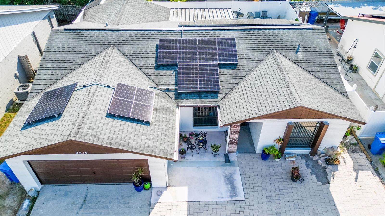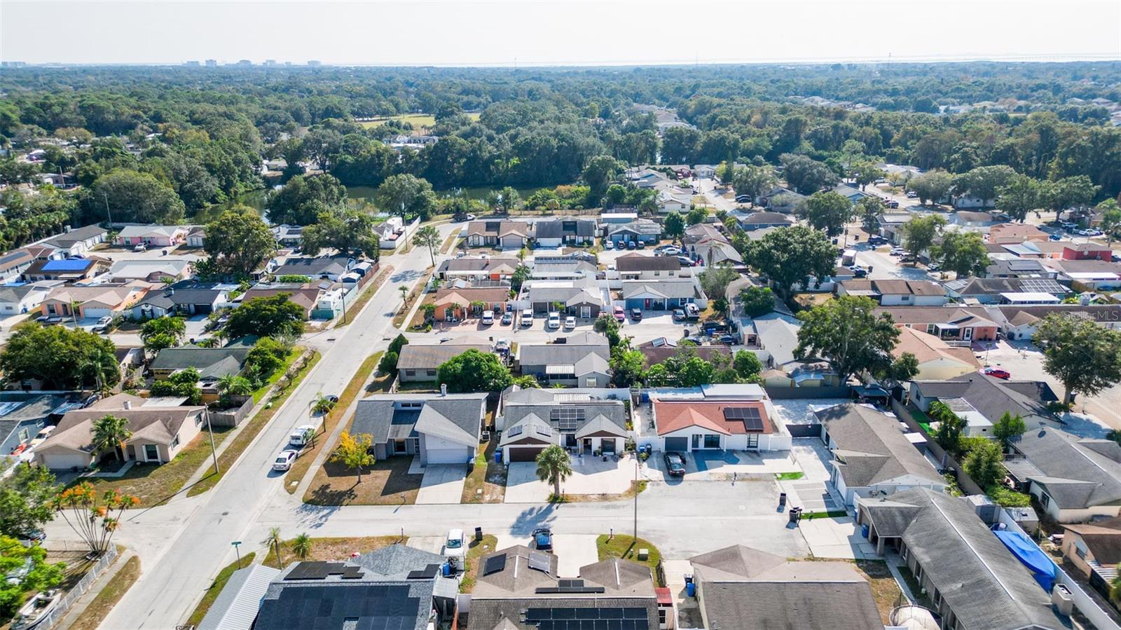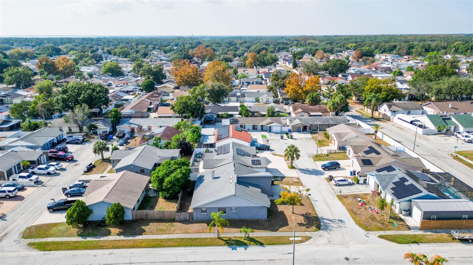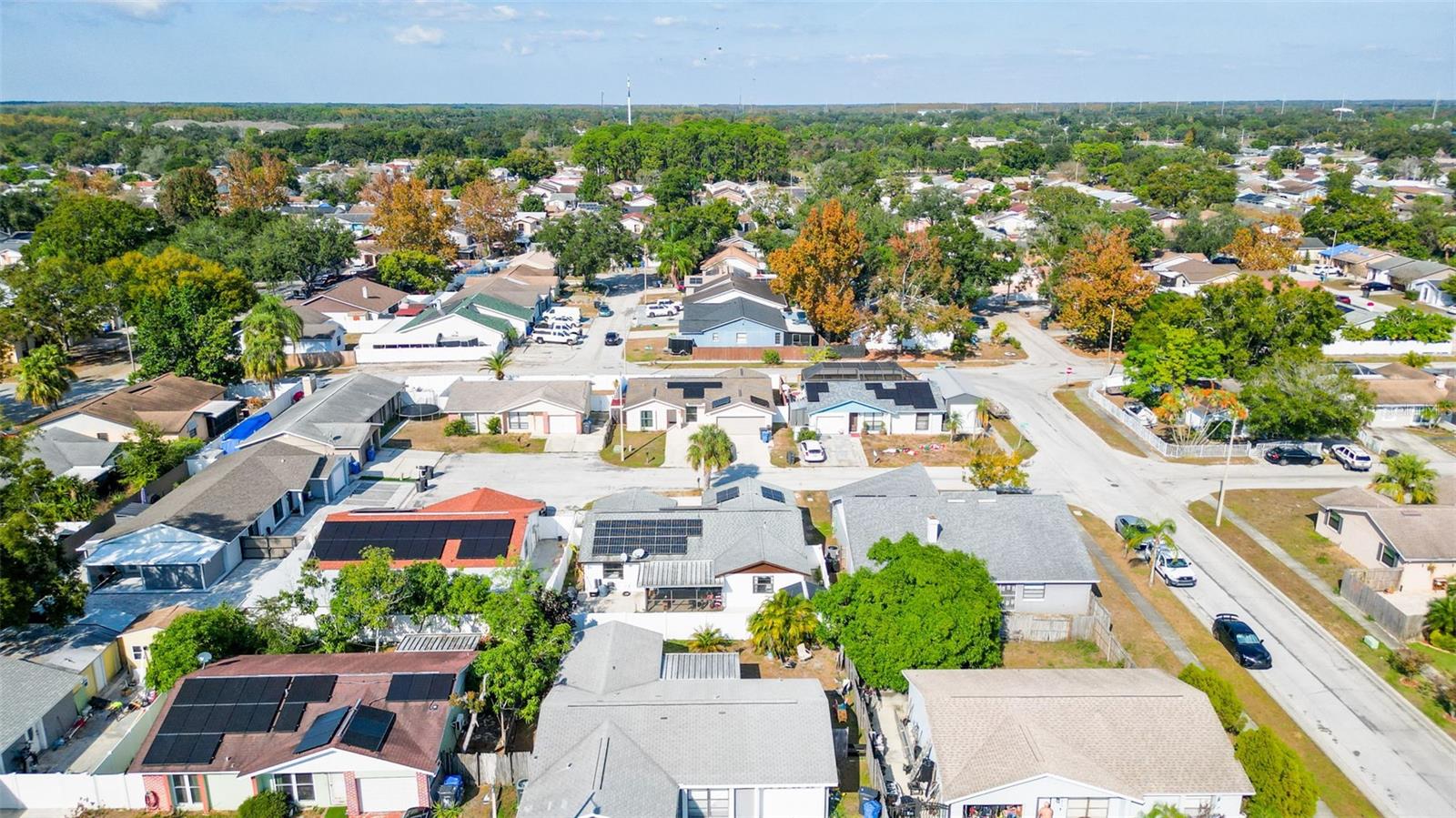 Welcome to 9214 Roundwood Ct — a beautifully upgraded, move-in ready home located in the heart of Town ’N’ Country with NO HOA, NO CDD, and NO flood zone. This charming split-floor plan offers 3 bedrooms, 2 bathrooms, and 1, 248 sqft of comfortable living, designed with style and functionality in mind. Step inside to an open living and dining area featuring luxury vinyl flooring throughout the main spaces, creating a modern and cohesive flow. The 2024-upgraded kitchen is the highlight of the home, showcasing stainless steel appliances, quartz countertops, tile backsplash, and sleek cabinetry—perfect for cooking and entertaining. Both bathrooms have been tastefully updated with new vanities and shower enclosures, offering a fresh feel. The spacious primary bedroom includes a walk-in closet and plenty of natural light. Major upgrades provide peace of mind, including a 2024 hybrid water heater, 2024 AC unit, and 2025 solar panels—with the solar panel loan to be PAID OFF at closing, giving the next owner incredibly low electric bills. The home also features a whole-home soft water system. The yard is low-maintenance with paver driveway, the home recently has a fresh exterior paint, it has vinyl fencing, and a backyard complete with concrete patio, storage shed, and fruit trees (avocado, papaya, and banana). Relax year-round in the screened-in lanai, perfect for morning coffee or evening downtime. Located minutes from shopping, restaurants, schools, parks, Tampa International Airport, and major highways—this home offers convenience, comfort, and long-term value. Don’t miss your chance to own a beautifully updated home with exceptional features, low monthly costs, and a highly desirable location.
