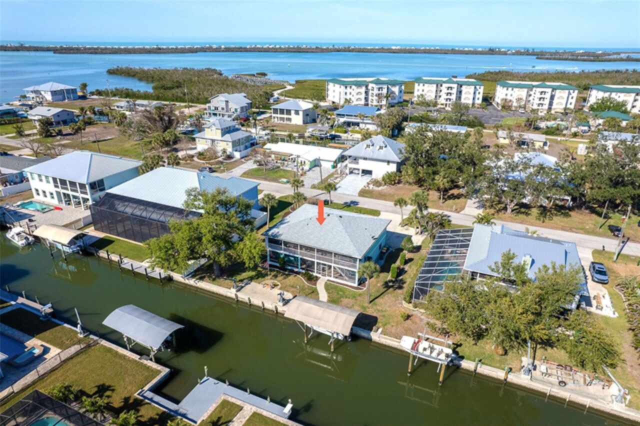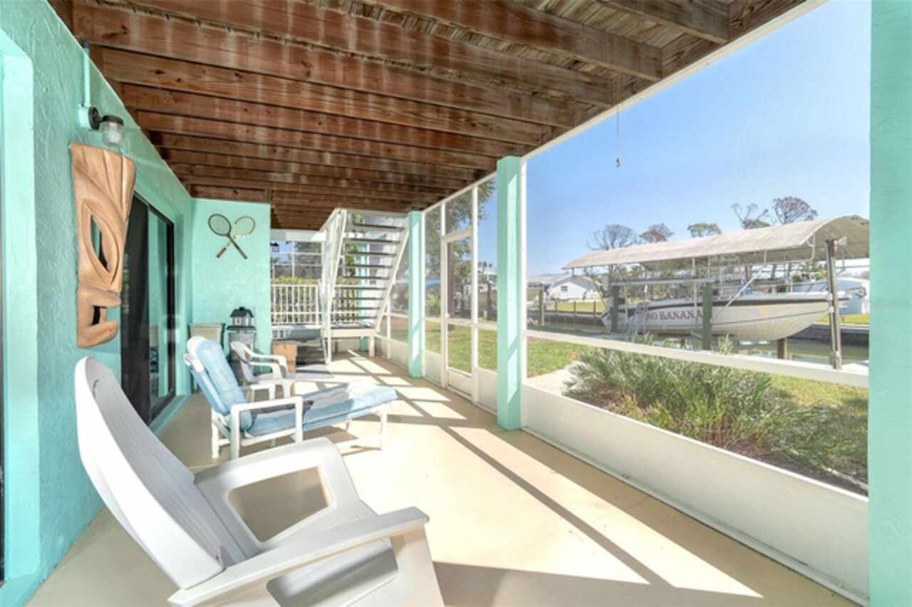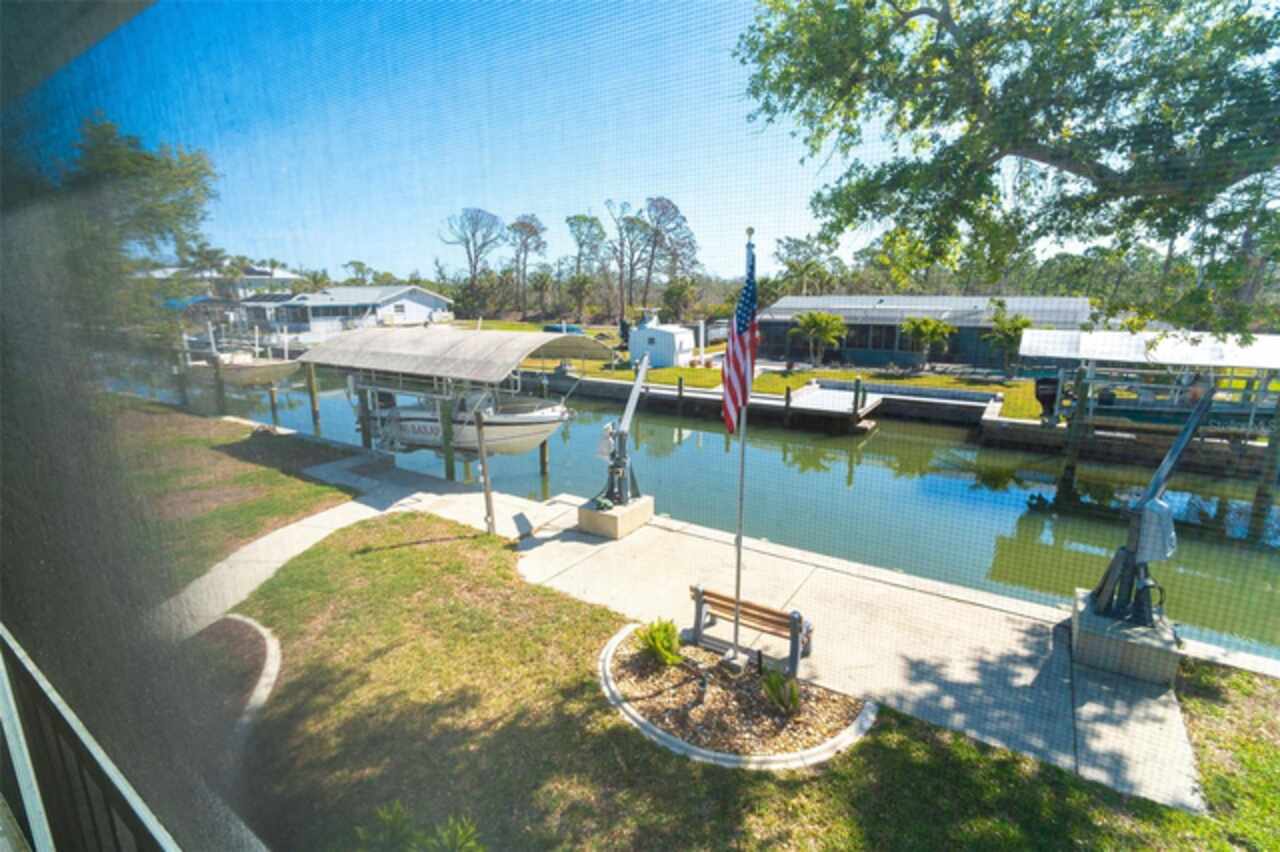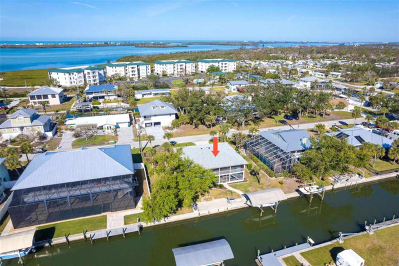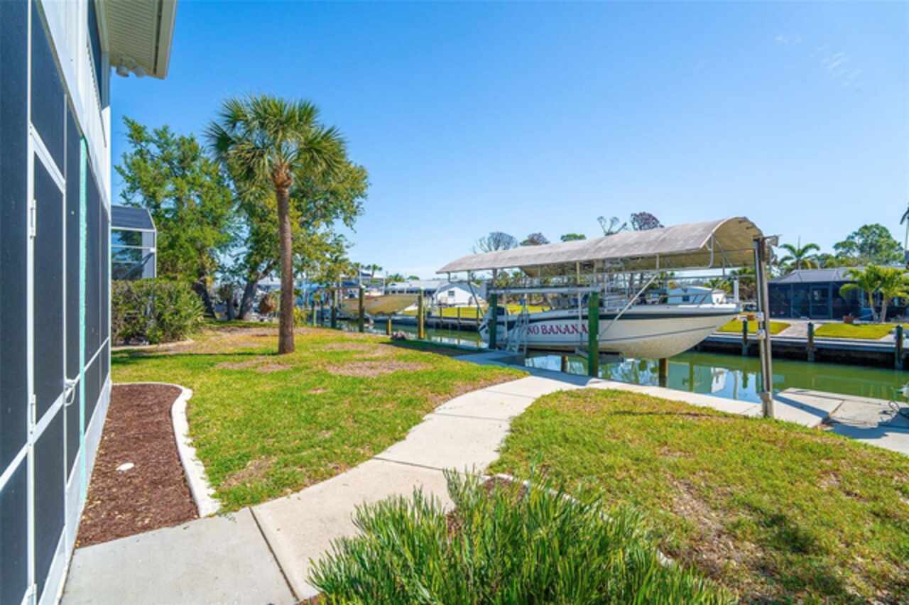 One or more photo(s) has been virtually staged. Waterfront Boatable Retreat with Deep Water Access & Stunning Views! Discover the ultimate coastal lifestyle with this elevated 3-bedroom, 2-bathroom home, perfectly situated on an oversized lot with 100 feet of water frontage. Boating enthusiasts will appreciate the sailboat-accessible deep water, a covered boat lift, a concrete seawall, and a dock with an extended concrete entertainment area—ideal for soaking up the Florida sunshine or hosting waterfront gatherings. Just minutes from the Intracoastal Waterway and the Gulf of Mexico, this property offers unparalleled convenience for those who love to explore by boat. Designed for peace of mind, this elevated home remained high and dry during storm season, with the first floor dedicated to a spacious garage and workshop area. Upstairs, the wraparound porch provides breathtaking sunrise and sunset views while offering a perfect spot to relax and enjoy the serene surroundings. Inside, the open and airy split floor plan welcomes you with a coastal-inspired ambiance and stunning water views from the spacious and open dining and great room area, where large sliding glass doors seamlessly blend indoor and outdoor living. The fully updated kitchen is a chef’s delight, featuring granite countertops, stainless steel appliances, elegant glass-front cabinets, and ample storage with three pantries. A built-in desk with water views and a door leading to the lanai adds both function and charm. The primary suite is a tranquil retreat with double built-in closets, an ensuite bath with granite countertops, a walk-in shower, and a linen closet for added convenience. The guest bedrooms are equally impressive—one featuring a Murphy bed and sliding glass doors to the lanai, allowing for flexible use as a bedroom or home office, while the second oversized guest room includes a built-in closet and shares a guest bath with a tub/shower combo, granite countertops, and a linen closet. Enjoy dual screened-in lanais, with one upstairs and another on the lower level, providing multiple spaces to savor the waterfront views. Additional highlights include a 2023 roof, 2023 A/C unit, 2024 hot water heater, Central Vacuum system, and 2024 refrigerator and microwave. The elevated A/C system is positioned at the top floor level for extra protection and peace of mind. Beautifully landscaped grounds and a screened garage add to the home’s appeal. This exceptional property offers a rare opportunity to own a storm-resilient waterfront home that combines luxury, functionality, and breathtaking views. Schedule your private tour today and make this waterfront oasis your own!
