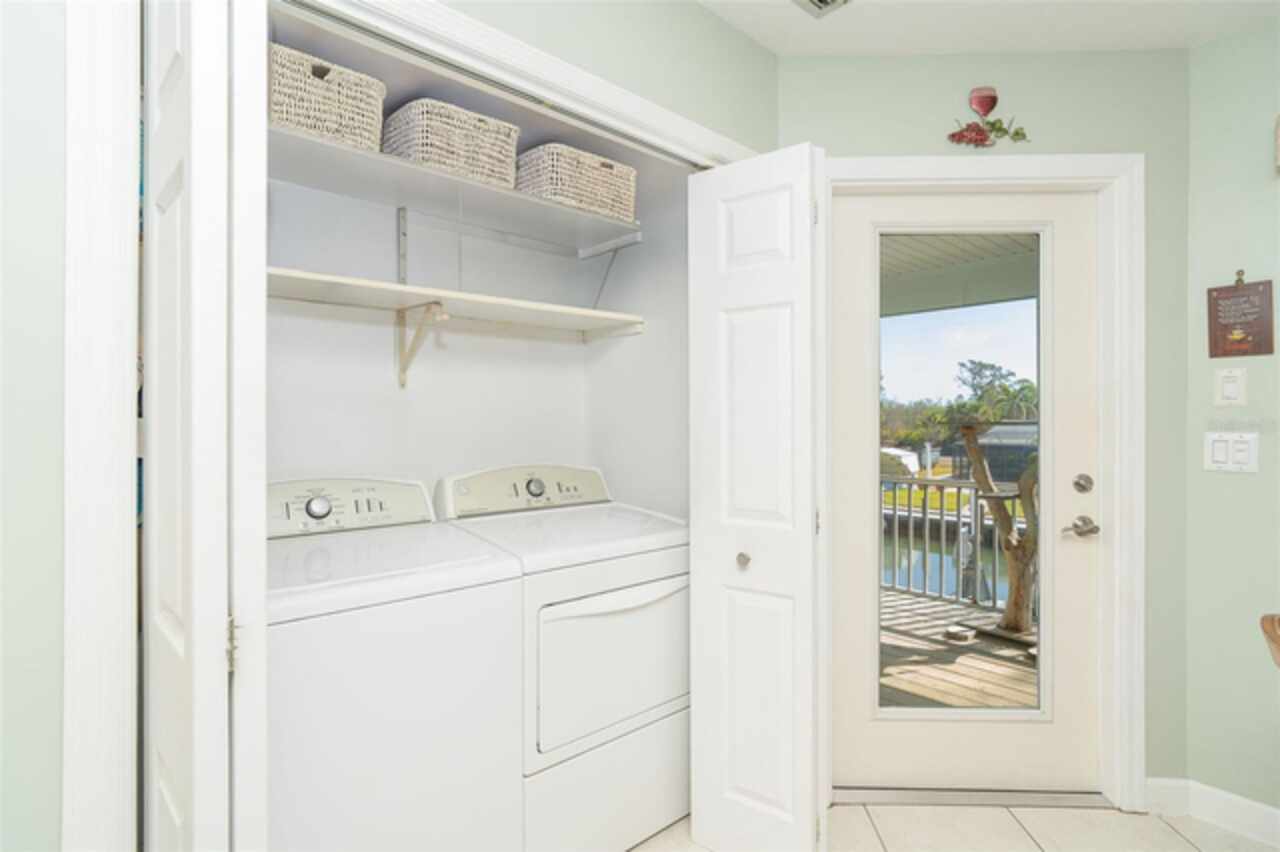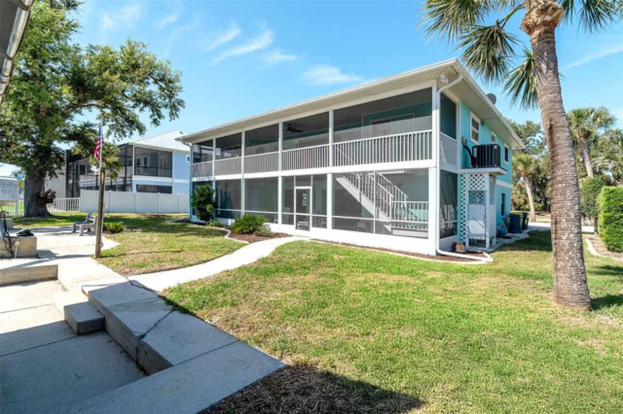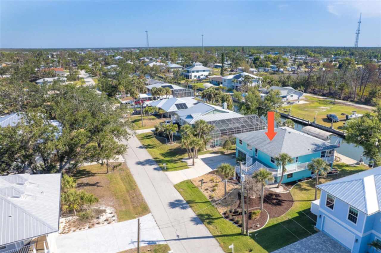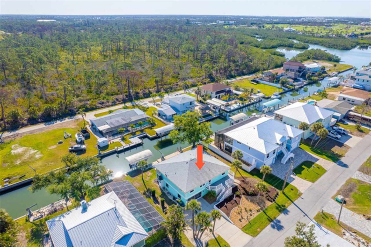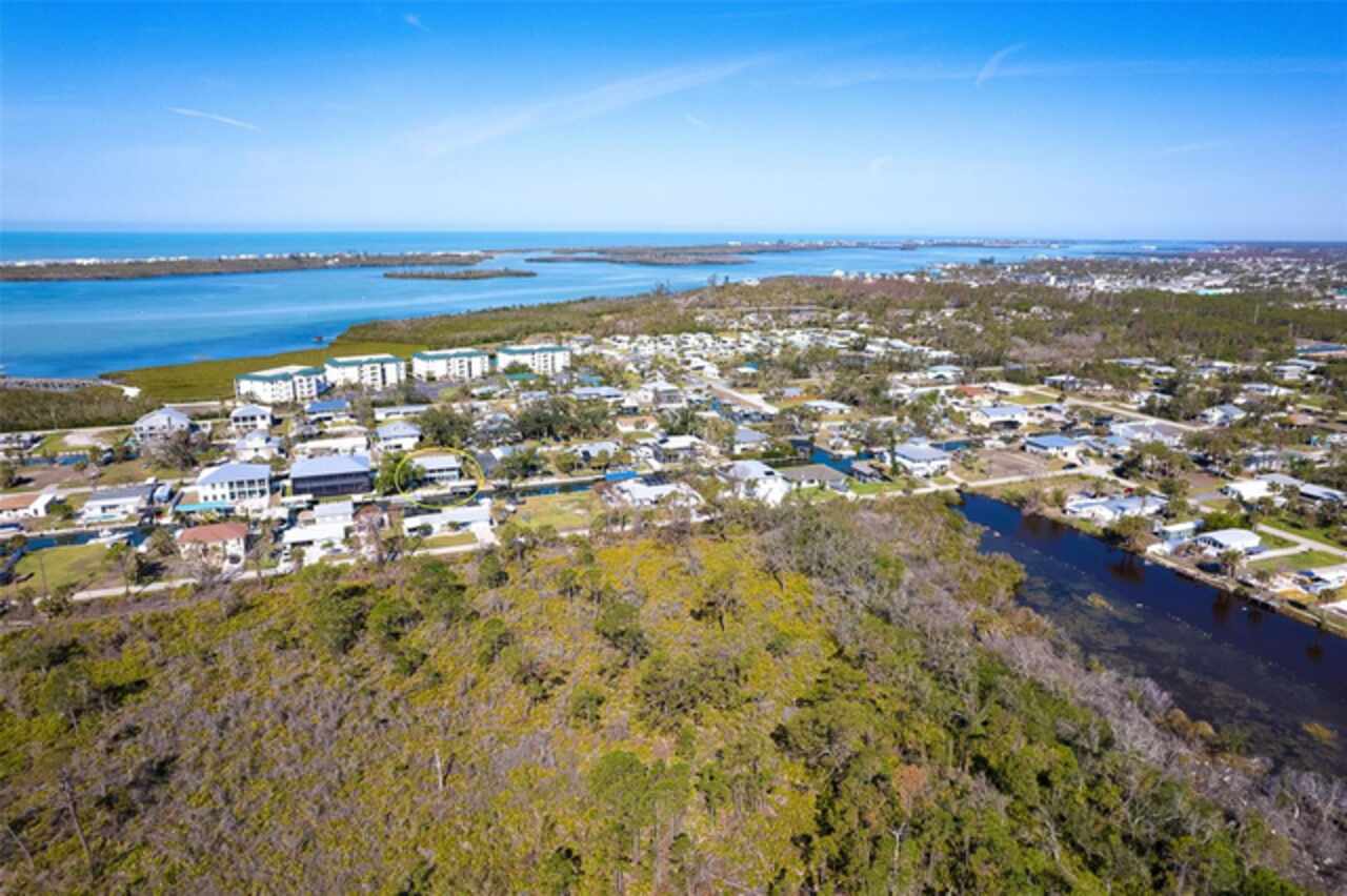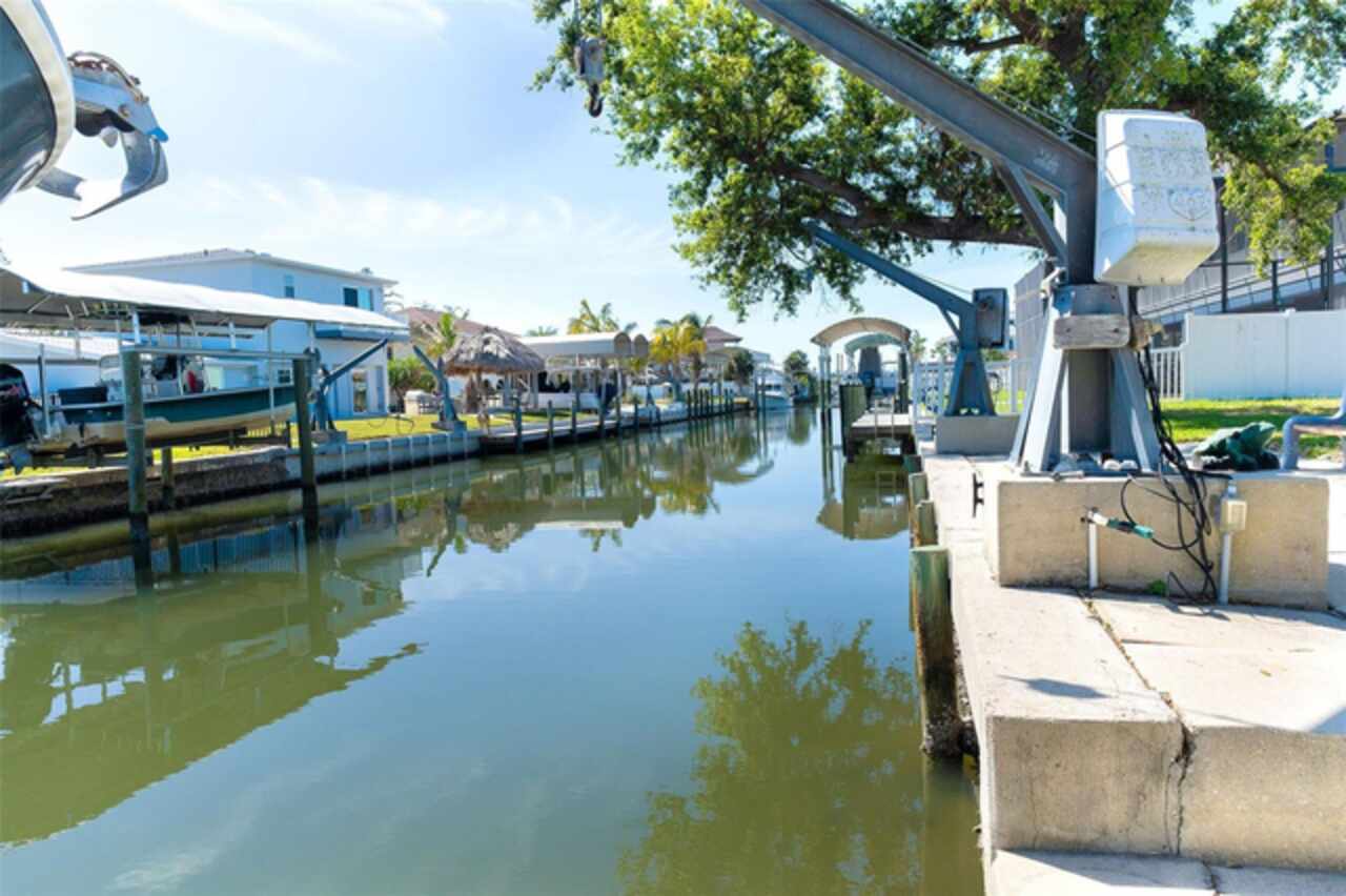 One or more photo(s) has been virtually staged. Waterfront Boatable Retreat with Deep Water Access & Stunning Views! Discover the ultimate coastal lifestyle with this elevated 3-bedroom, 2-bathroom home, perfectly situated on an oversized lot with 100 feet of water frontage. Boating enthusiasts will appreciate the sailboat-accessible deep water, a covered boat lift, a concrete seawall, and a dock with an extended concrete entertainment area—ideal for soaking up the Florida sunshine or hosting waterfront gatherings. Just minutes from the Intracoastal Waterway and the Gulf of Mexico, this property offers unparalleled convenience for those who love to explore by boat. Designed for peace of mind, this elevated home remained high and dry during storm season, with the first floor dedicated to a spacious garage and workshop area. Upstairs, the wraparound porch provides breathtaking sunrise and sunset views while offering a perfect spot to relax and enjoy the serene surroundings. Inside, the open and airy split floor plan welcomes you with a coastal-inspired ambiance and stunning water views from the spacious and open dining and great room area, where large sliding glass doors seamlessly blend indoor and outdoor living. The fully updated kitchen is a chef’s delight, featuring granite countertops, stainless steel appliances, elegant glass-front cabinets, and ample storage with three pantries. A built-in desk with water views and a door leading to the lanai adds both function and charm. The primary suite is a tranquil retreat with double built-in closets, an ensuite bath with granite countertops, a walk-in shower, and a linen closet for added convenience. The guest bedrooms are equally impressive—one featuring a Murphy bed and sliding glass doors to the lanai, allowing for flexible use as a bedroom or home office, while the second oversized guest room includes a built-in closet and shares a guest bath with a tub/shower combo, granite countertops, and a linen closet. Enjoy dual screened-in lanais, with one upstairs and another on the lower level, providing multiple spaces to savor the waterfront views. Additional highlights include a 2023 roof, 2023 A/C unit, 2024 hot water heater, Central Vacuum system, and 2024 refrigerator and microwave. The elevated A/C system is positioned at the top floor level for extra protection and peace of mind. Beautifully landscaped grounds and a screened garage add to the home’s appeal. This exceptional property offers a rare opportunity to own a storm-resilient waterfront home that combines luxury, functionality, and breathtaking views. Schedule your private tour today and make this waterfront oasis your own!