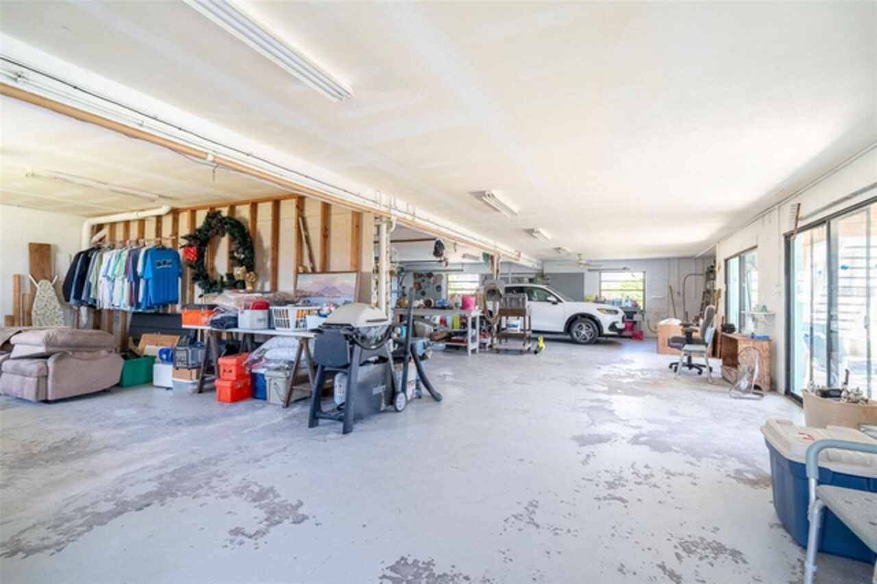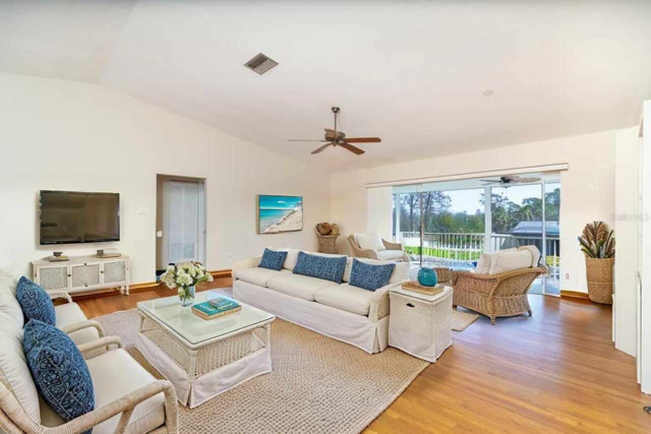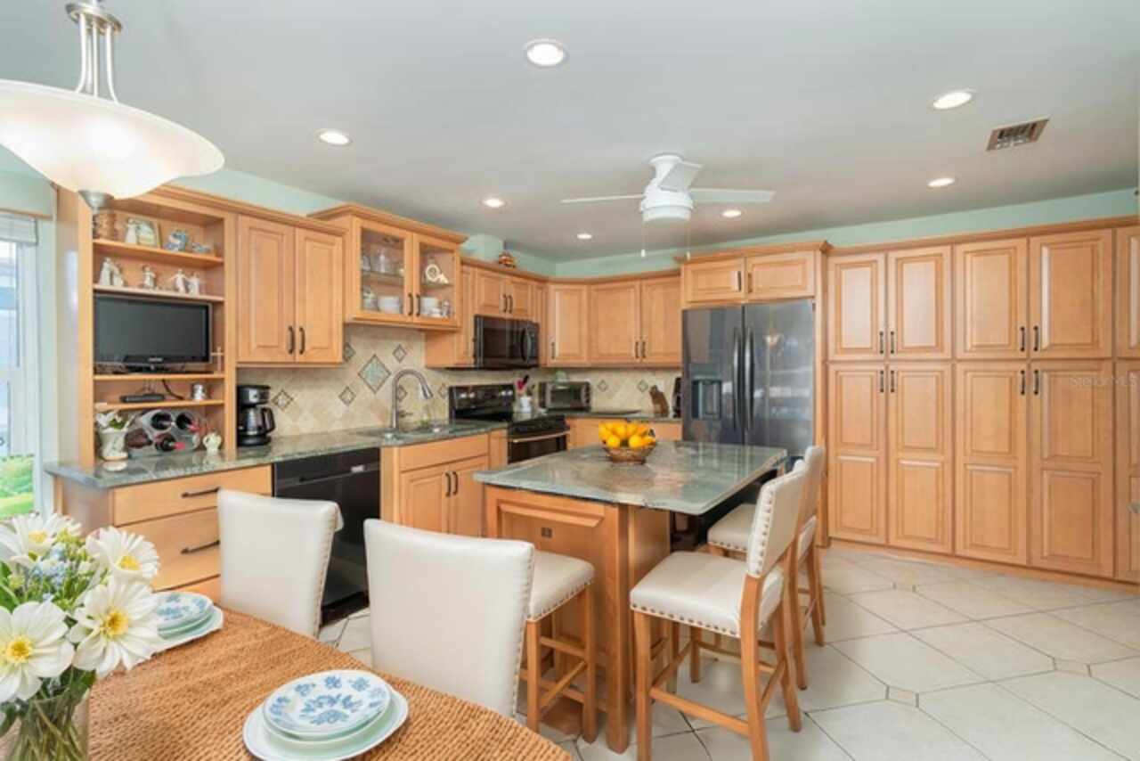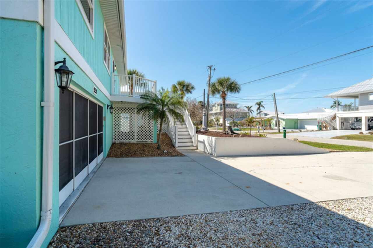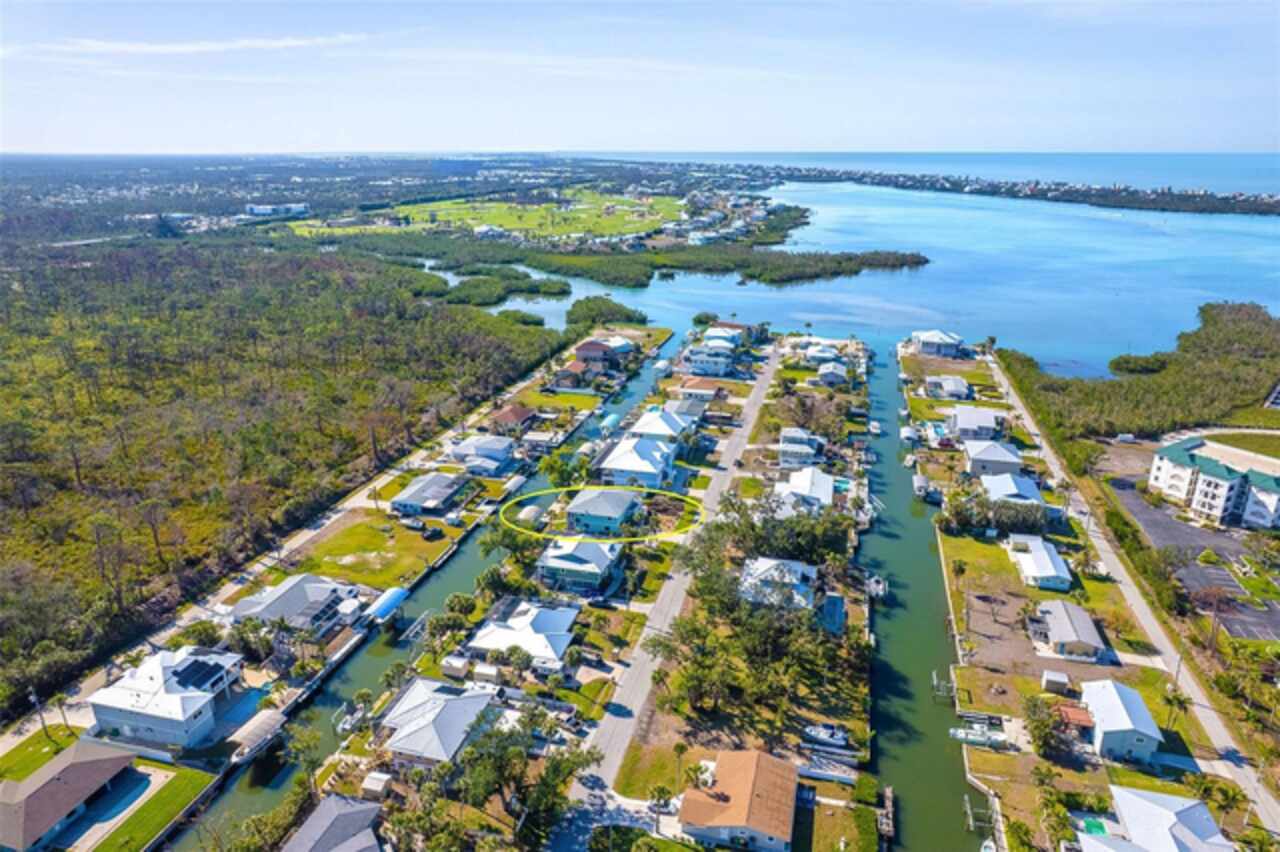 One or more photo(s) has been virtually staged. Waterfront Boatable Retreat with Deep Water Access & Stunning Views! Discover the ultimate coastal lifestyle with this elevated 3-bedroom, 2-bathroom home, perfectly situated on an oversized lot with 100 feet of water frontage. Boating enthusiasts will appreciate the sailboat-accessible deep water, a covered boat lift, a concrete seawall, and a dock with an extended concrete entertainment area—ideal for soaking up the Florida sunshine or hosting waterfront gatherings. Just minutes from the Intracoastal Waterway and the Gulf of Mexico, this property offers unparalleled convenience for those who love to explore by boat. Designed for peace of mind, this elevated home remained high and dry during storm season, with the first floor dedicated to a spacious garage and workshop area. Upstairs, the wraparound porch provides breathtaking sunrise and sunset views while offering a perfect spot to relax and enjoy the serene surroundings. Inside, the open and airy split floor plan welcomes you with a coastal-inspired ambiance and stunning water views from the spacious and open dining and great room area, where large sliding glass doors seamlessly blend indoor and outdoor living. The fully updated kitchen is a chef’s delight, featuring granite countertops, stainless steel appliances, elegant glass-front cabinets, and ample storage with three pantries. A built-in desk with water views and a door leading to the lanai adds both function and charm. The primary suite is a tranquil retreat with double built-in closets, an ensuite bath with granite countertops, a walk-in shower, and a linen closet for added convenience. The guest bedrooms are equally impressive—one featuring a Murphy bed and sliding glass doors to the lanai, allowing for flexible use as a bedroom or home office, while the second oversized guest room includes a built-in closet and shares a guest bath with a tub/shower combo, granite countertops, and a linen closet. Enjoy dual screened-in lanais, with one upstairs and another on the lower level, providing multiple spaces to savor the waterfront views. Additional highlights include a 2023 roof, 2023 A/C unit, 2024 hot water heater, Central Vacuum system, and 2024 refrigerator and microwave. The elevated A/C system is positioned at the top floor level for extra protection and peace of mind. Beautifully landscaped grounds and a screened garage add to the home’s appeal. This exceptional property offers a rare opportunity to own a storm-resilient waterfront home that combines luxury, functionality, and breathtaking views. Schedule your private tour today and make this waterfront oasis your own!