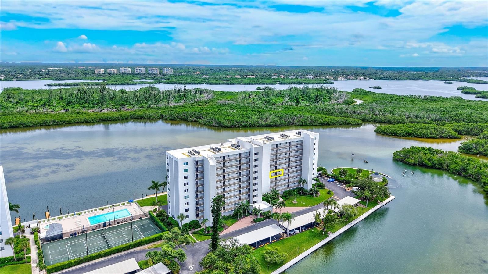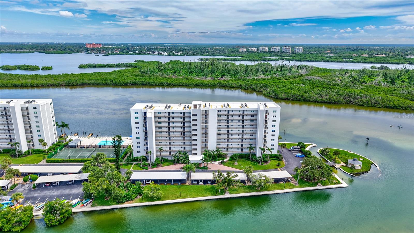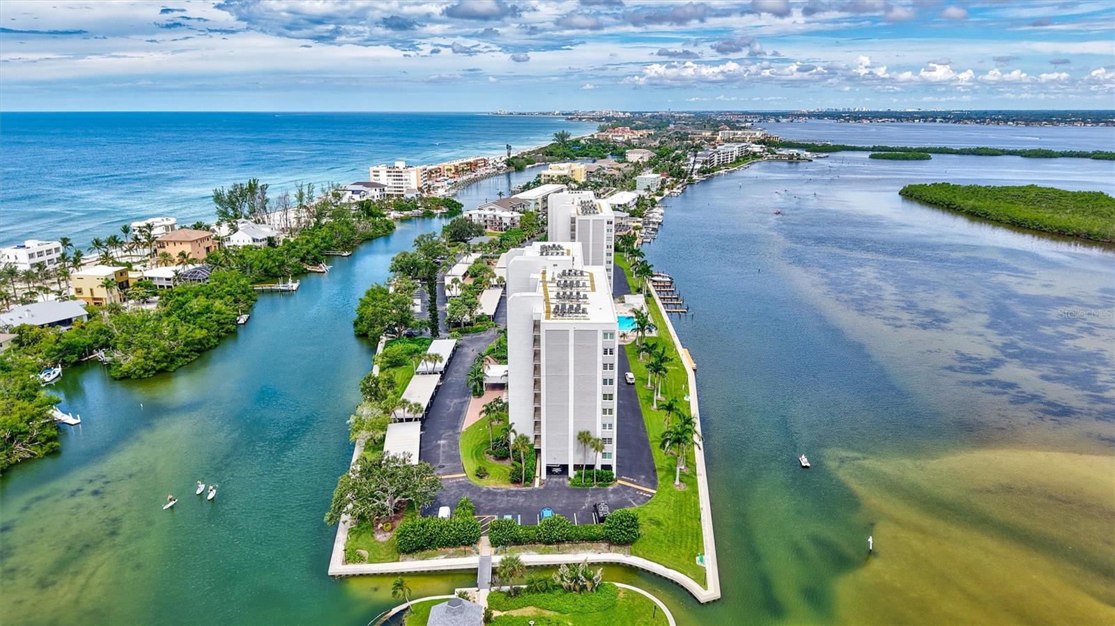 Gated community w/ 5.4 Acres of land at Southern Tip of Siesta Key wrapped around by Intercoastal and Canal waterways! This condo has 180 degree views of the Gulf of America to the West (Sunset) & Eastern Intercoastal & Sarasota Bay Waters (Sunrise)!