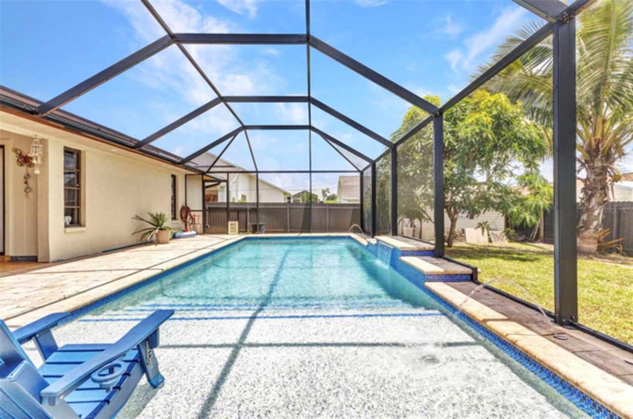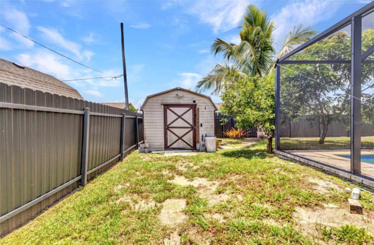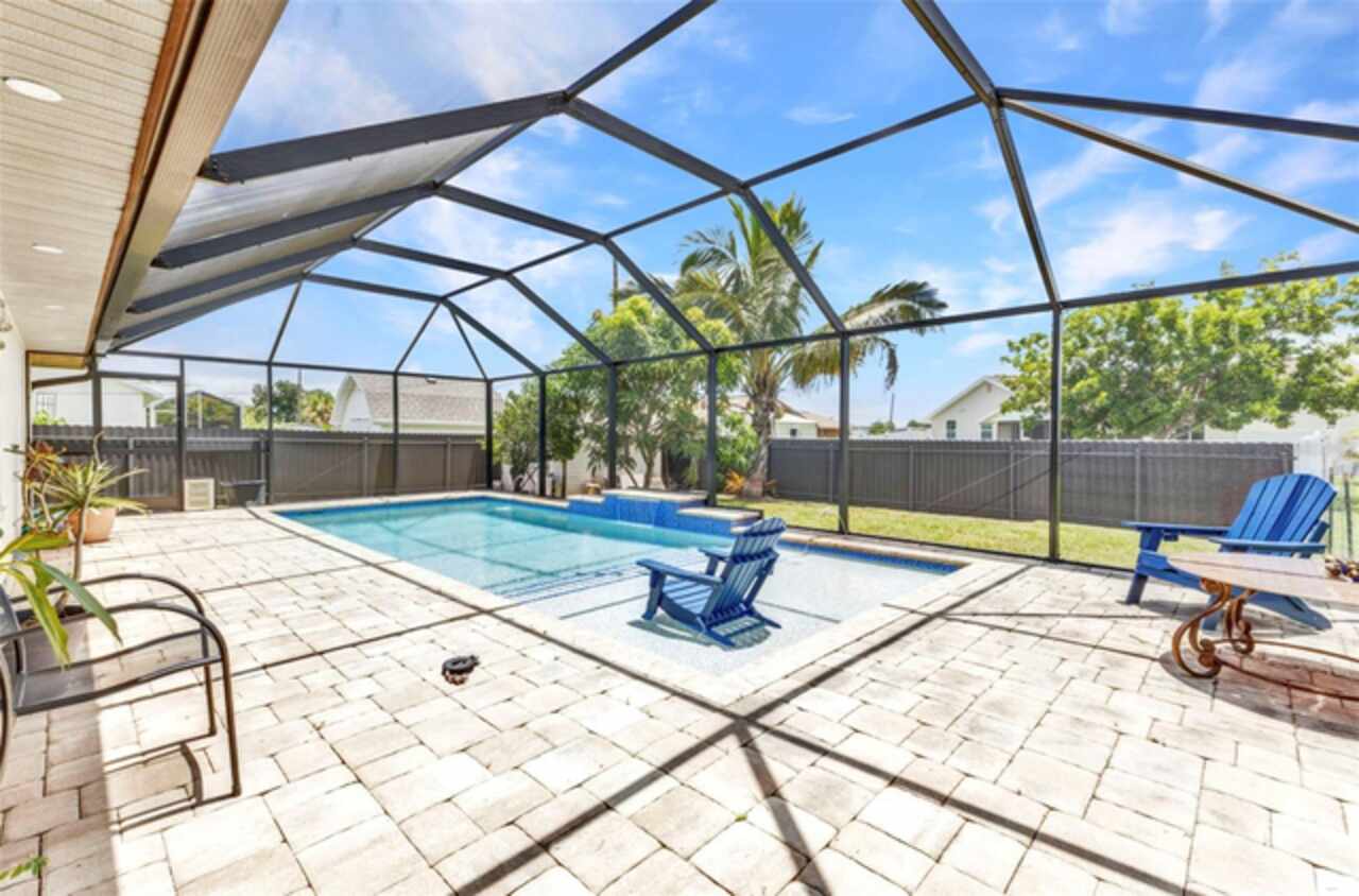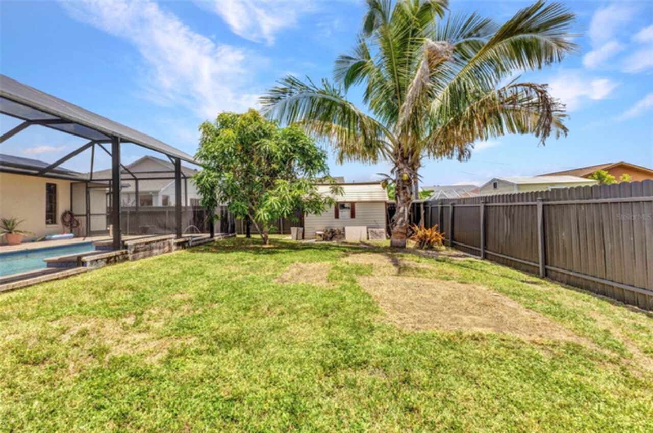 REDUCED!! Beautifully Updated X or No Flood zone Home with gorgeous Pool, also upgraded with Solar Panels for efficiency and energy savings & Whole-House Water Filtration is a plus. Electric bill summer seller said around $20/ mo. In winter time around $50/ mo. This charming and tastefully updated home offers both style and efficiency. Inside, you'll find ceramic tile flooring throughout, and a remodeled kitchen featuring solid wood cabinets and granite countertops. The guest bathroom has been thoughtfully upgraded with a glass shower door, rainfall showerhead, new ceramic tile, and modern cabinetry. Step outside to your private backyard oasis, complete with a sparkling pool installed in 2020, extended decking for entertaining, and full fencing for privacy. The corner lot is perfect to park a boat, truck, or trailer, plus a shed for extra storage. Enjoy low energy costs thanks to newly installed solar panels—the seller reports summer electric bills as low as $20, and just $50 during winter months. A whole-house water filtration system has also been installed, offering clean and purified water throughout the home. A versatile bonus room provides space for a potential third bedroom, home office, or a climate-controlled workshop. This move-in ready home blends modern comfort, energy efficiency, and outdoor living—perfect for years of relaxation and enjoyment. Enjoy fruit trees like matured mangoe and coconut trees and orange tree!