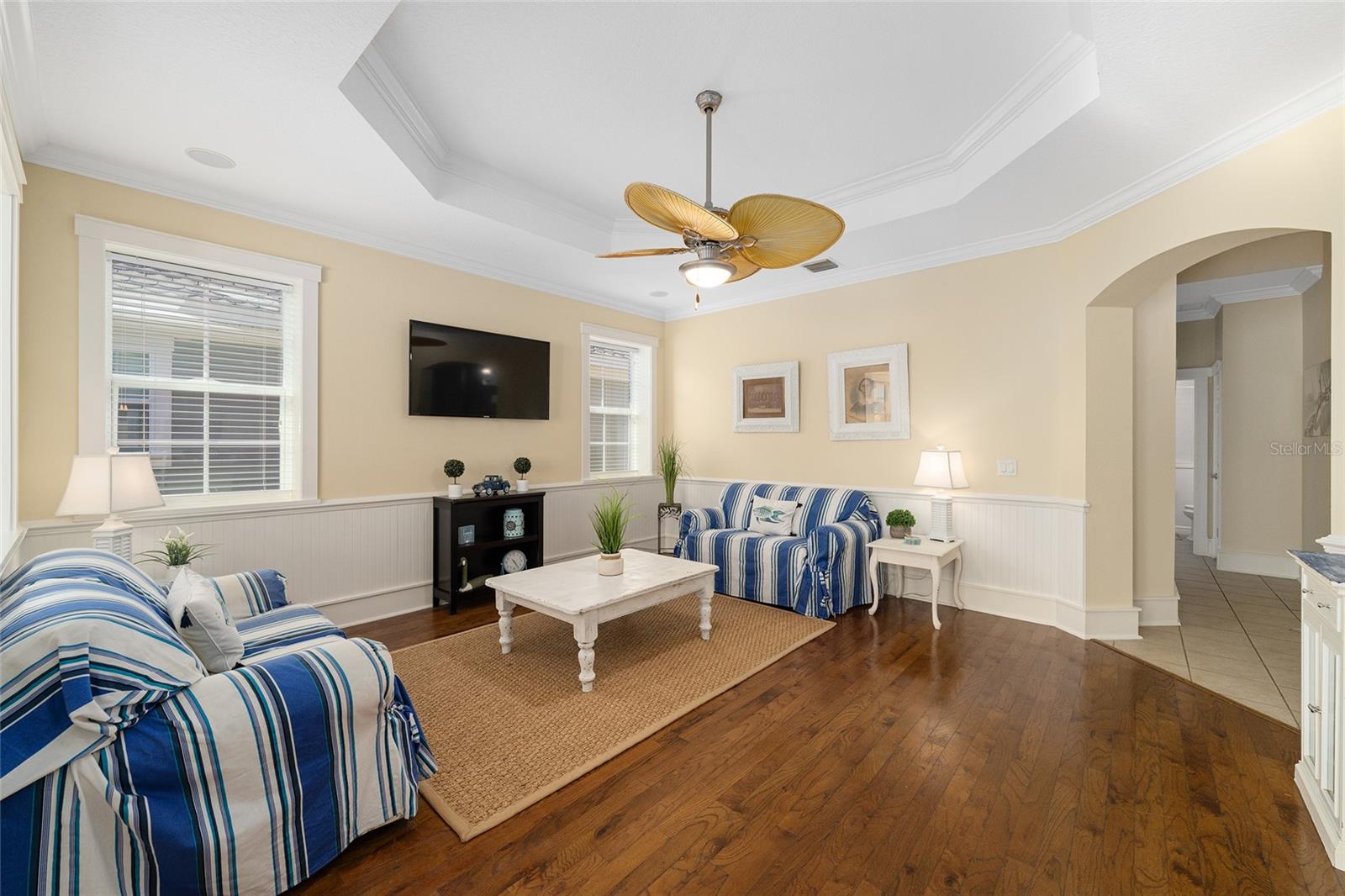 Under contract-accepting backup offers. **RARE FIND** This charming TURN-KEY 3-bedroom, 2-bathroom Camden model comes with a spacious 2-car garage and is nestled in the highly desirable LAKE SHORE COTTAGES Village, right next to the lively LAKE SUMTER LANDING! Enjoy a hassle-free exterior with low maintenance and delightful curb appeal thanks to HARDIE PLANK SIDING, plus a lovely SCREENED front porch to relax and unwind. Inside, you'll love the bright and airy open floor plan featuring stunning HARDWOOD flooring throughout the living room, kitchen, and Florida room. The kitchen is a chef's dream with GRANITE countertops, a GAS stove, a handy closet PANTRY, beautiful white cabinets with pull-out shelves, a cozy breakfast bar, and sleek SS appliances. The primary suite offers a generous walk-in closet, dual vanity sinks, a spacious walk-in shower, and a private water closet for extra comfort. The two guest bedrooms at the front of the home include built-in closets, and the guest bath provides plenty of space for visitors to feel at home. Additional wonderful features include an HVAC system (2025), convenient inside laundry, elegant CROWN MOLDING, move-in readiness, ROOF (2022), HWH (2023), and it’s situated directly across from the pool—plus, there’s NO BOND! This is a fantastic opportunity to become part of this highly sought-after community. Whether you're looking for a seasonal retreat, a full-time residence, or a smart investment rental, this home has so much to offer. Plus, it’s within walking or golf-cart distance to Lake Sumter Landing Market Square, where you can enjoy lively shopping, dining, live entertainment, and movie nights—making every day feel like a getaway!