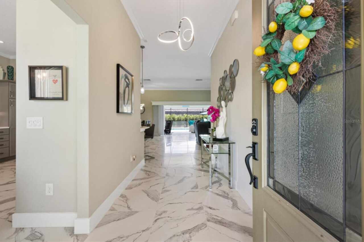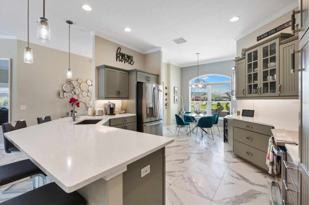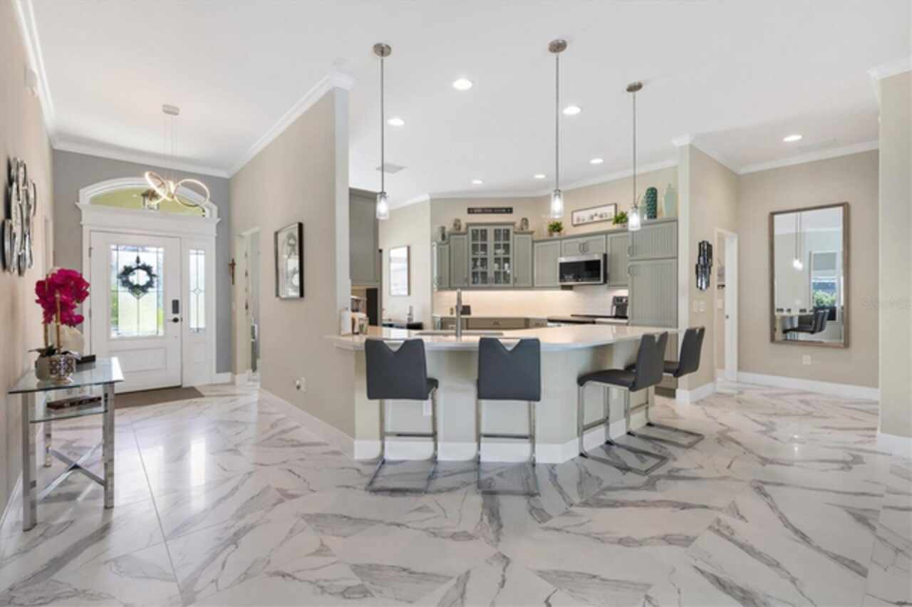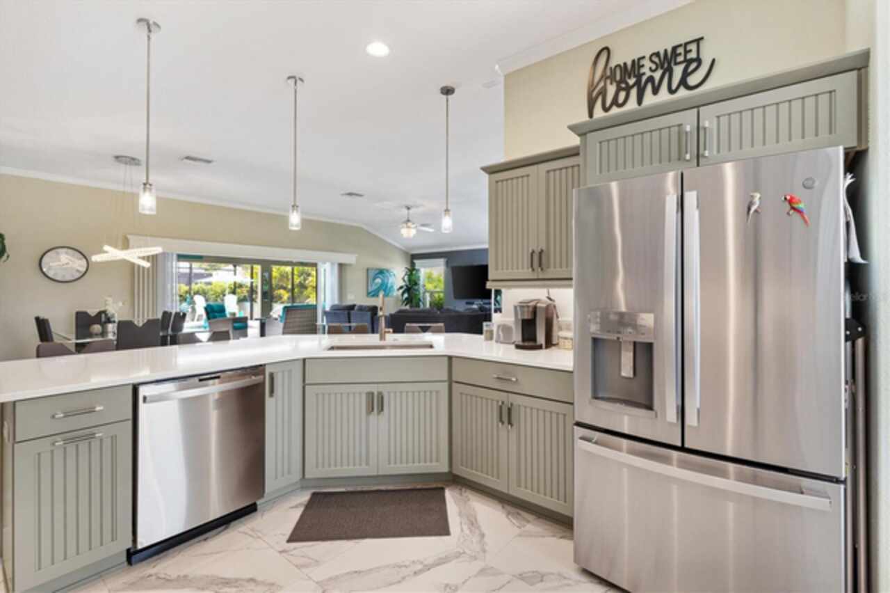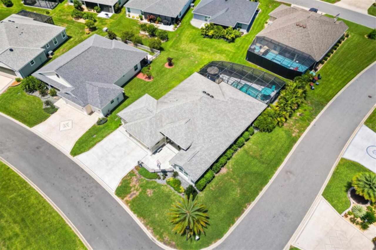 Price Reduction! Welcome to 987 Frederick Terrace, an exquisite Three Bedroom, Two Bathroom, Pool home, built in 2020, with approximately 2060 Square Feet of Living Space, located in the Village of Bradford in The Villages. This beautiful modern Designer Home features a split floor plan, and a spacious and open Living Room/Dining Room, leading to a truly spectacular private Outdoor Oasis. There is an inviting Heated Pool and Spa in this Extended Outdoor Space, with an Enclosed Screened Lanai, surrounded by Lush Tropical Landscaping, making the outdoor living space very private., with relaxing lounge areas, perfect for entertaining family and friends! The Primary Bedroom has a Tray Ceiling, with Two Custom Walk-In Closets, and an En Suite Bathroom with a Tiled Floor, private Toilet Room and a Roman Shower. There is a privacy pocket door leading to the Guest Bedrooms, which share an Upgraded Bathroom with Maple Cabinets, Quartz Counters, Tiled Floor and Tiled Bath/Shower Enclosure. The Kitchen has Custom Stacked Aloe Maple Cabinets, with elegant Quartz Countertops and Tile Backsplash, an Eating Area, Stainless Steel Appliances, and a Pantry Closet. Additional features include Crown Molding, Window Valances, gorgeous Tile Floors, an Indoor Laundry Room, a large Extended Garage and Golf Cart Garage with Epoxy Floors, an attic with pull down stairs, a spacious, beautifully Landscaped Corner Lot on a Quiet Interior Street, Painted Driveway, Low-E Double Pane Windows, Rounded Corner walls, and Smooth Skip Trowel Ceilings. This home is conveniently located near Shopping, Medical Facilities, Village's Entertainment and Restaurants. It is very close to The Bradford Recreation Area, as well as both the Everglades and the Rohan Regional Recreation Centers. There is also the Marsh View Pitch and Putt and the Lowlands Executive Golf Course to practice your golf game!! Come take a look at this wonderful custom home as it will not be on the market for very long!