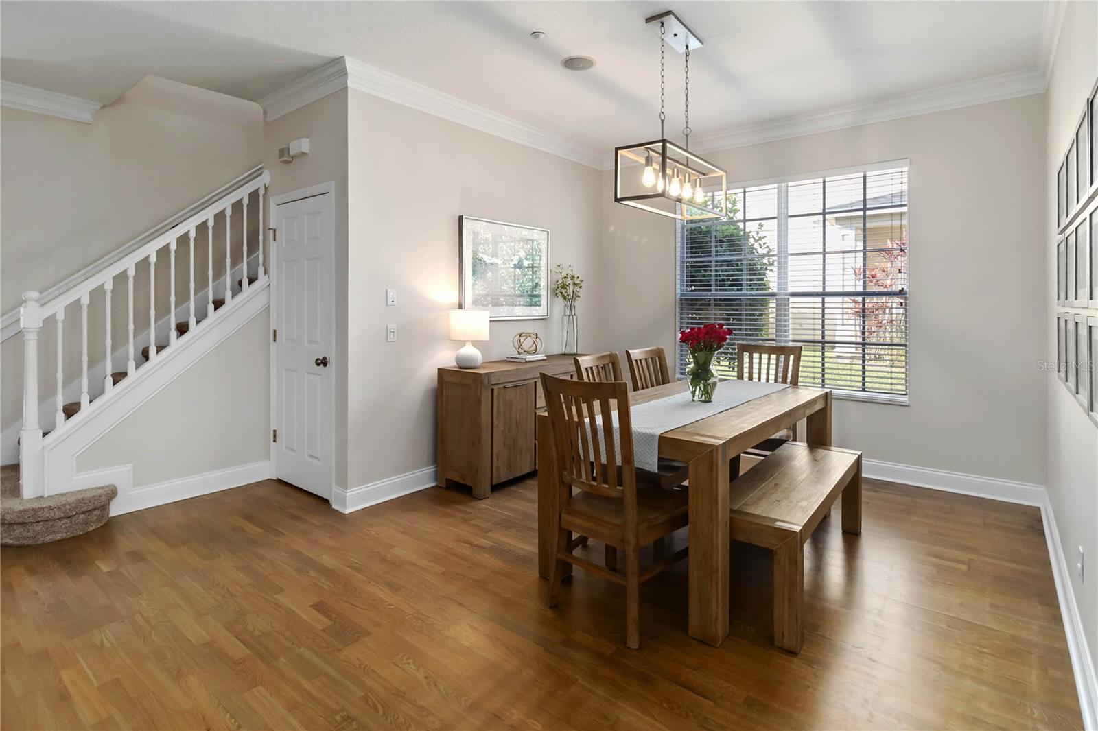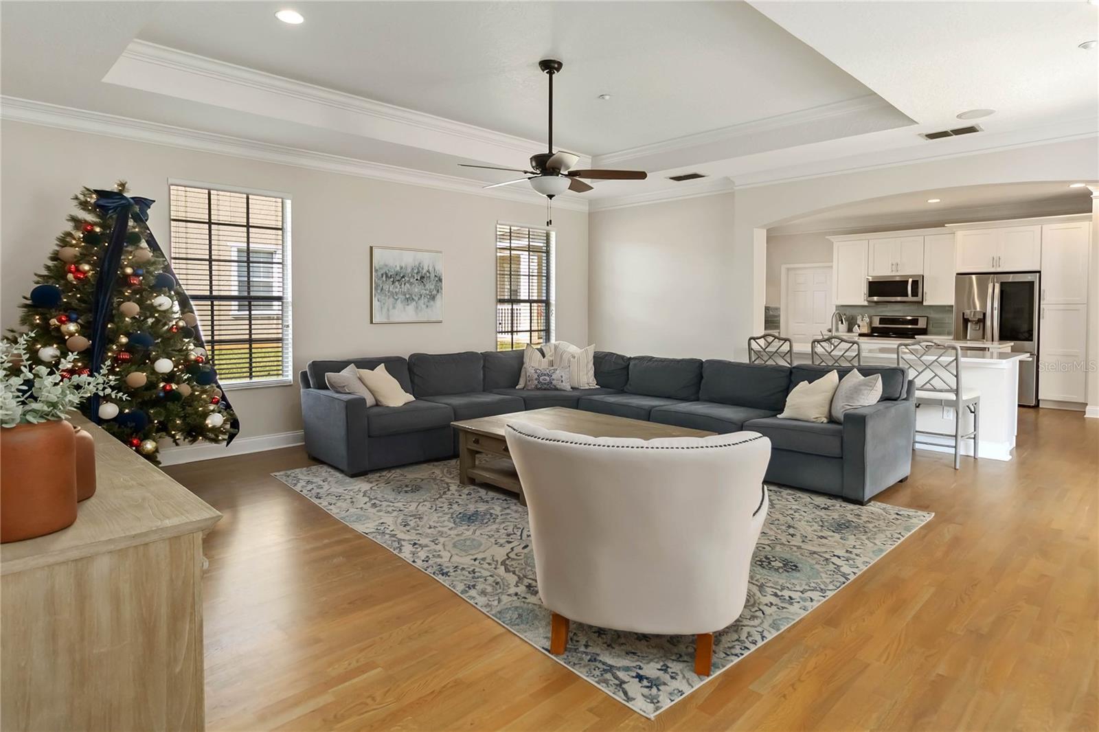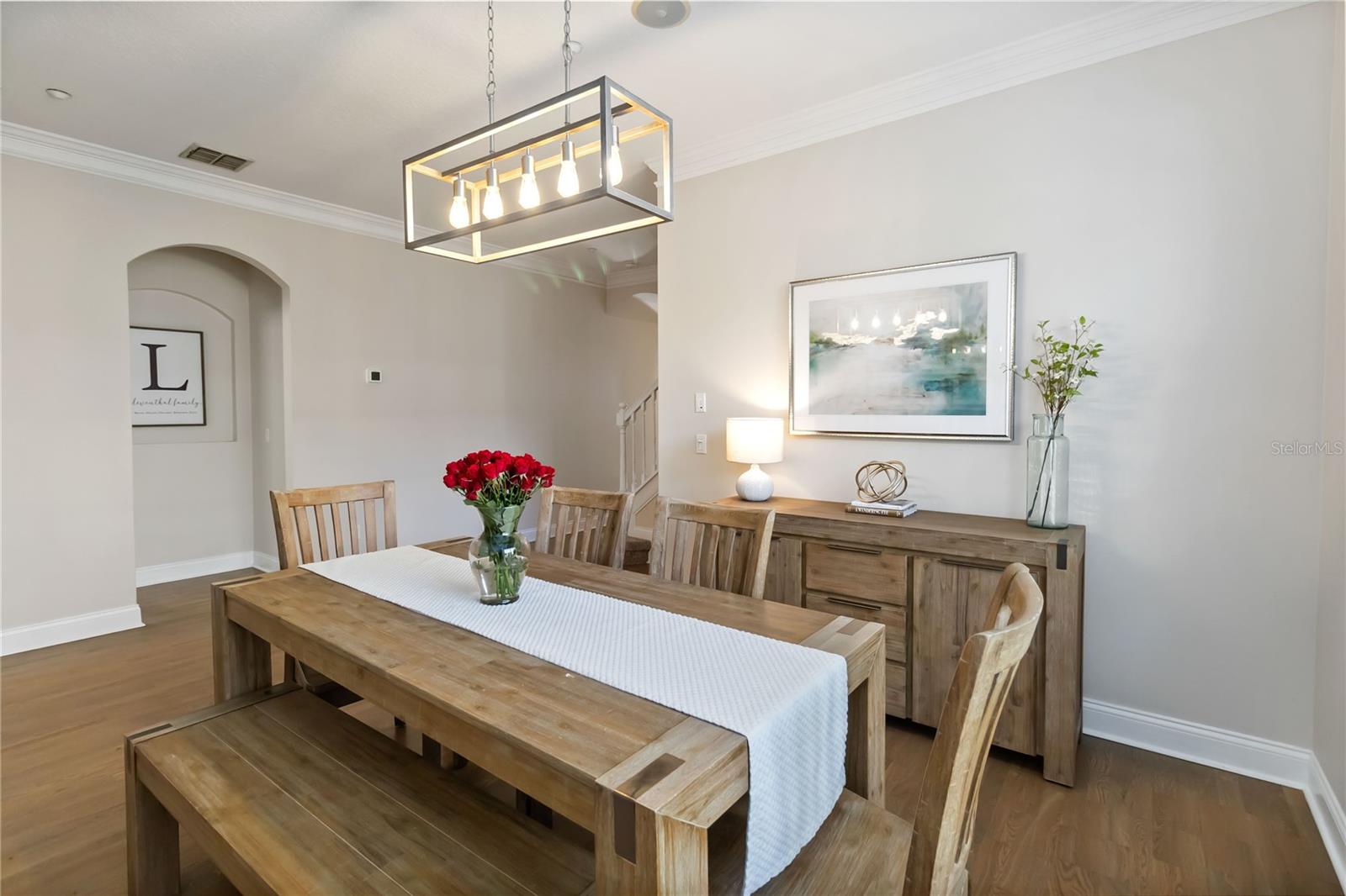 Ceiling Fans(s), Chair Rail, Crown Molding, Eat-in Kitchen, High Ceilings, Kitchen/Family Room Combo, Living Room/Dining Room Combo, Open Floorplan, PrimaryBedroom Upstairs, Solid Surface Counters, Solid Wood Cabinets, Split Bedroom, Stone Counters, Walk-In Closet(s)