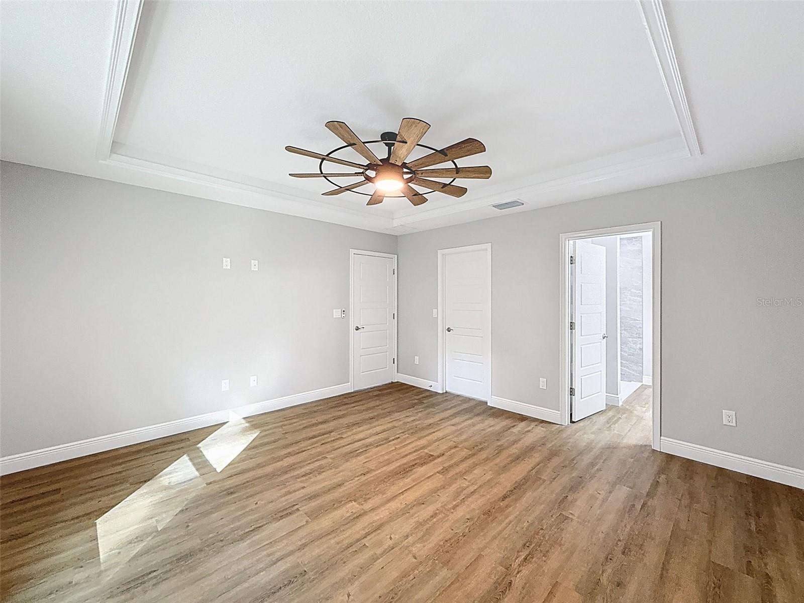 Cathedral Ceiling(s), Ceiling Fans(s), Open Floorplan, Primary Bedroom Main Floor, Solid Surface Counters, Split Bedroom, Thermostat, Tray Ceiling(s), Vaulted Ceiling(s), Walk-In Closet(s)