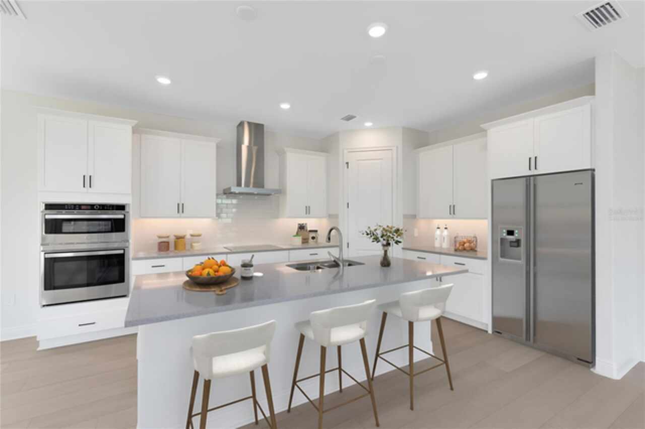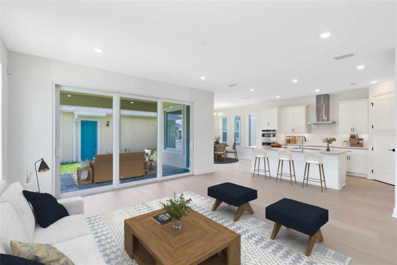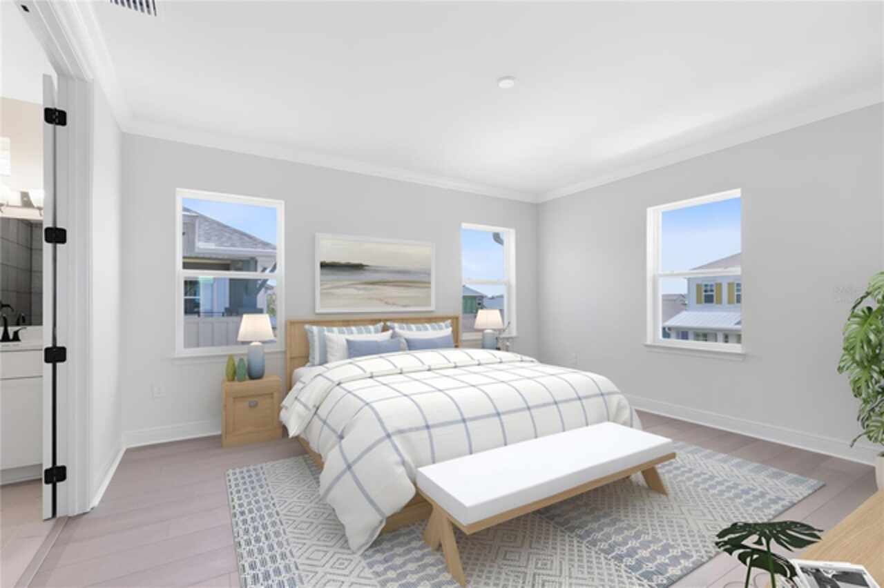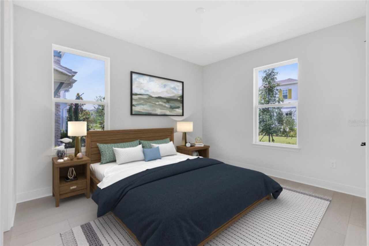 One or more photo(s) has been virtually staged. This custom brand new, never-lived-in Laureate Park home sits on a prime corner lot facing a landscaped mew and walking path. Built in 2025, it features coastal-style curb appeal with stone columns, a covered front porch, and bold teal double doors that make a statement from the start. Inside, you’re welcomed by light luxury vinyl floors, oversized windows, and an open-concept layout filled with natural light. The kitchen is equipped with stone countertops, under-cabinet lighting, built-in stainless steel appliances, a sleek vent hood, and a walk-in pantry. It opens to spacious dining and living areas, perfect for entertaining. The main floor also includes two guest bedrooms with a Jack & Jill bath, a private office with French doors, and a laundry room. Upstairs, a generous loft provides extra space for a second living area, media room, or playroom. The primary suite offers peaceful views and includes one walk-in closet and a spa-like bath with dual sinks and a glass-enclosed shower. Two additional bedrooms and a full bath complete the second floor. The covered rear patio leads to a detached 2.5-car garage with extra storage space, a paver walkway, and low-maintenance landscaping. Laureate Park isn’t just a neighborhood—it’s a vibrant lifestyle. Enjoy the Aquatic Center, resort-style pools, LP Fit gym, and 44+ miles of trails. Located in prime Lake Nona, minutes from Medical City, the VA hospital, Nemours, dining, and shopping. Close to major highways, Orlando International Airport, and the USTA National Campus. Easy access to Orlando’s top theme parks and beautiful Florida beaches. This home blends space, luxury, and community in a sought-after location. Experience elevated living—schedule your private tour today!